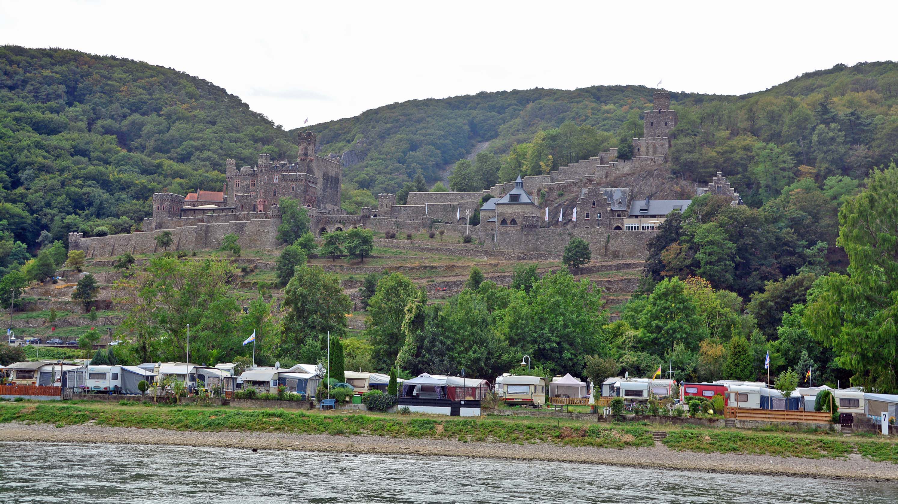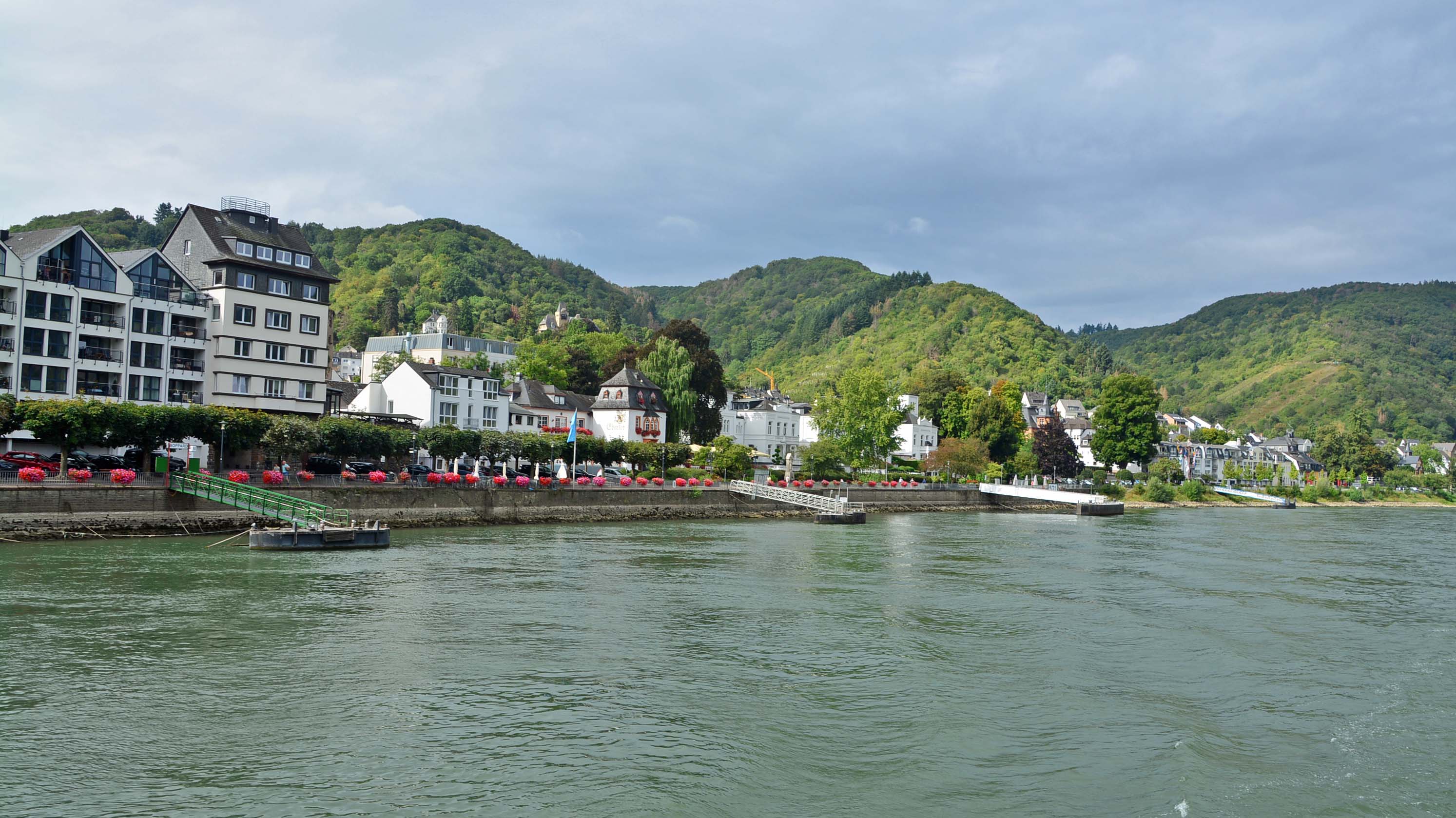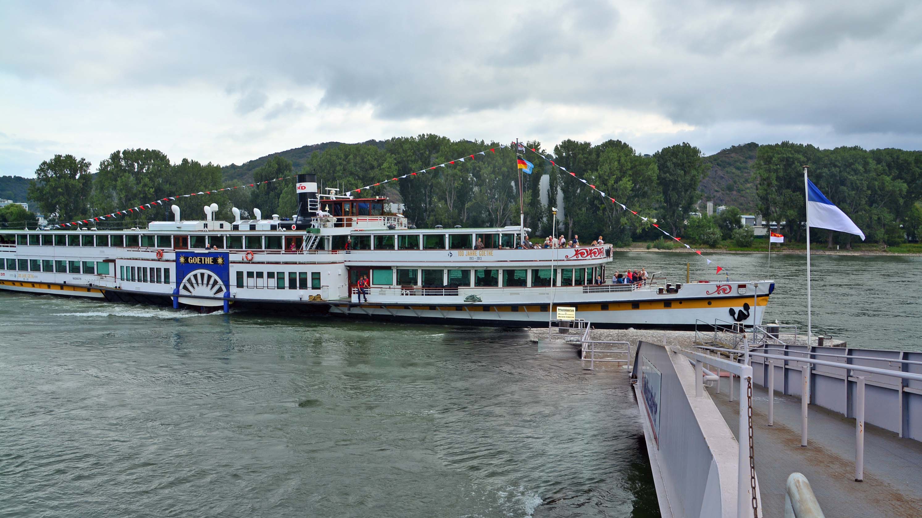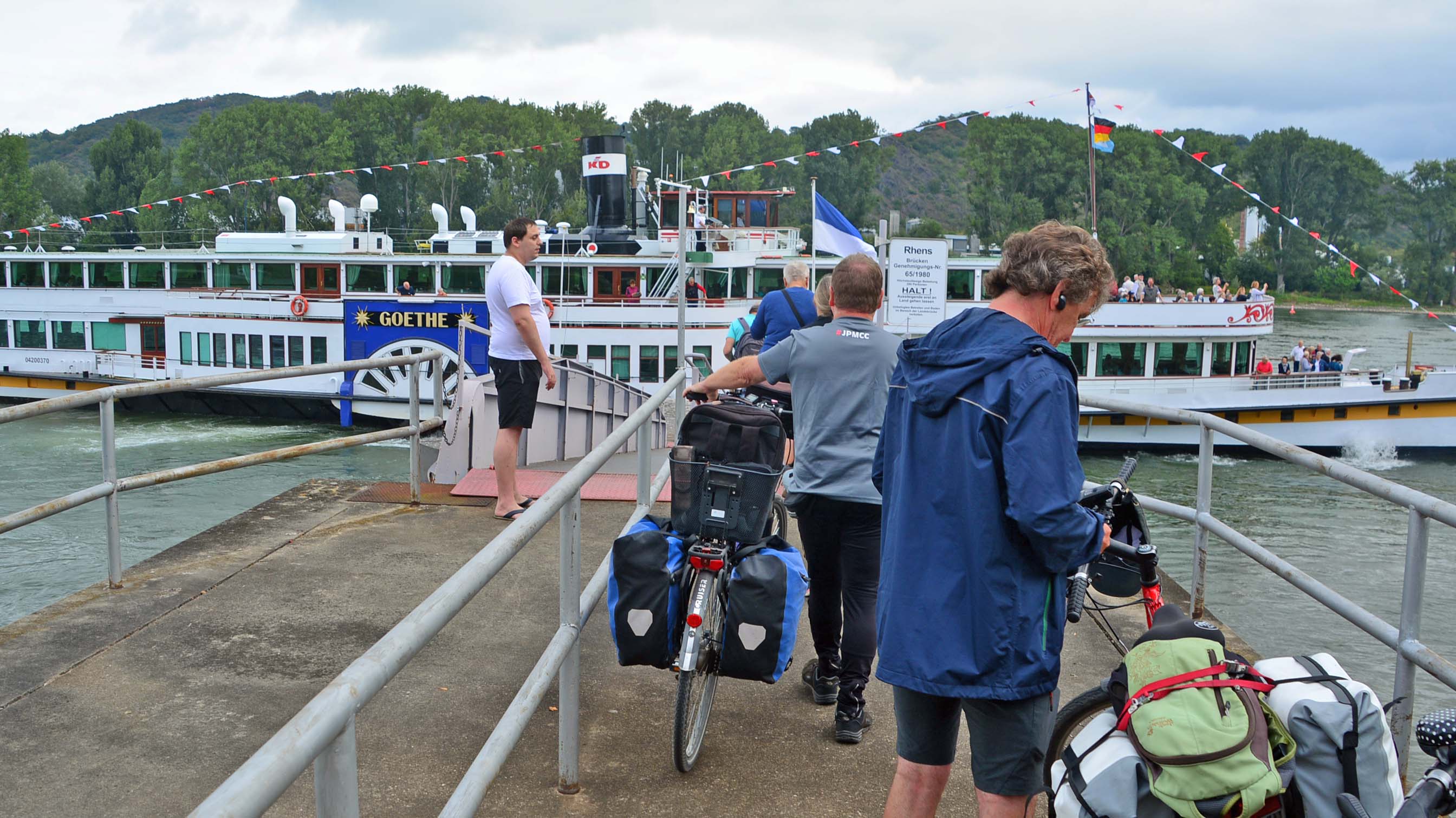 Nach dem Frühstück fahren wir zwei Kilometer Richtung Bedarfshaltestelle der Köln-Düsseldorfer Schifffahrtsgesellschaft. Wir lösen unsere Fahrtickets und warten auf den Schaufelraddampfer ‚Goethe‘, die uns an unseren Ausgangspunkt der Radtour zurückbringt. Das Seniorenticket kostet stolze 33,90 €. Dafür sind wir aber auch 5 ½ Stunden auf dem Rheinwasser. Die ‚Goethe‘ kommt superpünktlich, wir bekommen einen Parkplatz für die Räder zugewiesen und gehen sofort an Deck, um die vorbeiziehende Rheinlandschaft nochmal in aller Ruhe zu genießen. Wir fahren am Campingplatz des Womo-Fahrers vorbei, der zusieht, wie wir an ihm vorbeischippern. Es ist wolkig mit wenigen sonnigen Abschnitten und kühler. Wir lassen die zahlreichen Burgen und gemütlichen Städte an uns vorbeiziehen.