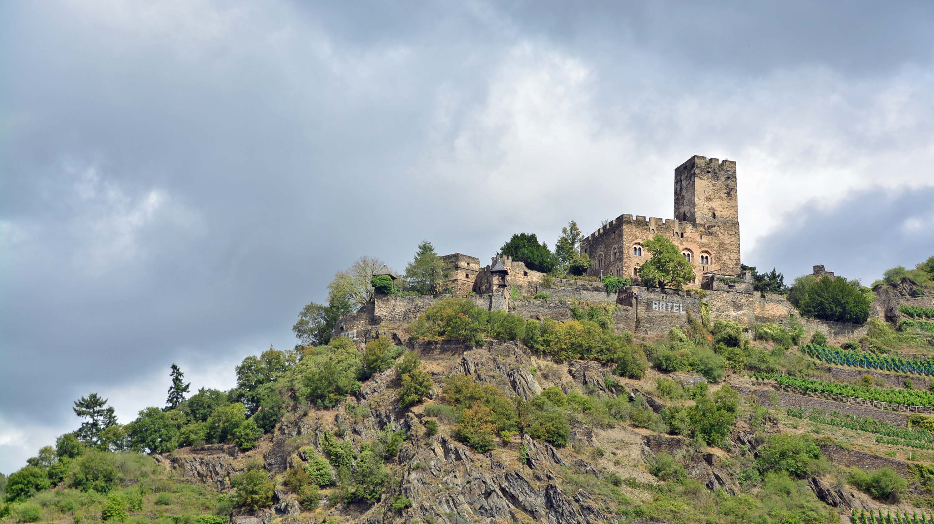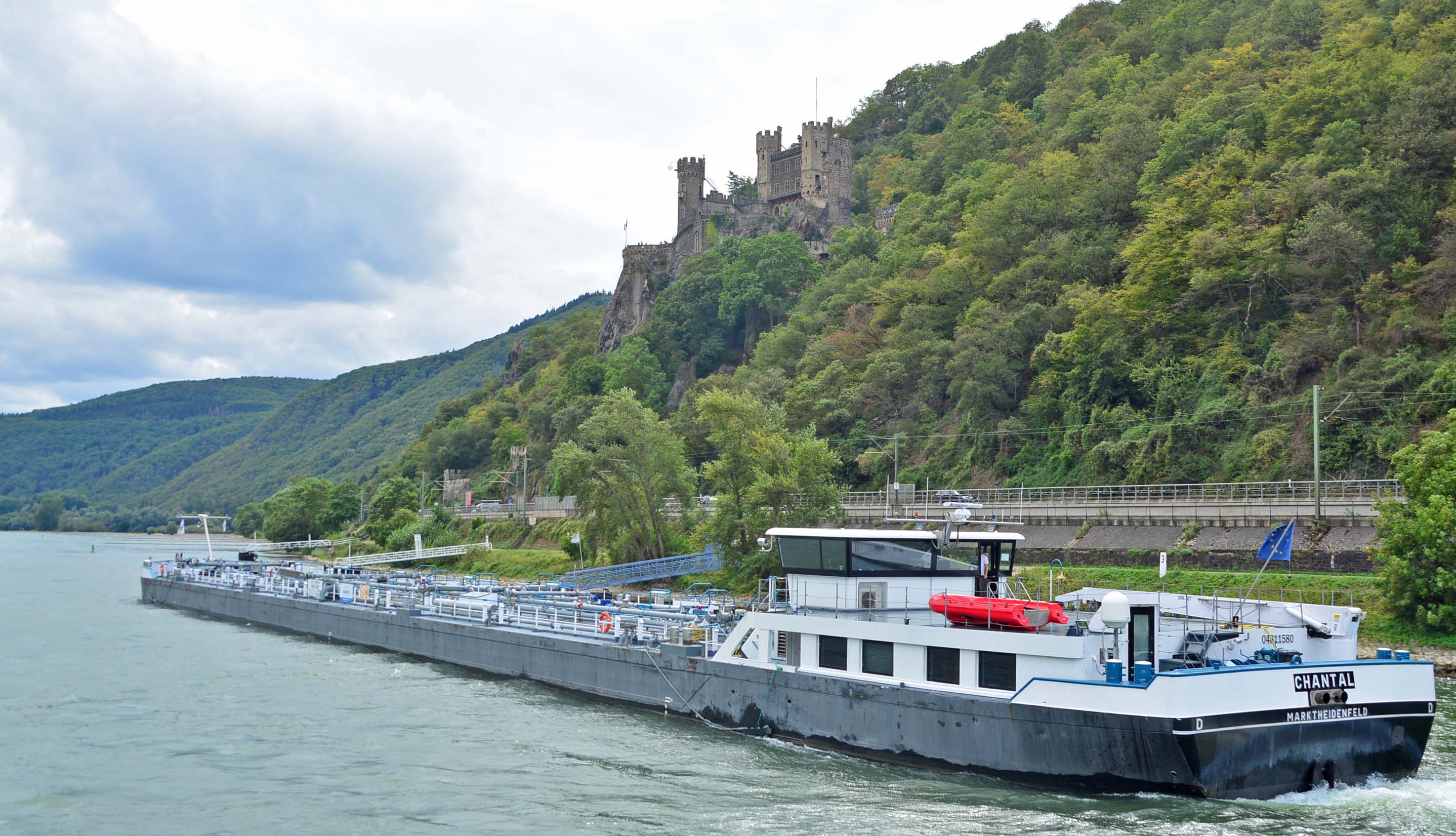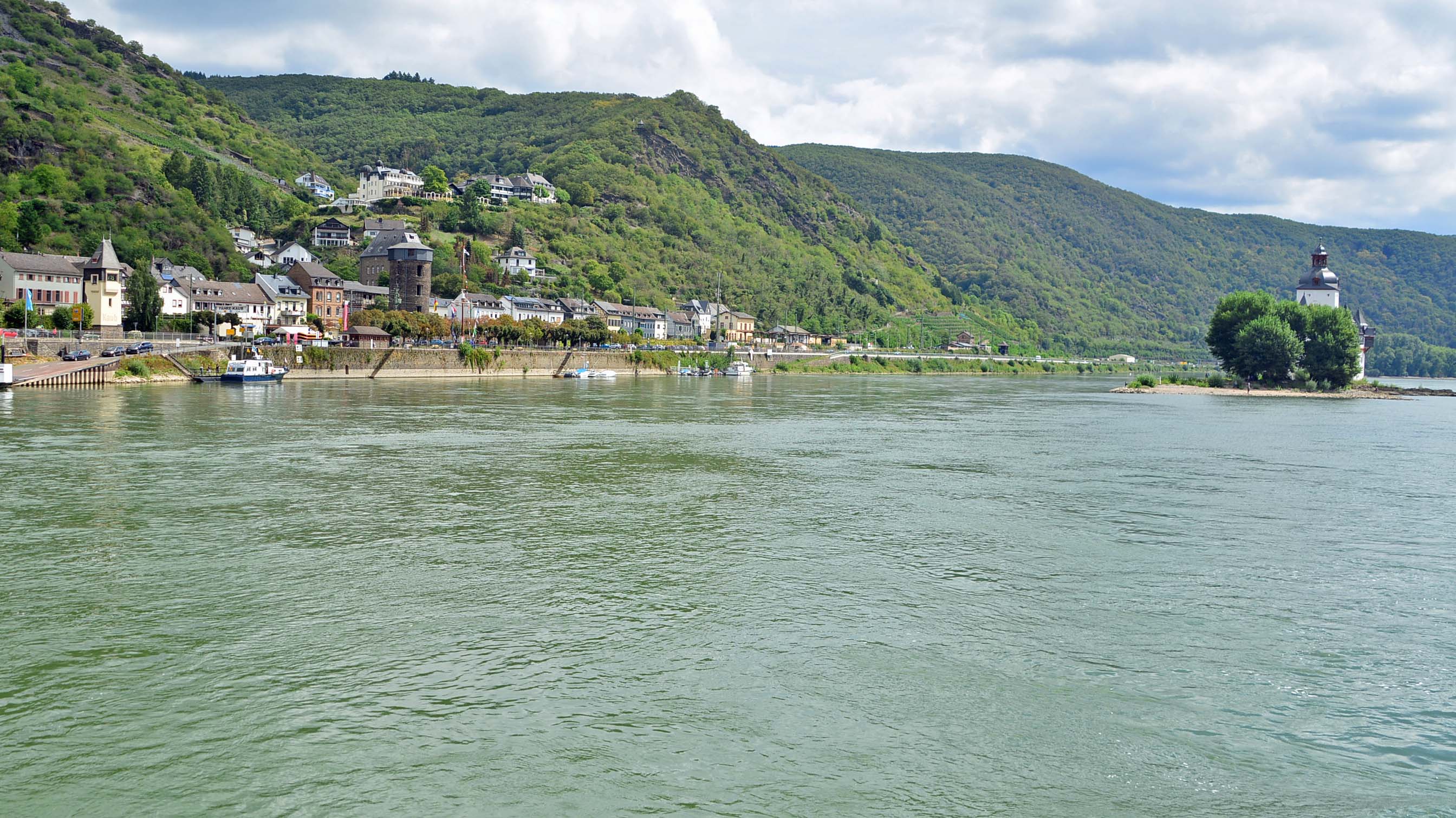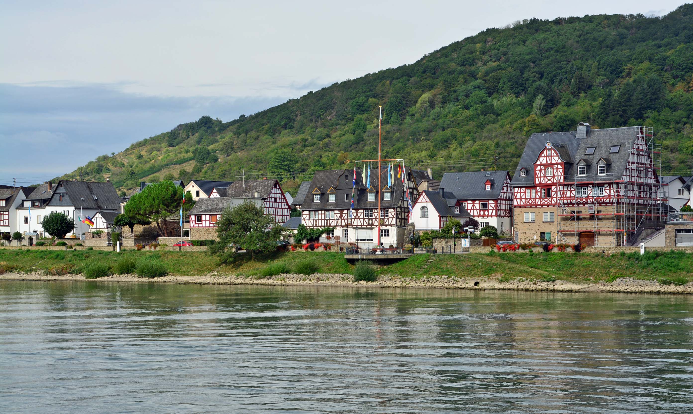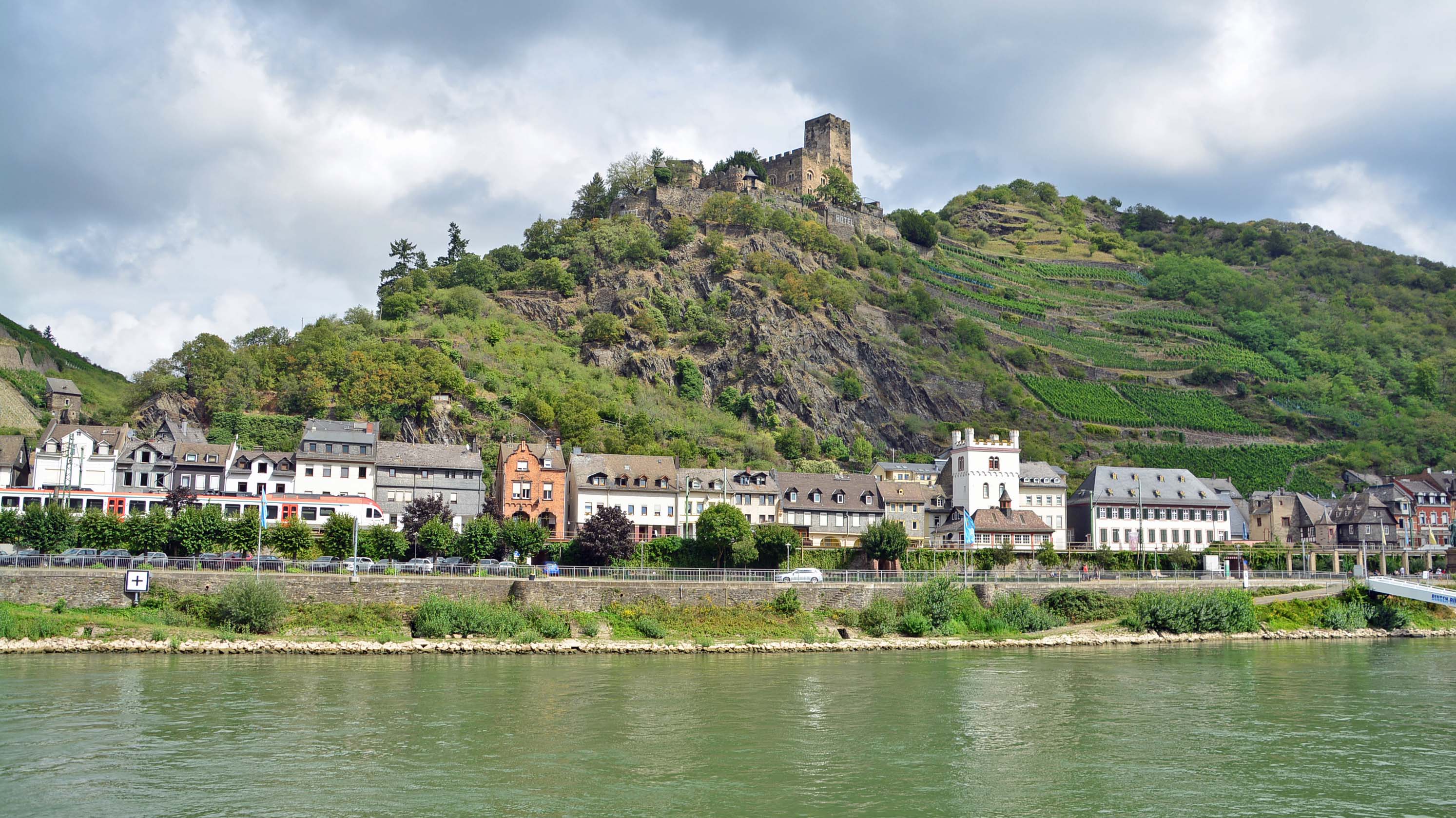 Nach dem Frühstück fahren wir zwei Kilometer Richtung Bedarfshaltestelle der Köln-Düsseldorfer Schifffahrtsgesellschaft. Wir lösen unsere Fahrtickets und warten auf den Schaufelraddampfer ‚Goethe‘, die uns an unseren Ausgangspunkt der Radtour zurückbringt. Das Seniorenticket kostet stolze 33,90 €. Dafür sind wir aber auch 5 ½ Stunden auf dem Rheinwasser. Die ‚Goethe‘ kommt superpünktlich, wir bekommen einen Parkplatz für die Räder zugewiesen und gehen sofort an Deck, um die vorbeiziehende Rheinlandschaft nochmal in aller Ruhe zu genießen. Wir fahren am Campingplatz des Womo-Fahrers vorbei, der zusieht, wie wir an ihm vorbeischippern. Es ist wolkig mit wenigen sonnigen Abschnitten und kühler. Wir lassen die zahlreichen Burgen und gemütlichen Städte an uns vorbeiziehen.