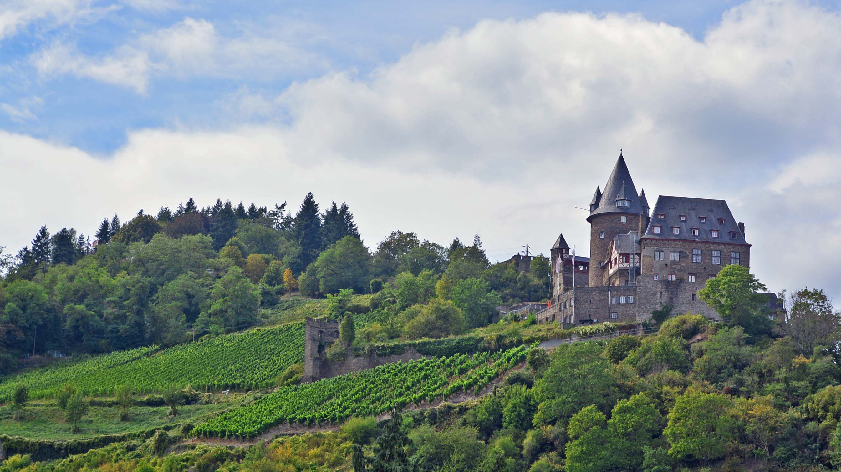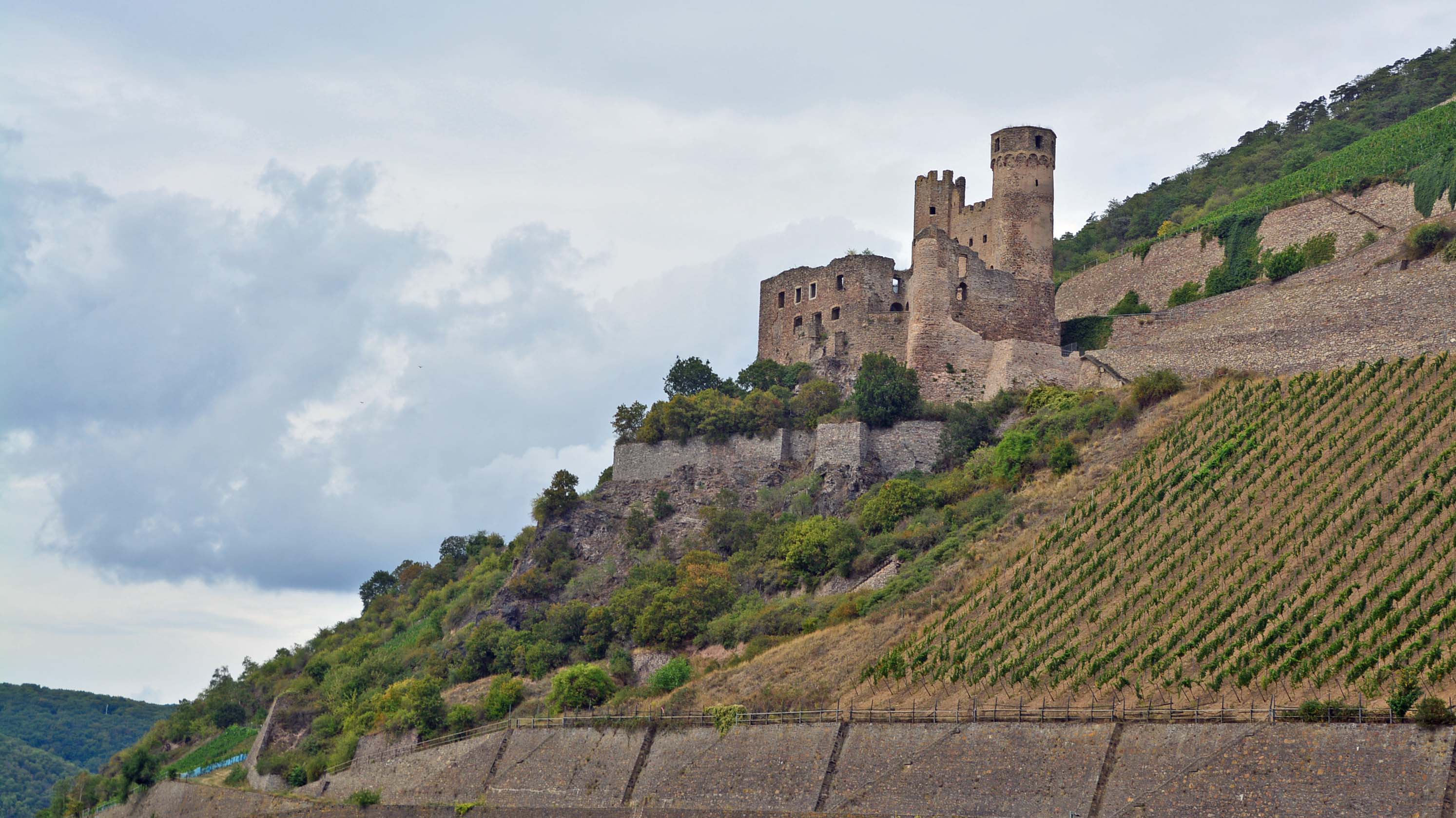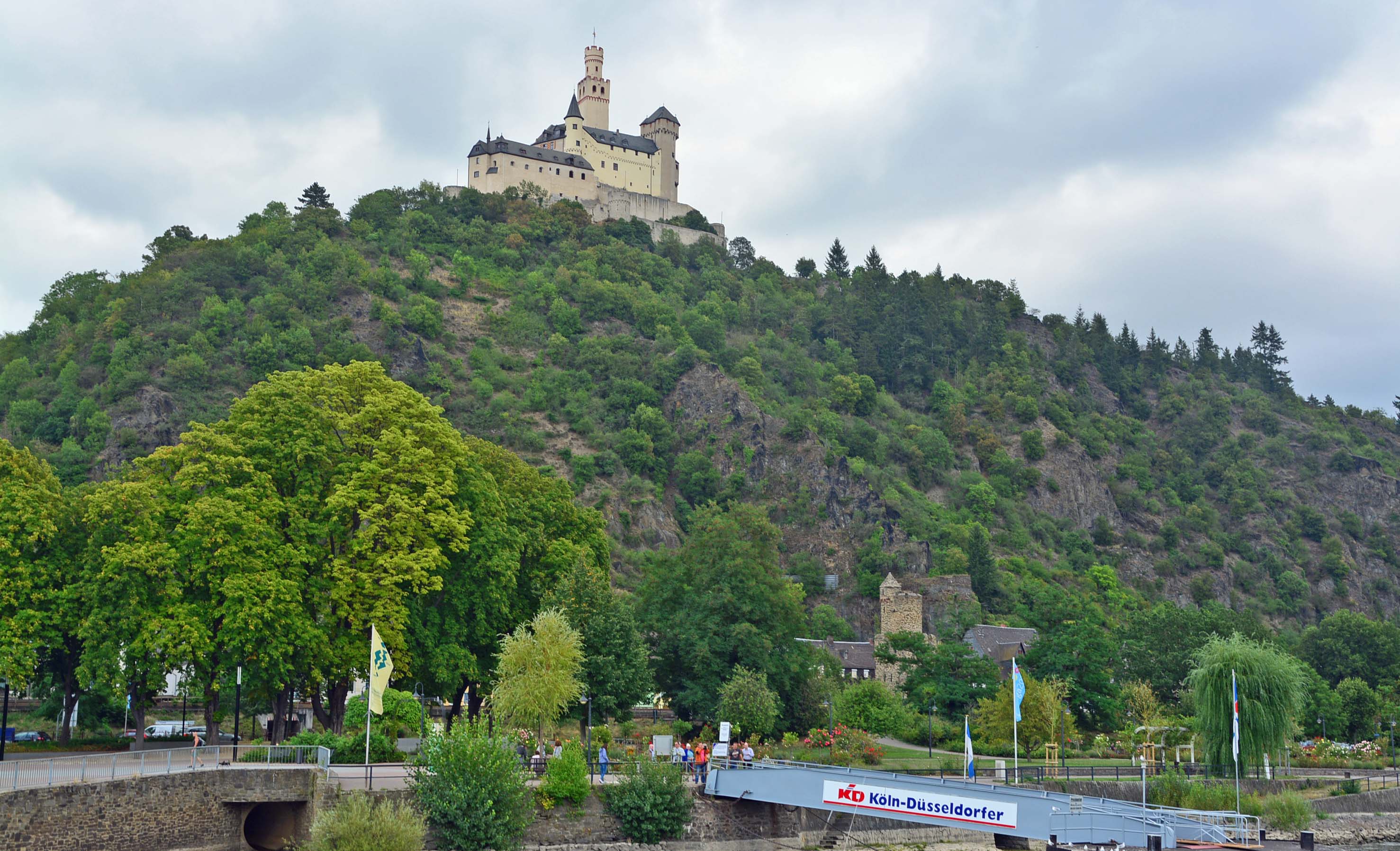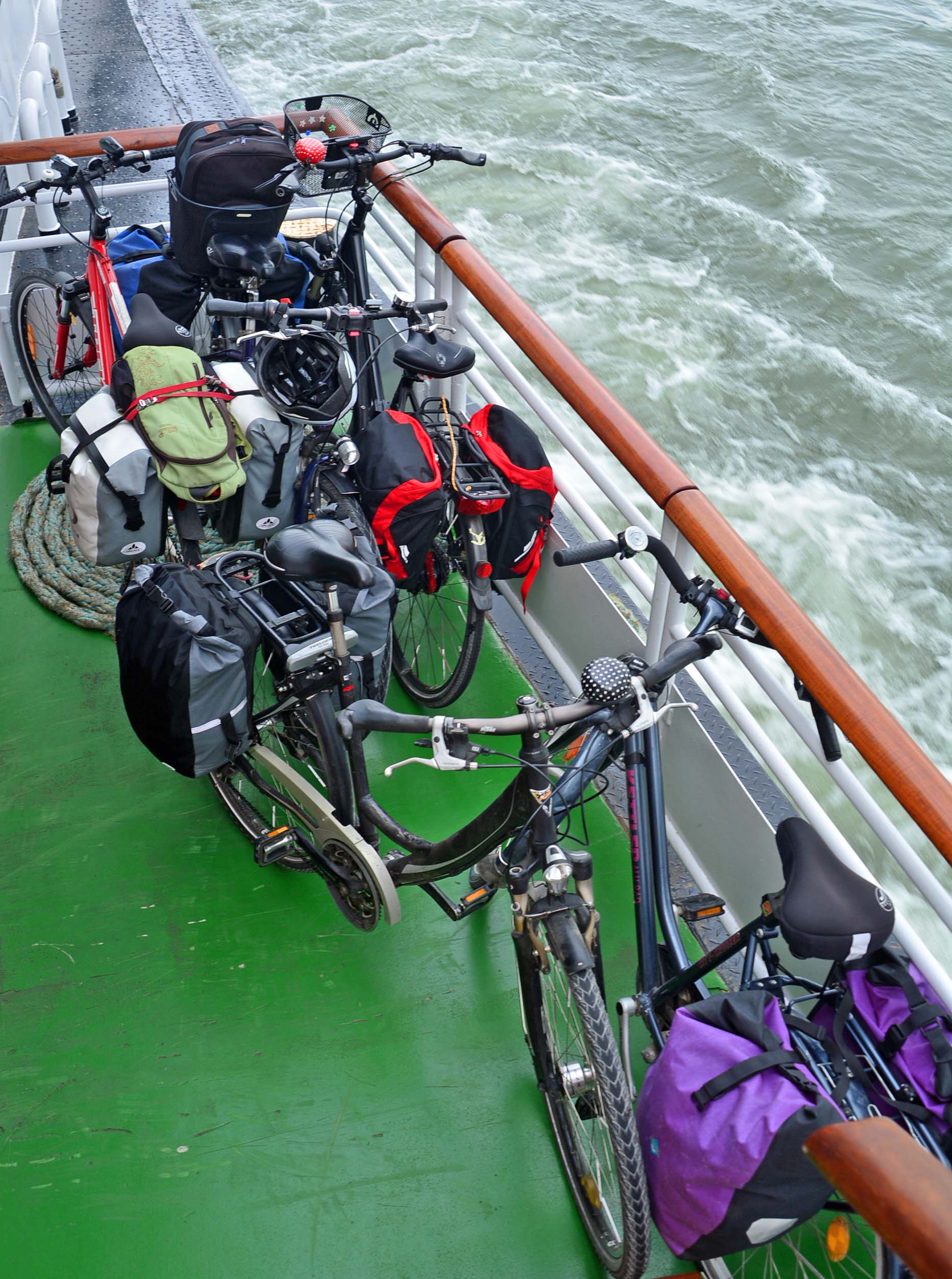 Nach dem Frühstück fahren wir zwei Kilometer Richtung Bedarfshaltestelle der Köln-Düsseldorfer Schifffahrtsgesellschaft. Wir lösen unsere Fahrtickets und warten auf den Schaufelraddampfer ‚Goethe‘, die uns an unseren Ausgangspunkt der Radtour zurückbringt. Das Seniorenticket kostet stolze 33,90 €. Dafür sind wir aber auch 5 ½ Stunden auf dem Rheinwasser. Die ‚Goethe‘ kommt superpünktlich, wir bekommen einen Parkplatz für die Räder zugewiesen und gehen sofort an Deck, um die vorbeiziehende Rheinlandschaft nochmal in aller Ruhe zu genießen. Wir fahren am Campingplatz des Womo-Fahrers vorbei, der zusieht, wie wir an ihm vorbeischippern. Es ist wolkig mit wenigen sonnigen Abschnitten und kühler. Wir lassen die zahlreichen Burgen und gemütlichen Städte an uns vorbeiziehen.