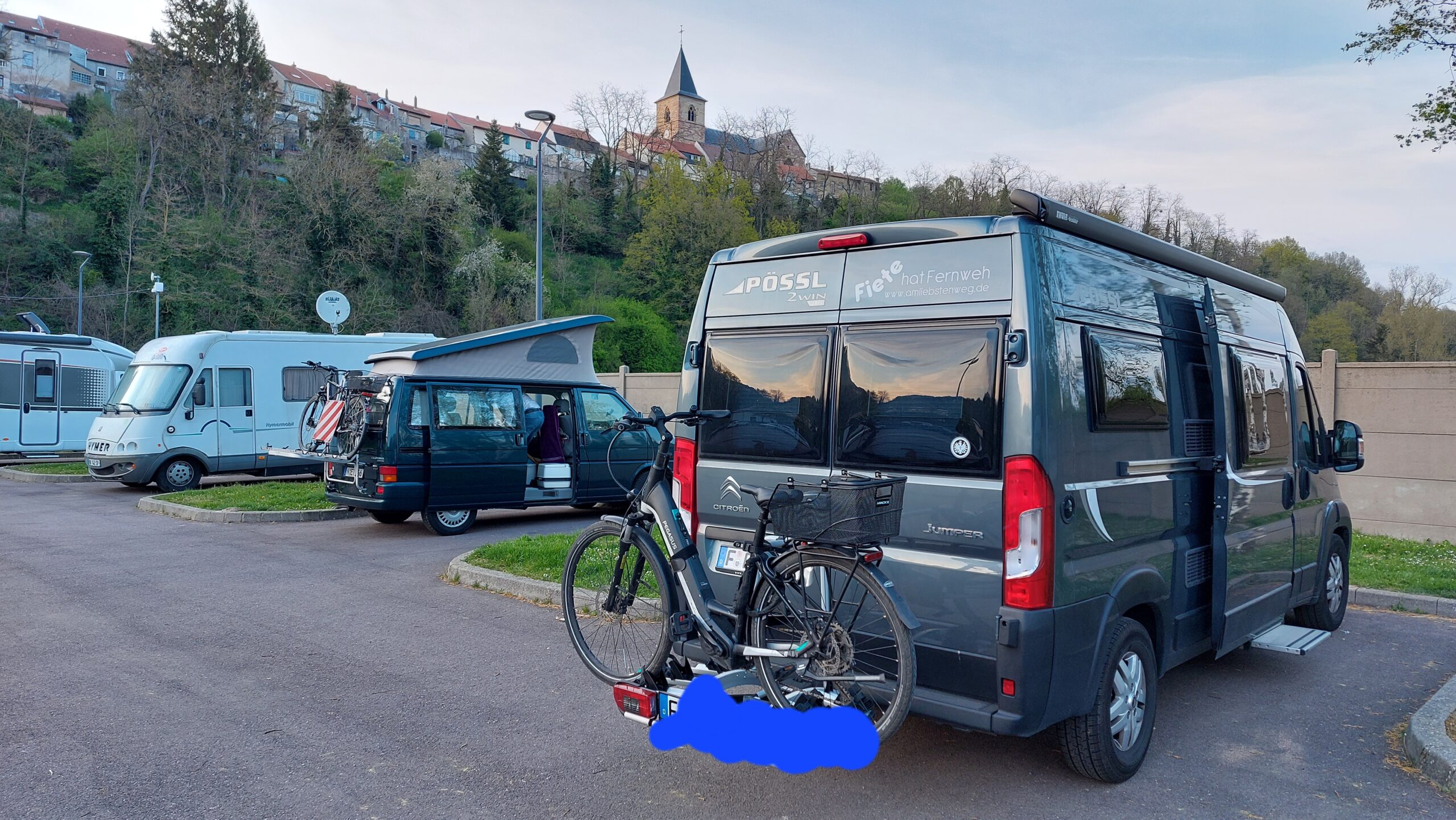 Ich fahre zum Womo-Stellplatz in Hombourg-Haut und finde einen angenehmen Platz mit Blick auf die beleuchtete Burg im mittelalterlichen Kern der Altstadt vor. Da der Strom nicht funktioniert, teste ich das 12-Volt-Ladekabel für den PC. Kaum zu glauben, es funktioniert auf Anhieb.