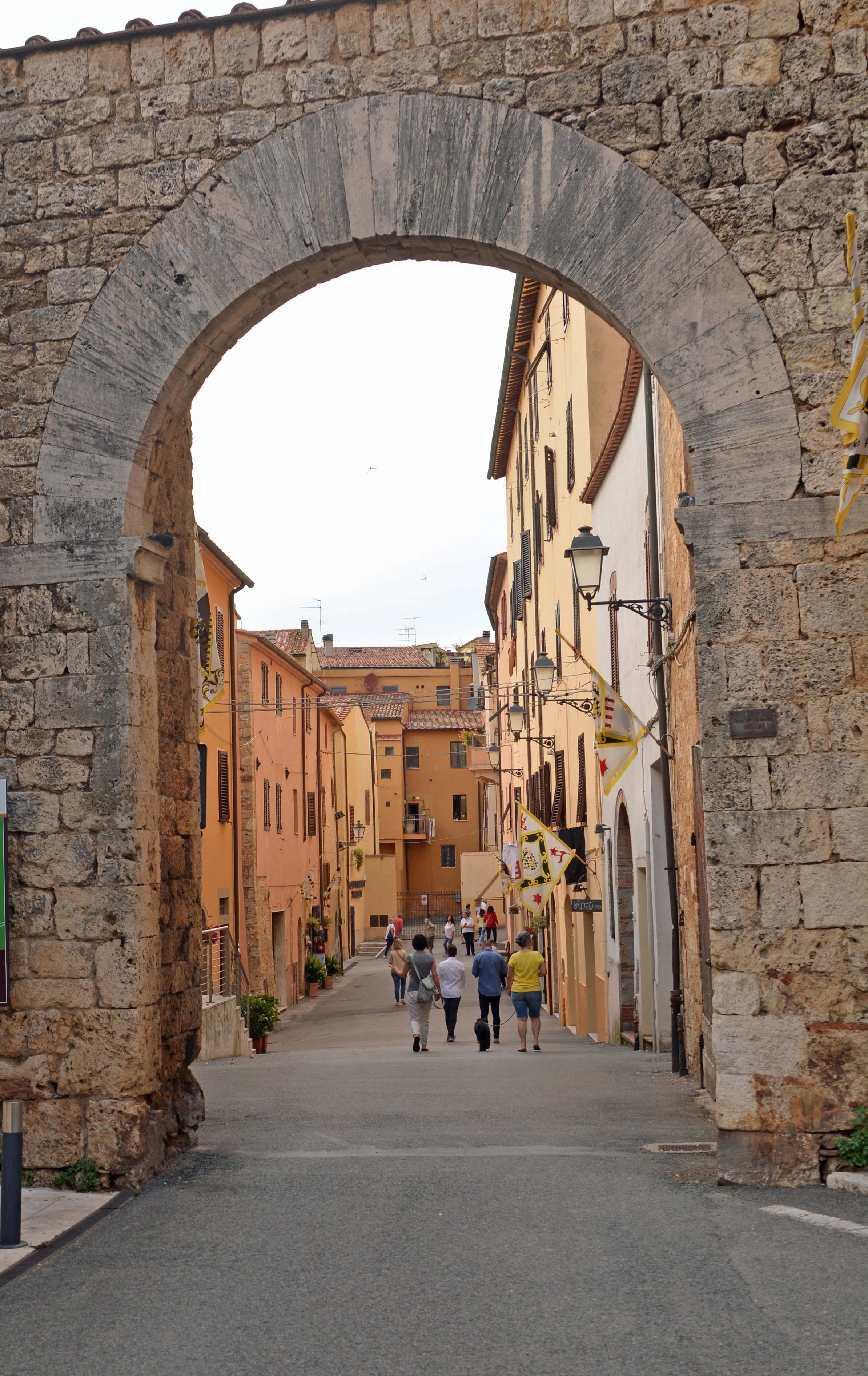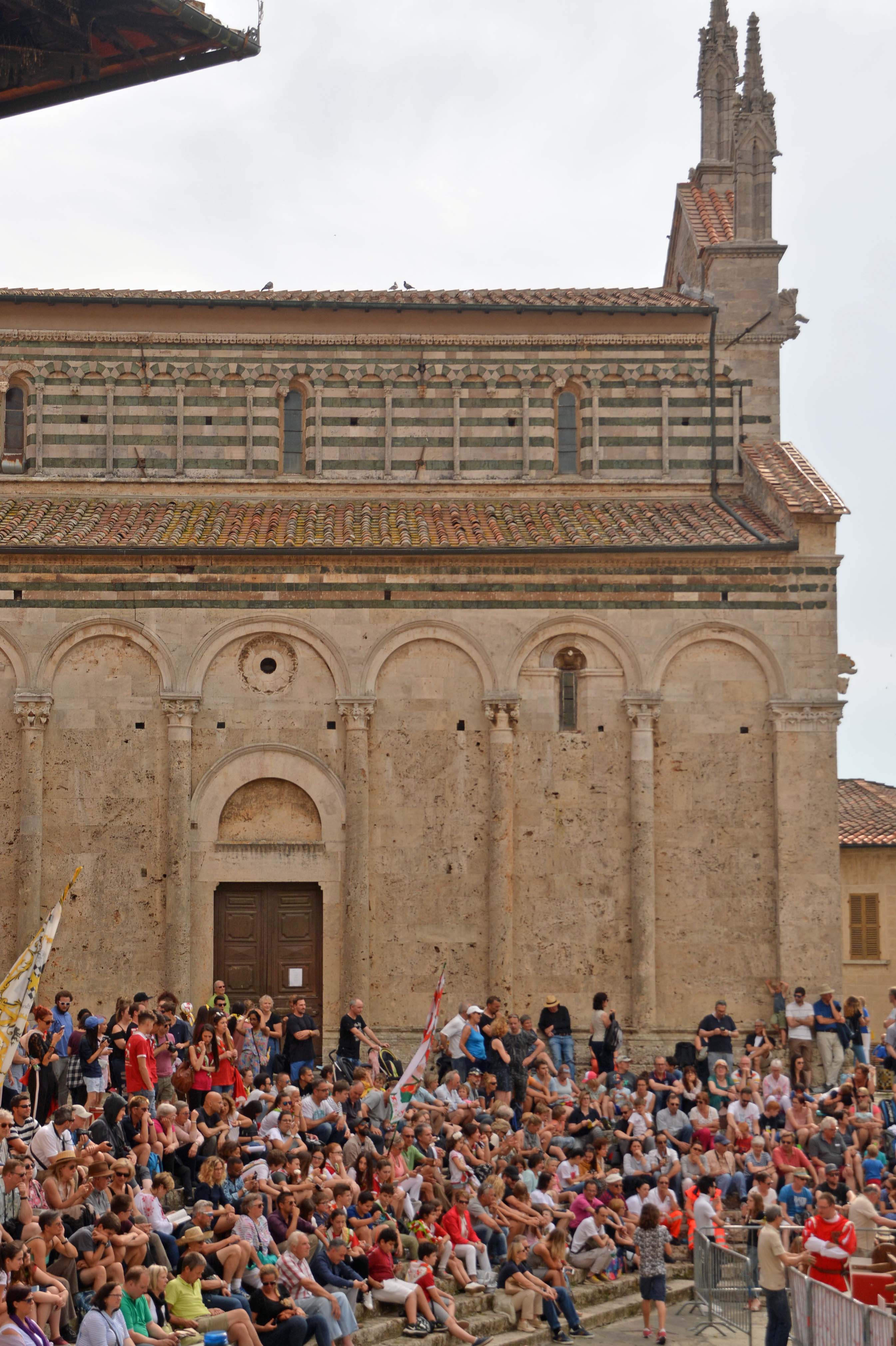 Wir kommen durch die Porta alle Silici und sehen schon den Dom über den Hausdächern thronen. Es ist viel los, was uns zunächst nicht verwundert. Plötzlich hören wir Trommeln und lautes Geschwätz. Der Domplatz ist von allen Seiten mit Autos der Carabinieri abgesperrt. Auf einem Plakat entdecke ich die Lösung: Es ist ‚Armbrustschüten-Spektakel‘!! 24 Schützen in historischen Kostümen, 8 für jeden Stadtteil, kämpfen um den Sieg. 14 € für einen Tribünenplatz sind zu löhnen. Da wir schon spät sind und noch unseren Agricampeggio erreichen wollen, verzichten wir auf das Fest. Massa Marittima legen wir ad acta – bis zu einem der nächsten Toskanaurlaube. Ich bin ein wenig missmutig.