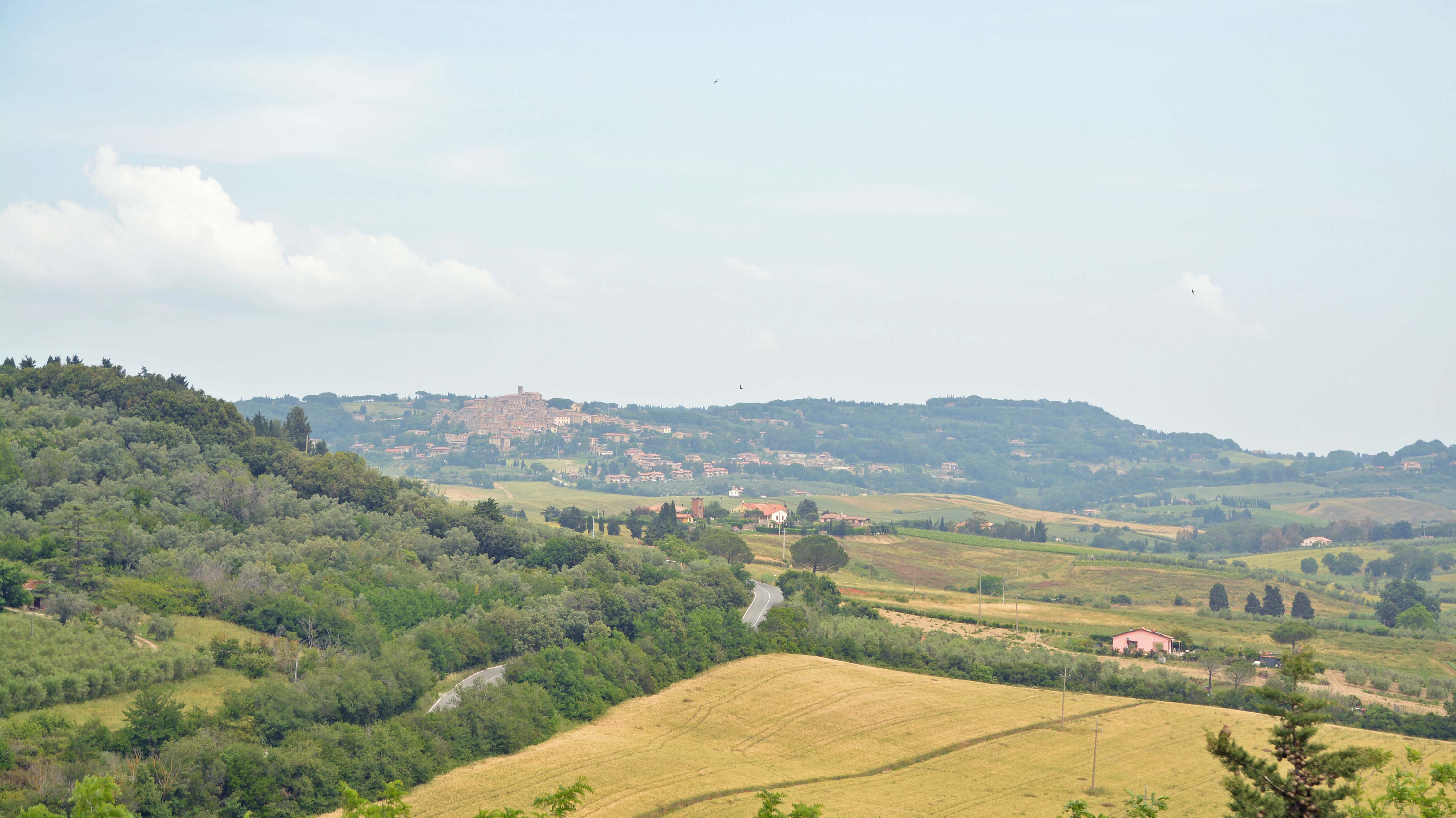 Wir sind die einzigen Gäste und stehen mit Fiete auf einer riesigen Wiese vor einem Olivenhain! Es ist ruhig und sehr beschaulich. Wir genießen Luft, Einsamkeit, den Blick auf das beleuchtete Montepescali und ein bisschen den Münsteraner Tatort.