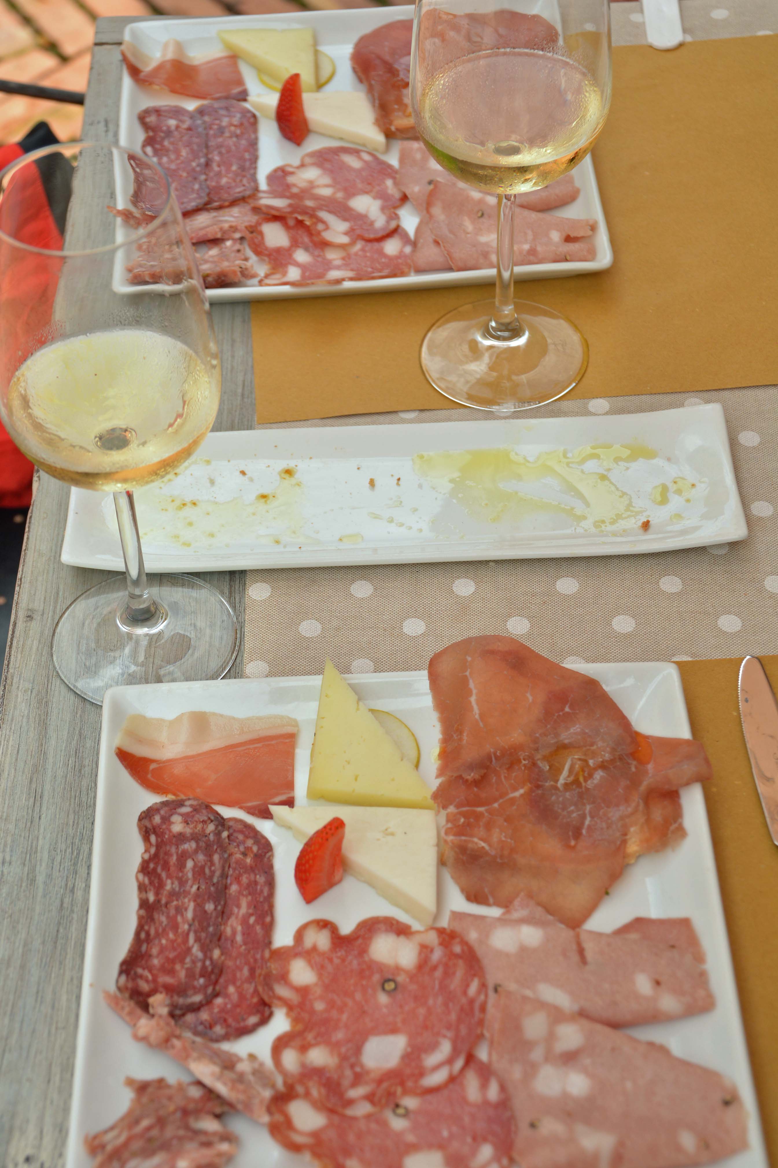 Nach so viel Kultur gelüstet es uns mal wieder nach einer toskanischen ‚Salumi e formaggi‘ Platte, natürlich mit einem leckeren Gläschen Wein. Wir finden eine wunderbare Osteria und genießen…..