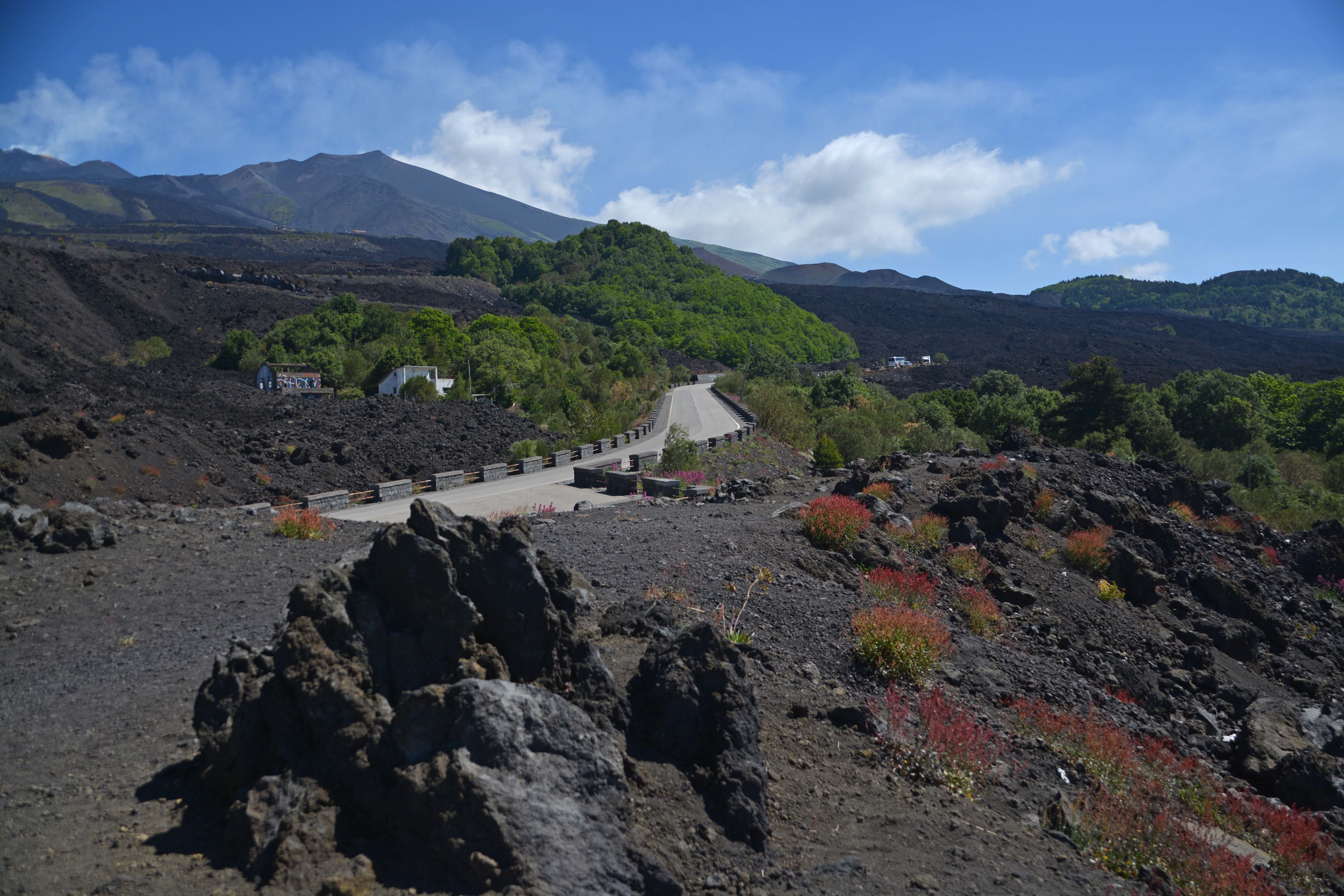 Kurz hinter Nicolosi, dem Hauptort des Ätna-Tourismus, fahren wir durch die ersten Ausläufer der erkalteten Lavazungen, durch verschiedene Vegetationen und immer den majestätischen Berg vor Augen. Es ist kaum Verkehr. Bei einer meiner Fotopausen kommt einer der zahlreichen Reisebusse, vollgestopft mit amerikanischen Touristen, hält wenige Minuten, spuckt alle aus, jagt sie zum Ätna-Fotopunkt und dann wird – selbstverständlich aus größtmöglichem Abstand zum Motiv – geknipst was die Tablets und Smartphones hergeben. Ganz großes Fotokino! Ich beobachte das mit einem breiten Schmunzeln aus nächster Nähe, während ich die gewaltige Kraterlandschaft mit ihren endlosen grau-schwarzen Lavafeldern genieße, um in Kürze selbst darin herumzustapfen.