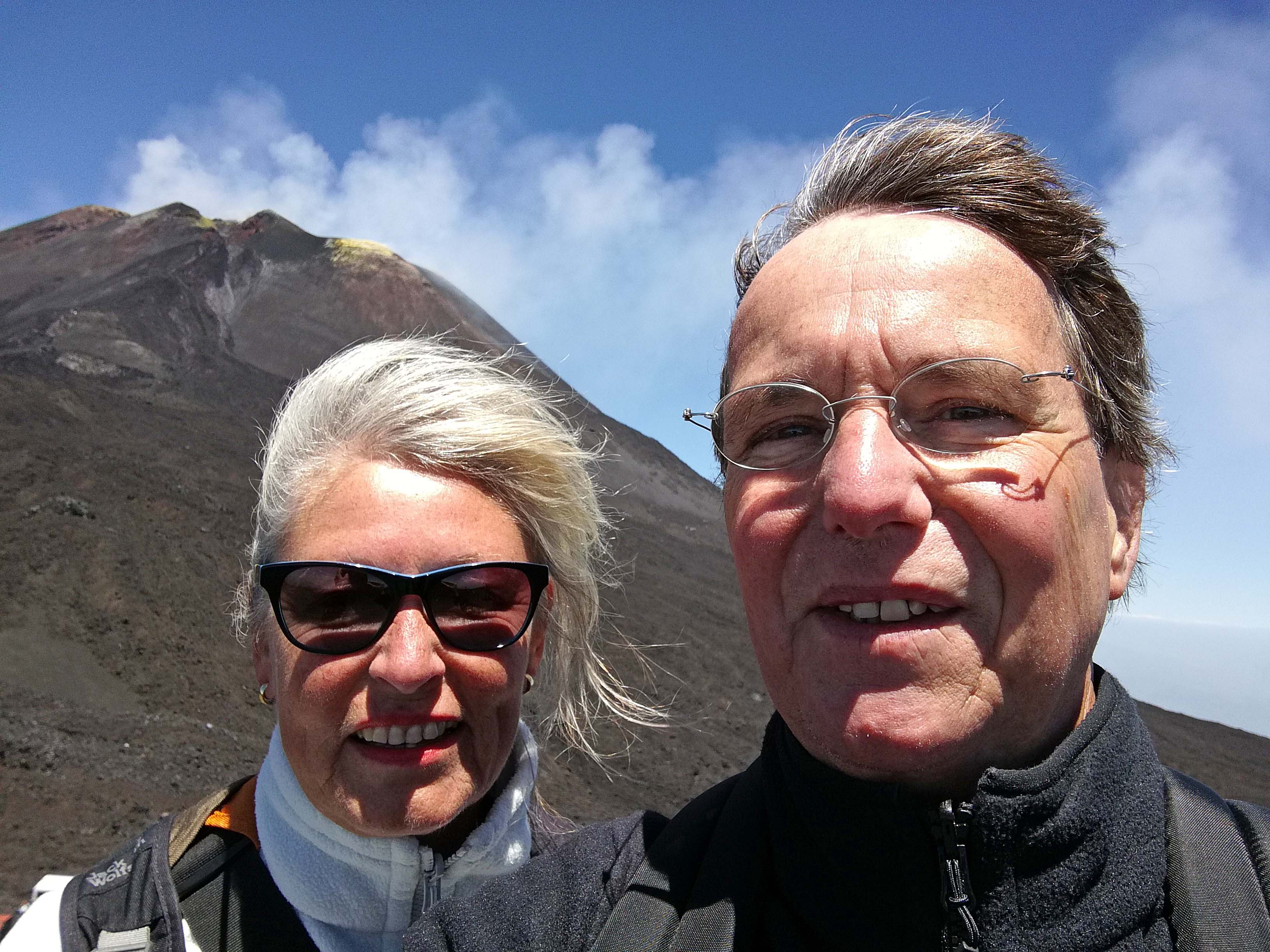 Wir starten kurz nach 10 Uhr zum ‚Etna Sud‘. Klaus ist hellwach. Er bekommt für seinen Euro kein heißes Wasser und ist missmutig! Ich bin bestens gelaunt, denn der Mongibello, wie ihn die Sizilianer respektvoll nennen, strahlt ohne nennenswerte Wolken in der Morgensonne und raucht bedächtig vor sich hin, eine grandiose Naturkulisse. Was für ein großes Glück für uns. Nicht nur, dass er oft wolkenverhangen und im Dunst verschwindet, es rumort auch ständig in ihm. Fast 150 große Ausbrüche wurden seit dem 5. Jh. vor Chr. gezählt.