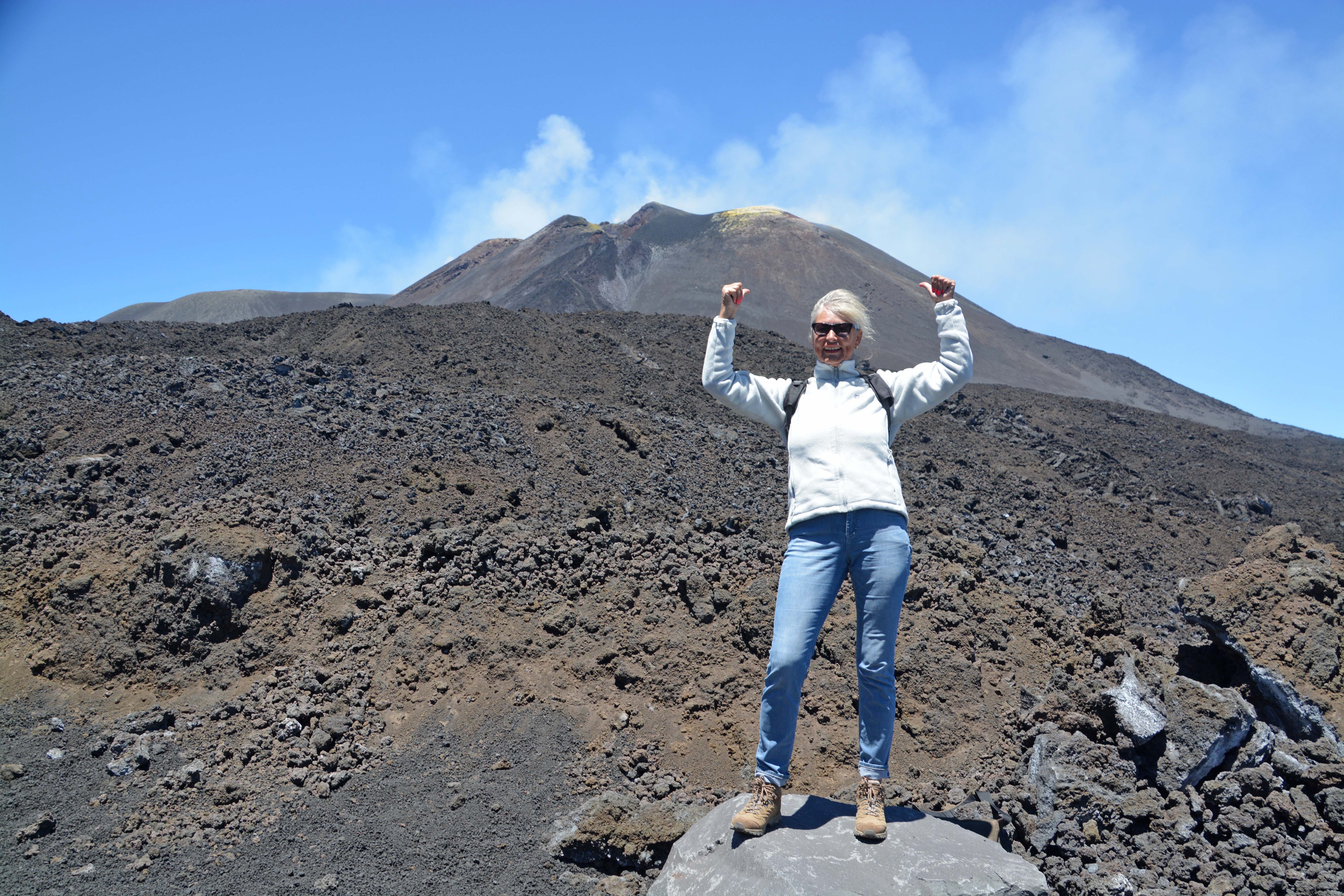 Jetzt beginnt der Höhepunkt der Tour. Wir kraxeln in der grau-schwarzen Lava noch weitere 200 Meter hinauf und laufen durch Lavafelder und –zungen vom Ausbruch in 2002. Dadurch sind hier mehrere neue Nebenkrater entstanden. Ein bisschen mehr Aktivität könnte der größte Vulkan Europas schon zeigen!!! Klaus meint trocken: „Jetzt müsste es gerade mal Buff mit  Action und Lava machen“. Sein Wunsch bleibt unerfüllt. Es raucht ununterbrochen aus dem Hauptkrater, selten aber auf den Nebenschauplätzen. Die Lavasteine zerbröseln in unseren Händen und knapp 15 cm unter der Erde könnten wir ein Ei backen. Es ist überwältigend und traumhaft schön. Catania liegt im Dunst vor unseren Füßen. Die kleinen Menschengruppen bewegen sich wie Puppen einer Karawane, um der Bergspitze Schritt für Schritt näher zu kommen. Wir auch.