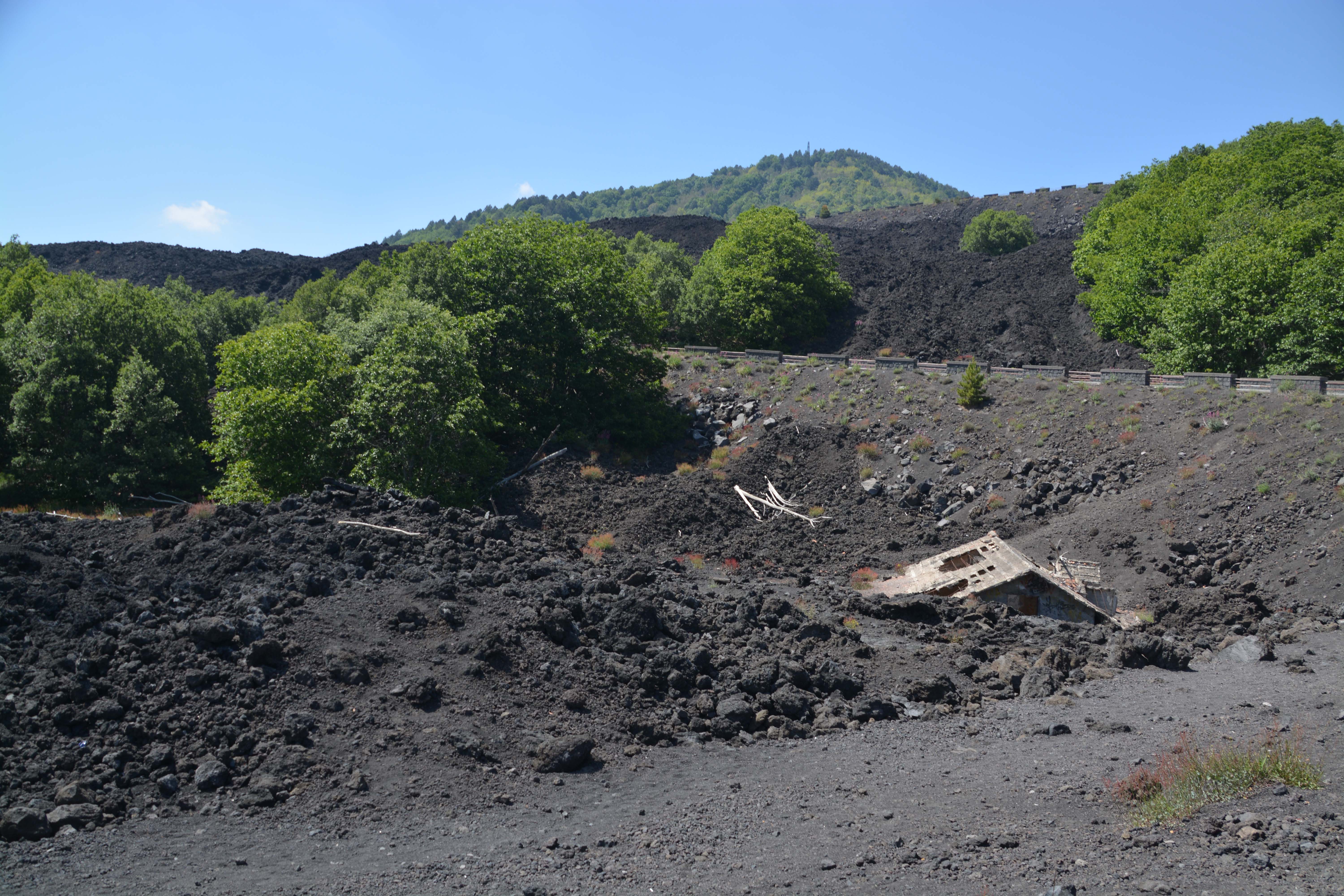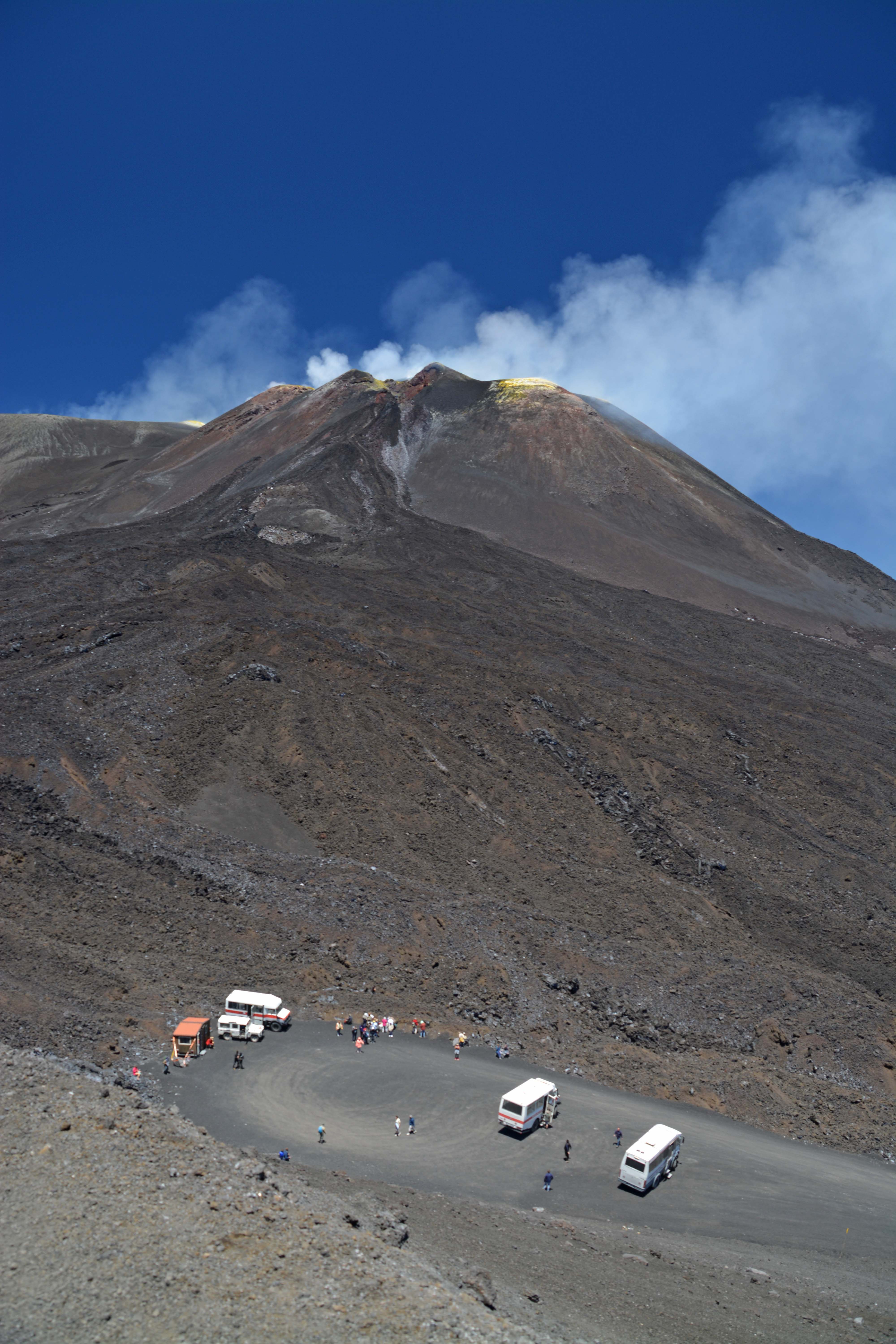 Wir passieren ‚das durch zahllose Bilder berühmt gewordene ‚verschüttete Häuschen‘ kurz vor der ersten Station, dem Refugio Sapienza, wo täglich hunderte von Bussen und Autos durchgeschleust werden. Diese Ausgangsbasis sowie die Seilbahn wurden bei einem Ausbruch 2002 komplett zerstört. Der neue Parkplatz ist gut belegt, wir suchen ein Plätzen mit Ausblick ins Tal und tauschen Shorts in lange Hose und T-Shirt in Fliesjacke für die weitere Fahrt zur Ätnaspitze. Die Tickets für die Seilbahn, die Unimogs und den Guide kosten je 64€, ein stolzer Preis, der es aber ohne Frage wert ist.