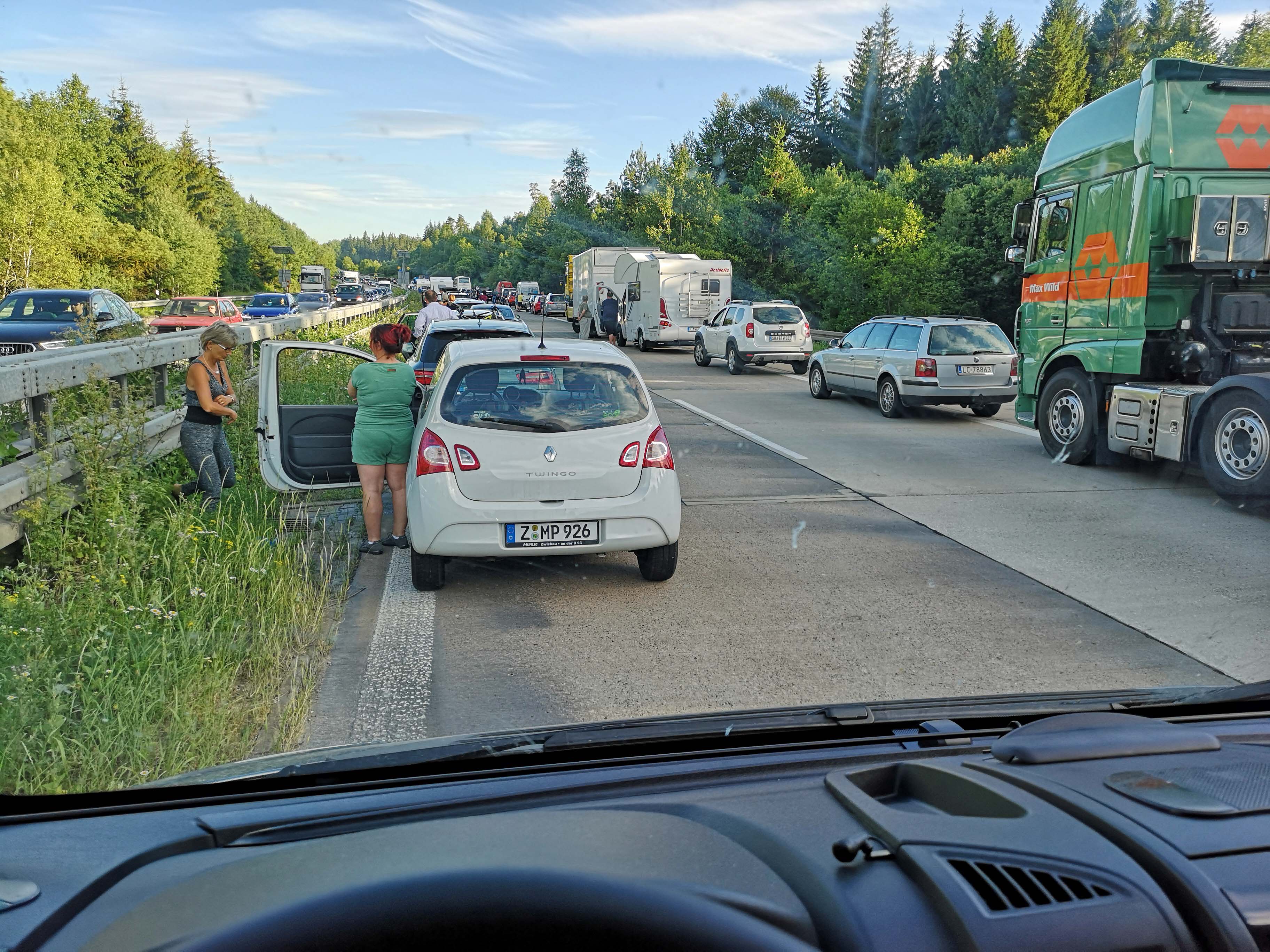 Ich füge mich in die Situation, irgendwie, verspeise meinen Kartoffelsalat, esse ein riesengroßes TWIX für meinen dicken Hals, hole mein Nackenhörnchen und lehne mich mehr oder weniger bequem zurück. Ab und zu checke ich die Lage mit dem linken Auge, aber es tut sich nichts. Aus Frankfurt erhalte ich per WhatsApp den Rat: ‚Halte durch, Du schaffst das!‘ Plötzlich klopfen die beiden Frauen aus dem Auto vor mir an meine Scheibe, und haben erfreuliche Nachrichten: es geht gleich weiter. Cool geblieben und zwei Stunden Wartezeit verkraftet! Ich bin stolz auf mich.