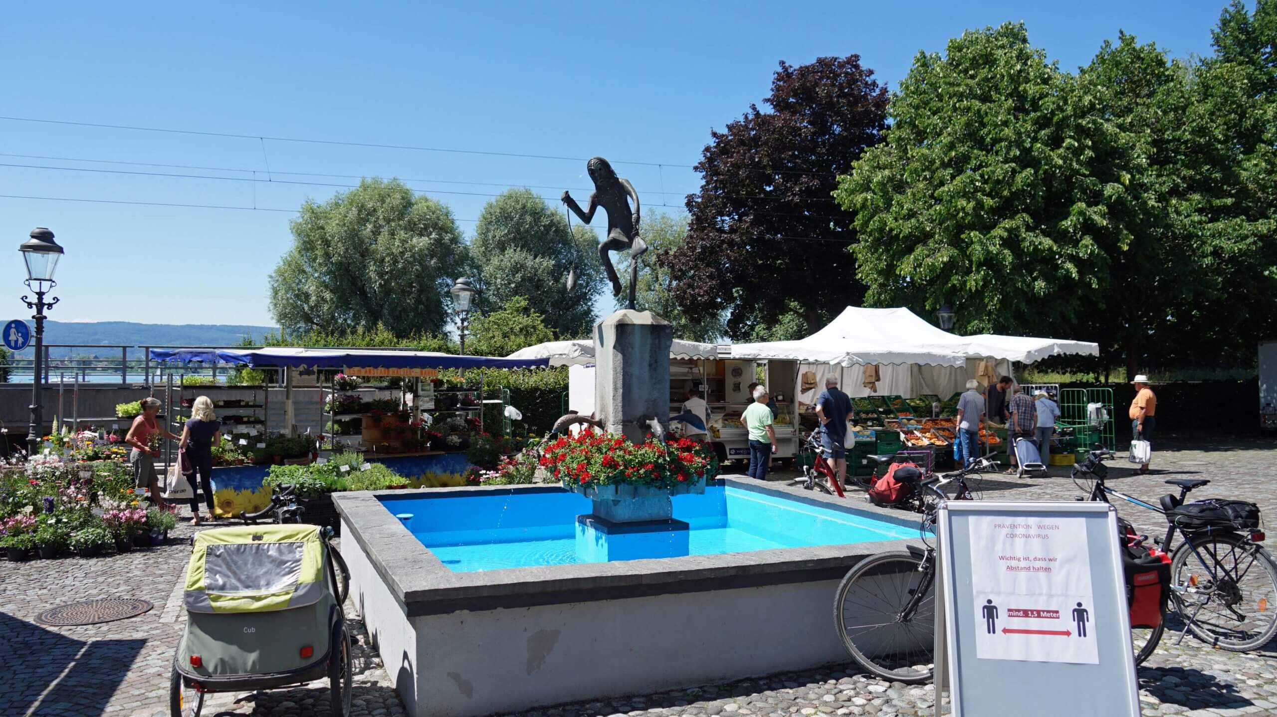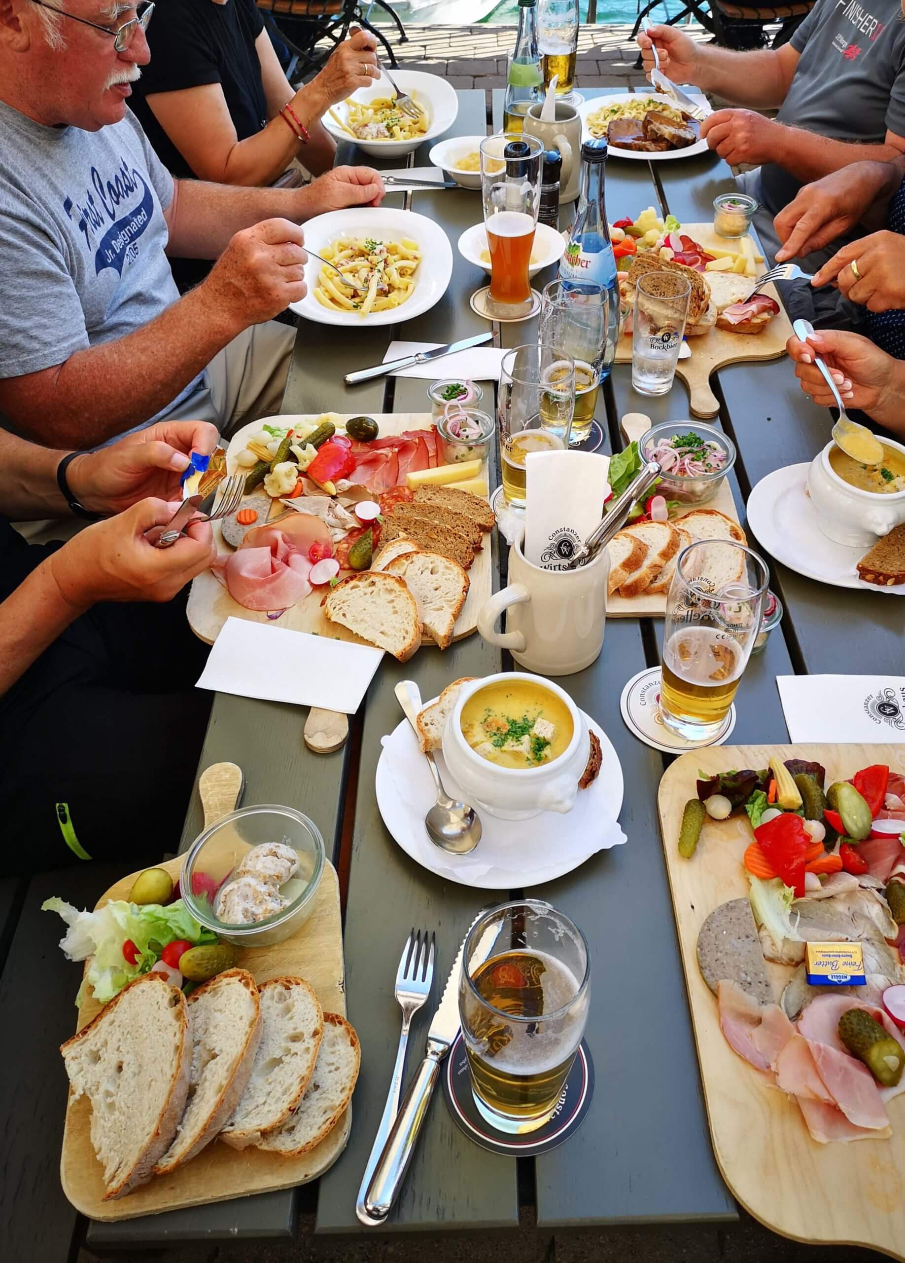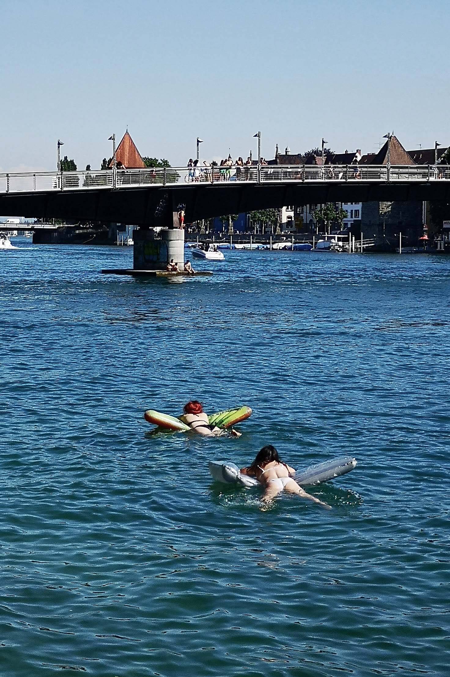An der Fußgängerbrücke am See warte ich mit meiner Freundin auf alle Radler aus unserer Gruppe, denn heute geht es ein letztes Mal zum Abschiedsessen ins Constanzer Wirtshaus. Die Wiesen und Bänke am Rheinufer sind übersät mit Studenten, Abstand und Hygieneregeln werden komplett missachtet. Nur im Seerhein haben die Schwimmer genügend Platz.