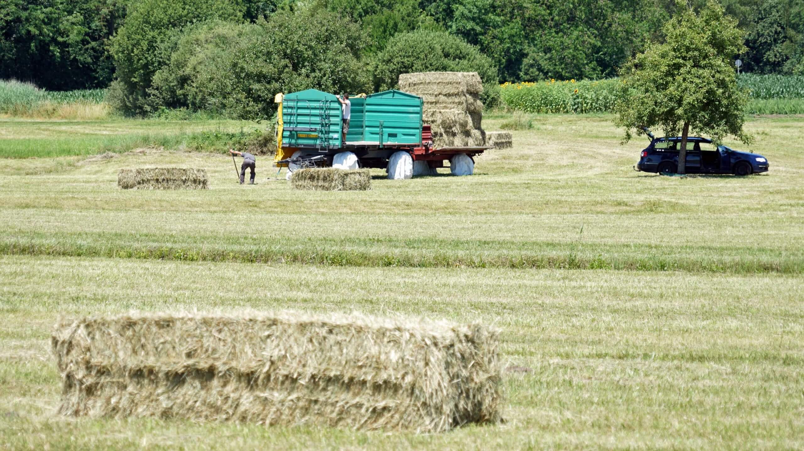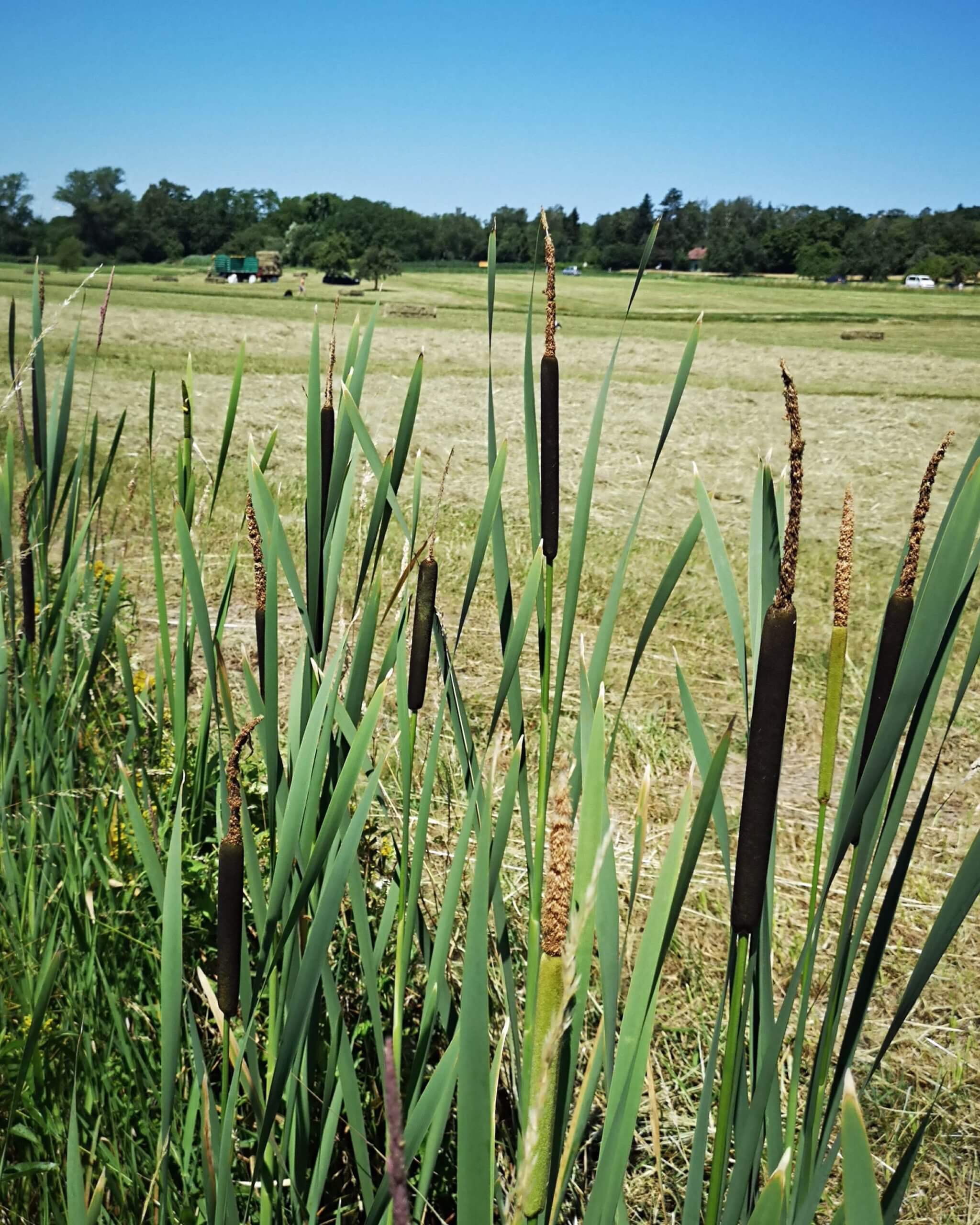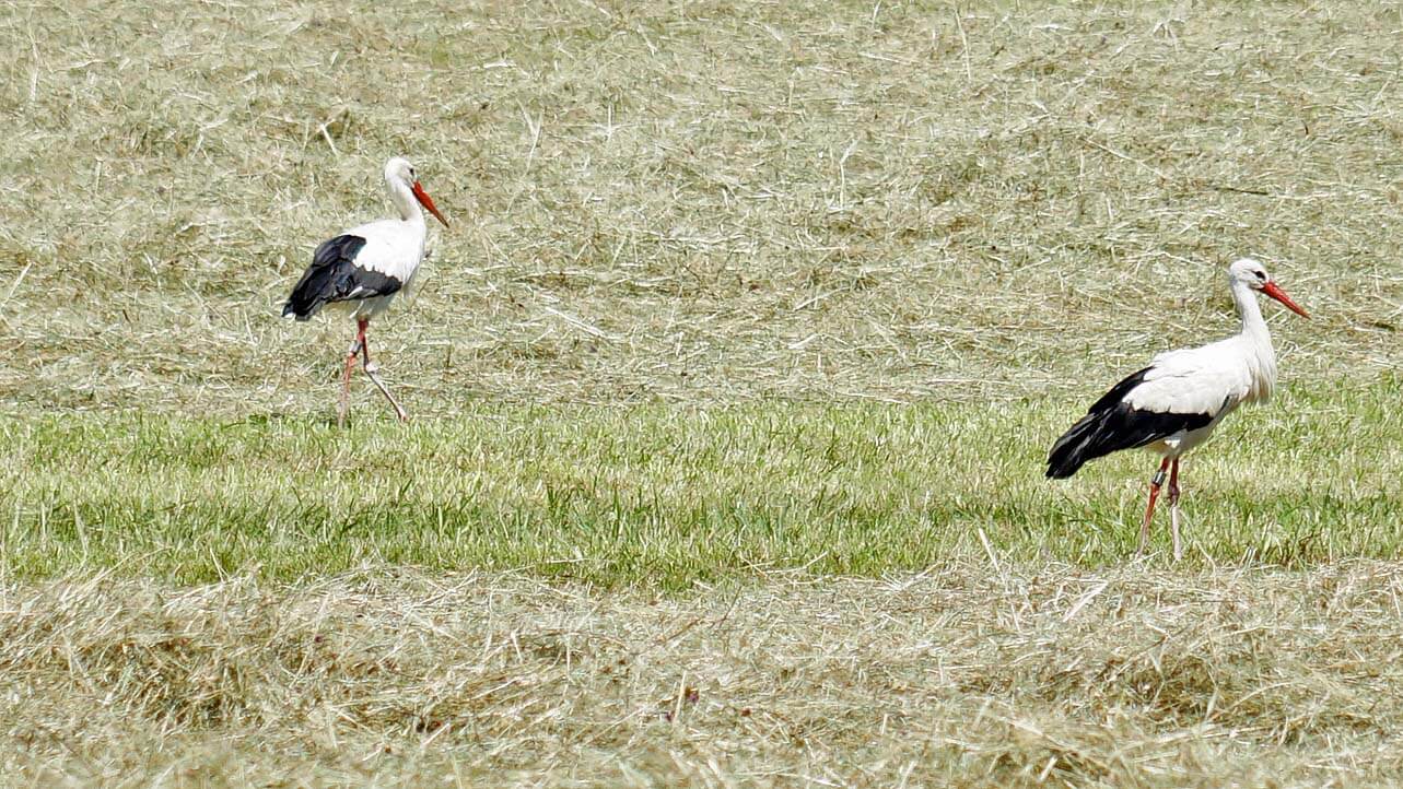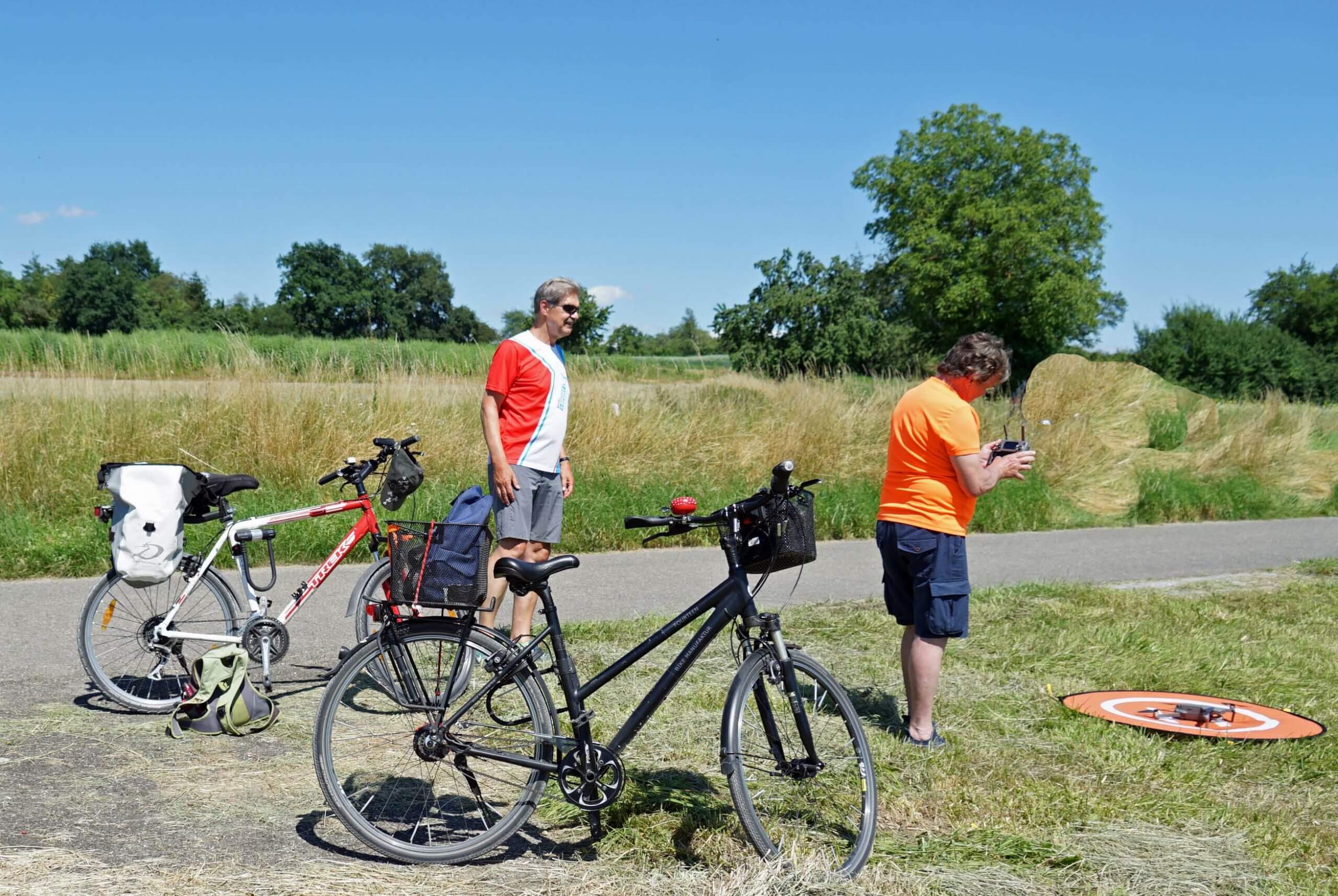 Bis zur Insel Reichenau geht es wieder an der Bahnlinie entlang und dann durch viel Natur: Felder, Streuobstwiesen, weites Land. Kurz vor Allensbach – hauptsächlich bekannt für das hier ansässige Institut für Demoskopie – entdecken wir Störche, die sich überhaupt nicht an dem Mähdrescher stören, der gerade seine Ernte einholt. Und eine Entenkolonie fliegt im Korso über uns hinweg. Natürlich gehen wir auf Fotojagd. Zwischenzeitlich fällt jedoch Klaus‘ Rad in eine tiefe Wiese. Dummerweise fließt dort ein kleiner Bach und die Fahrradtasche mit der Drohne landet im Wasser. Gott sei Dank war sie gut verpackt.