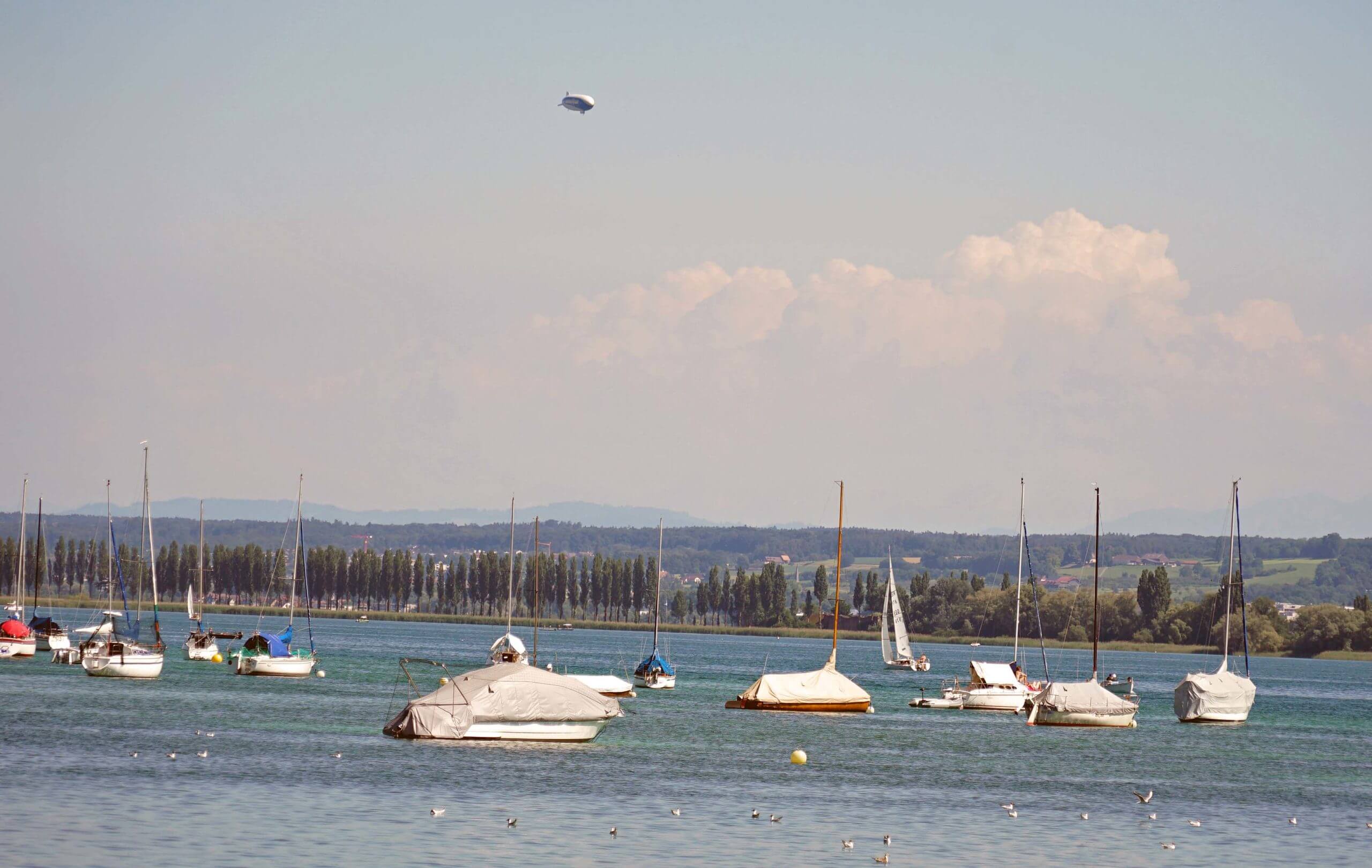 Weiter geht es durch Wiesen, Felder, vorbei an Campingplätzen und heute fast ohne Hügel! Es sind wenige Touris unterwegs, immer wieder gibt es herrliche Ausblicke auf den Boden- und den Gnadensee, Boote ohne Ende dümpeln oder segeln herum und über allem ist in aller Ruhe ein Zeppelin auf Sightseeing-Tour. Natur trifft Seele!