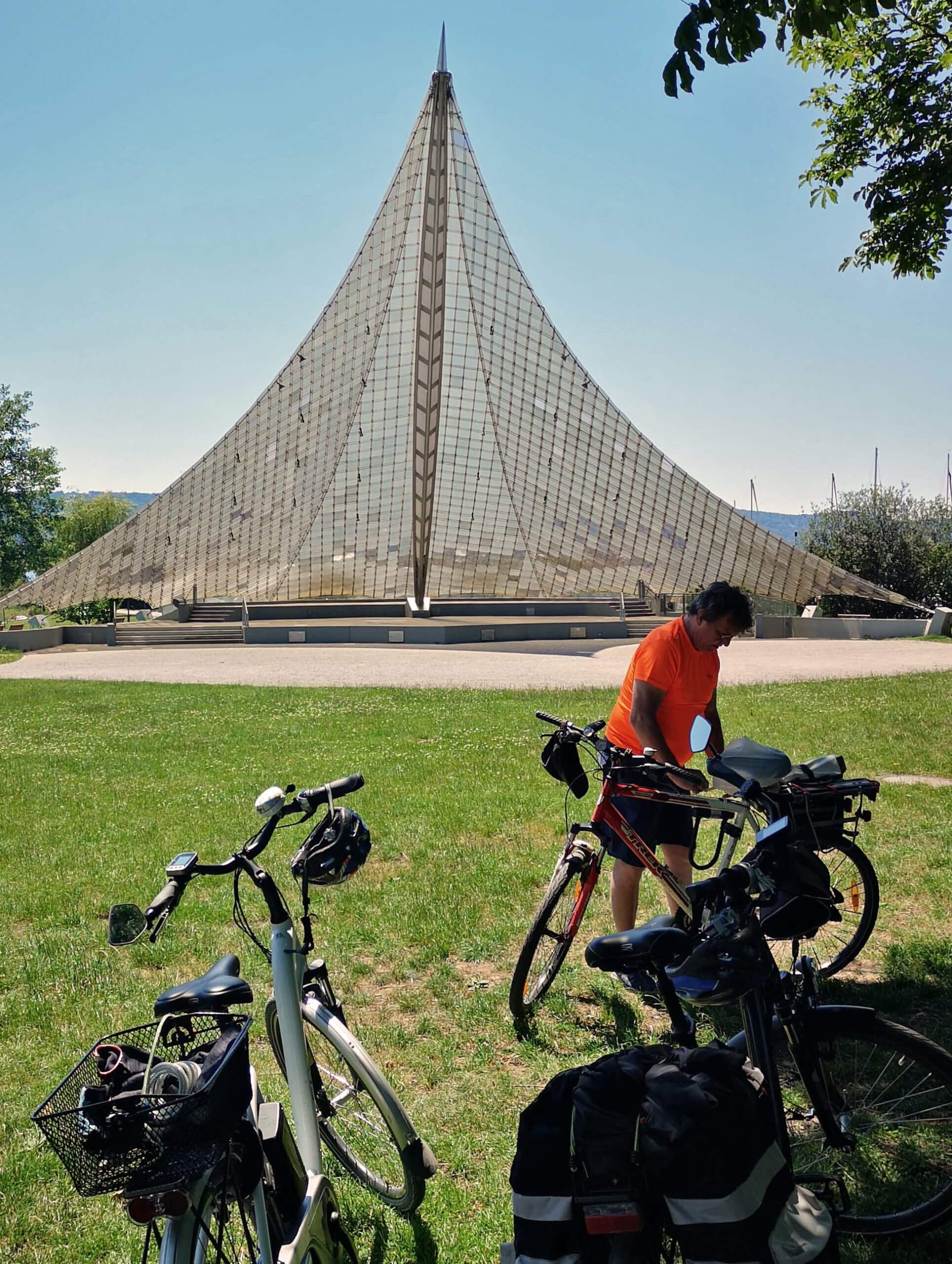 Treffpunkt ist wieder ‚unsere‘ Fußgänger-Rad-Brücke in Konstanz. Da wir heute Aussteiger haben, radeln wir nur zu viert. Und weil wir nicht so viele Kilometer vor uns haben starten wir erst gegen 11 Uhr.
