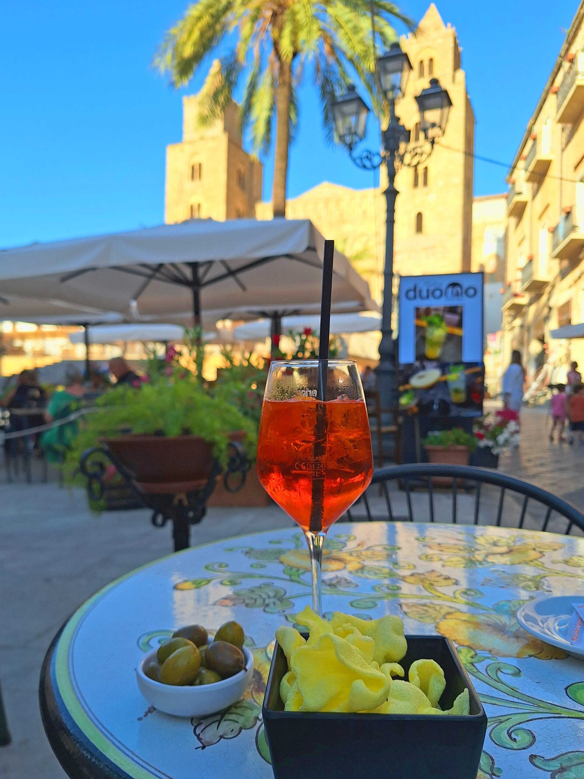 Die wichtigsten Straßen in Cefalù sind der Corso Ruggero und der Corso Via Vittorio Emanuele. Eine davon führt mich auf den „Piazza Duomo“ mit der normannischen Kathedrale Santissimo Salvatore ⛪mit ihren Zwillingstürmen. Die Fassade strahlt mit dem nachmittäglichen Sonnenlicht um die Wette. Ich werfe noch einen Blick auf den einzigartigen Altar und ruhe mich in einem Cafè mit Sicht auf die Kathedrale bei einem Aperol Sprizz 🍹