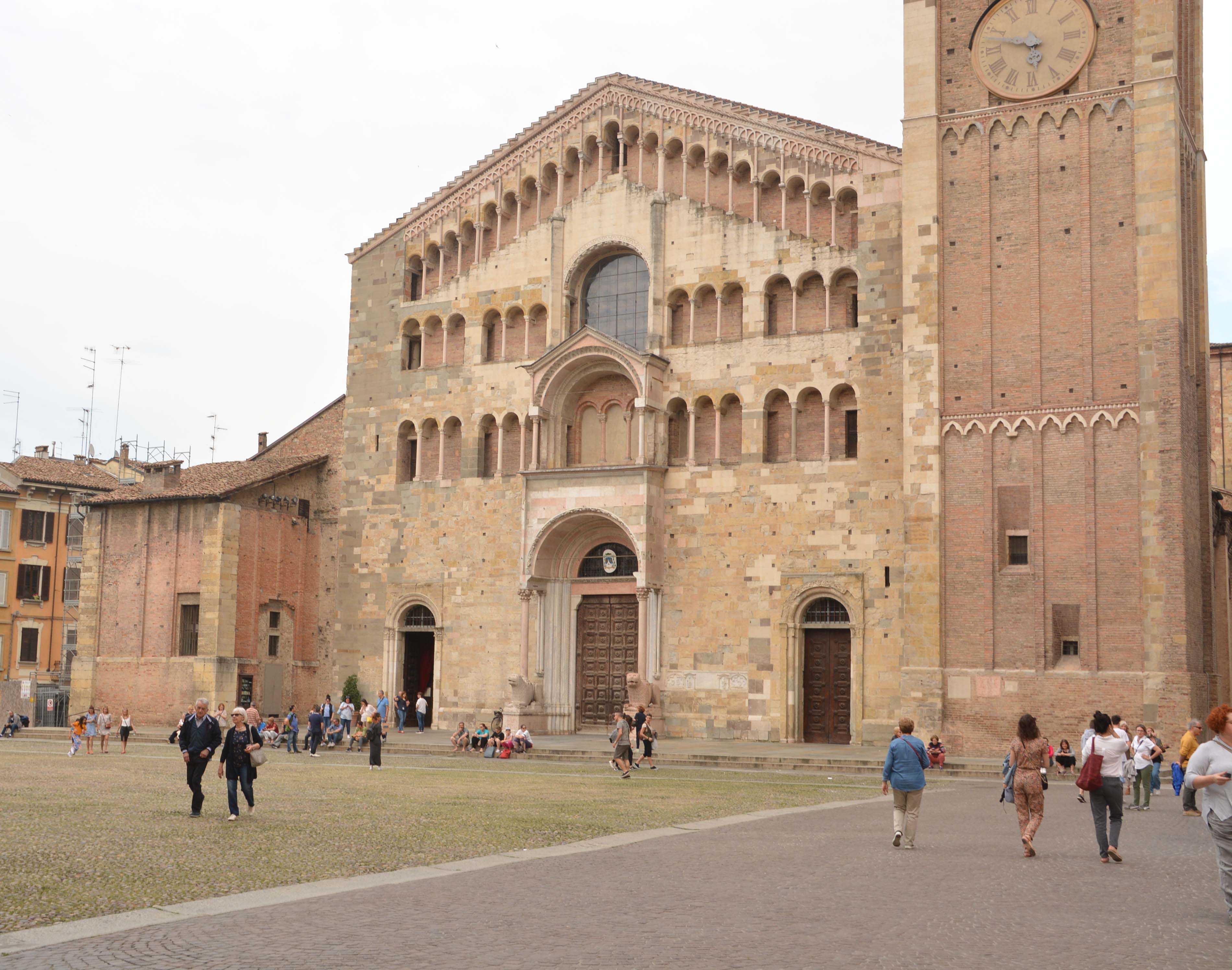 Wir durchstreifen einen Teil der Universitätsstadt (200.000 EW), und finden es ziemlich gemütlich. Es gibt zahlreiche romanische Gebäude, wir besichtigen den Dom von 1106 „Santa Maria Assunta“, das aus rosafarbenem Marmor erbaute Baptisterium, das Opernhaus Theatro Regio – berühmt für seine Verdi-Opern – , den Palazzo des Governatore an der Piazza Garibaldi und die Piazza della Pace mit dem Palazzo della Pilotta der Familie Farnese. Der Fluss Parma fließt ruhig und natürlich durch die Stadt.