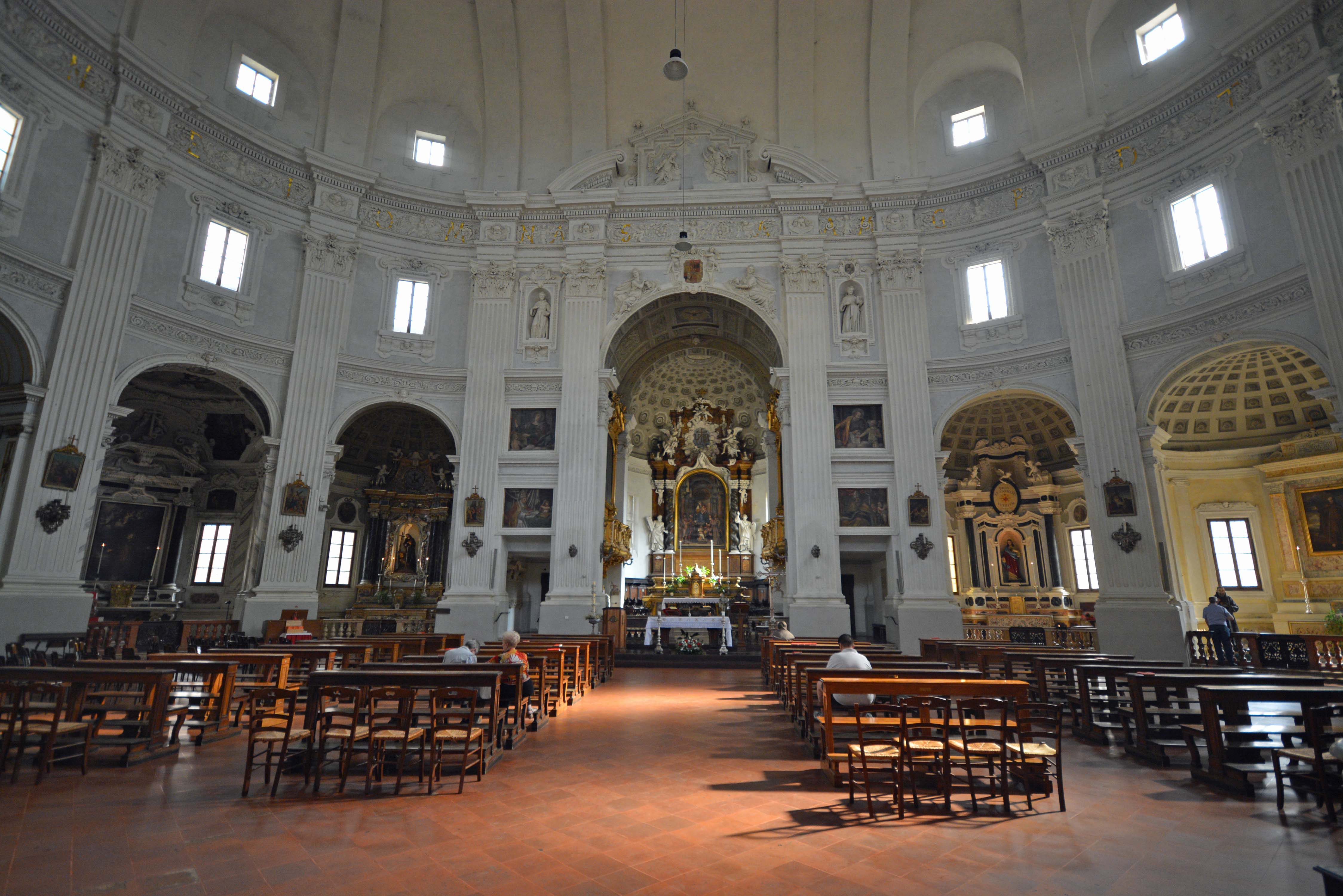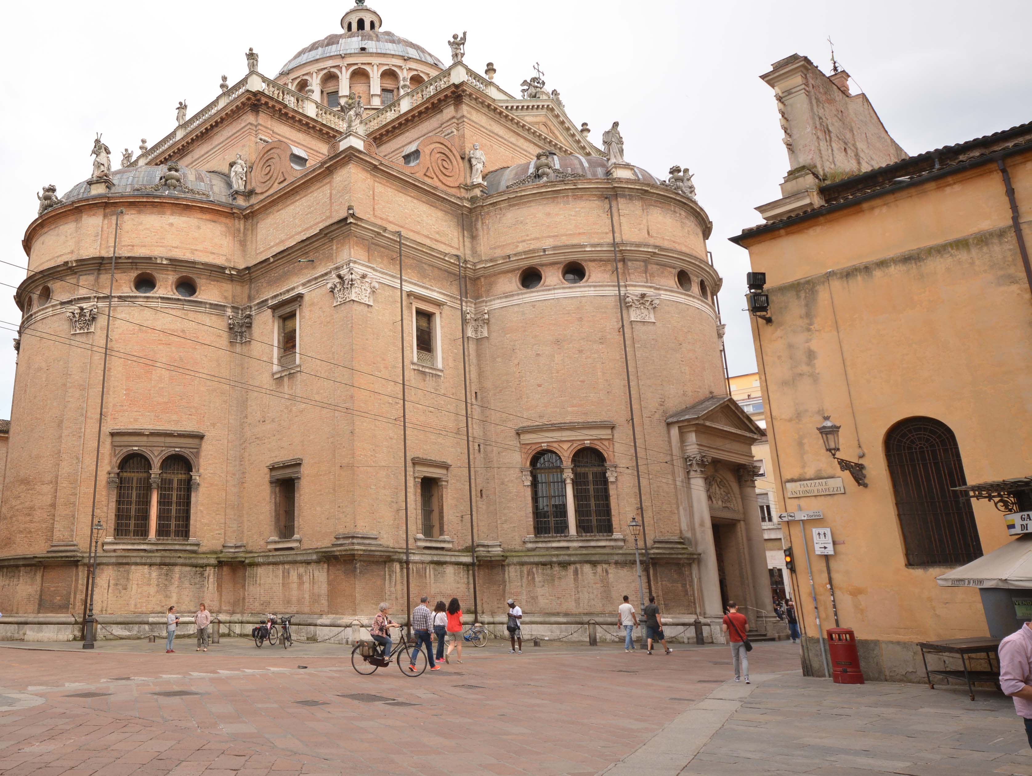 Nach gut 4 km schnurgerader Strecke landen wir im Centro Historico Parmas und stellen unsere Räder an der Chiesa S.S. Annunziata ab. Ein freundlicher Italiener erkennt mich als Touristin (:-) und zeigt mir die Kuppel der Kirche, die in dieser Form die einzige auf der Welt sei. Typisch italienisch, denke ich…..