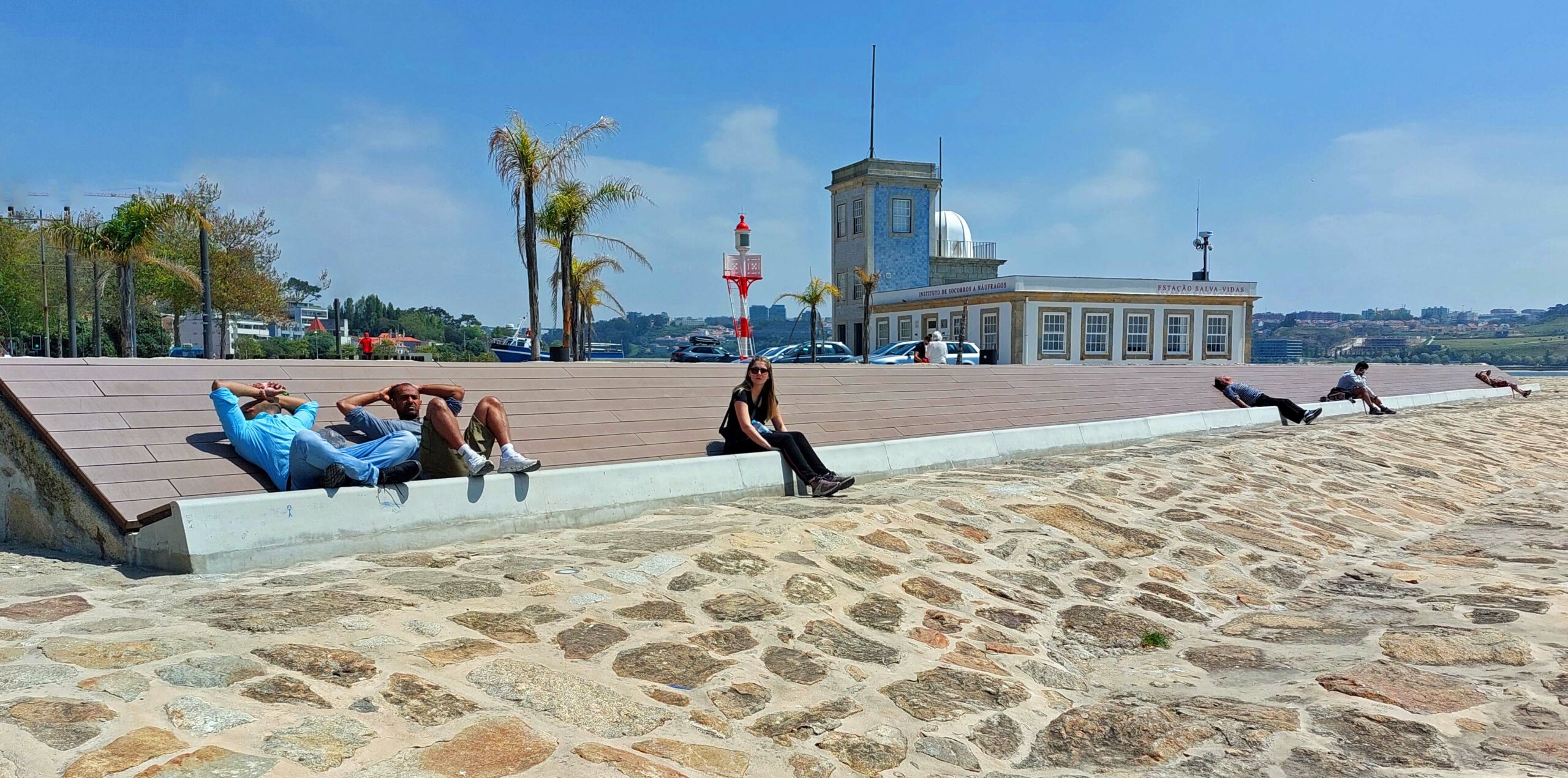 Nachdem ich am Touristenhafen seltsame Wäscheständer entdeckt habe, die Autobahnbrücke ‚Ponte da Arrabida‘ bewundert und ein altes Reparaturdock für die Rabelos gefunden habe, überquere ich den Rio Douro mit dem Wassertaxi und steige an der Haltestelle ‚Infante‘ in die Historische Straßenbahn von 1895!!! Die Strecke führt nach Foz do Douro, einem 4,8 Kilometer entfernten noblen Vorort von Porto. Hier mündet der Rio Douro in den Atlantik. Ich steige beim ‚Jardin do Passeio Alegre‘ aus und rieche sofort die frische Atlantikluft. Das mit Palmen versehene Douro-Ufer führt direkt zum Leuchtturm ‚Farolim de Felgueiras‘. Hier bläst heftiger Wind und peitscht die Wellen hoch. Auf dem Rückweg chille ich auf der längsten Sonnenbank, die ich kenne, und genieße die Rückfahrt mit der Tram zum Börsenplatz.