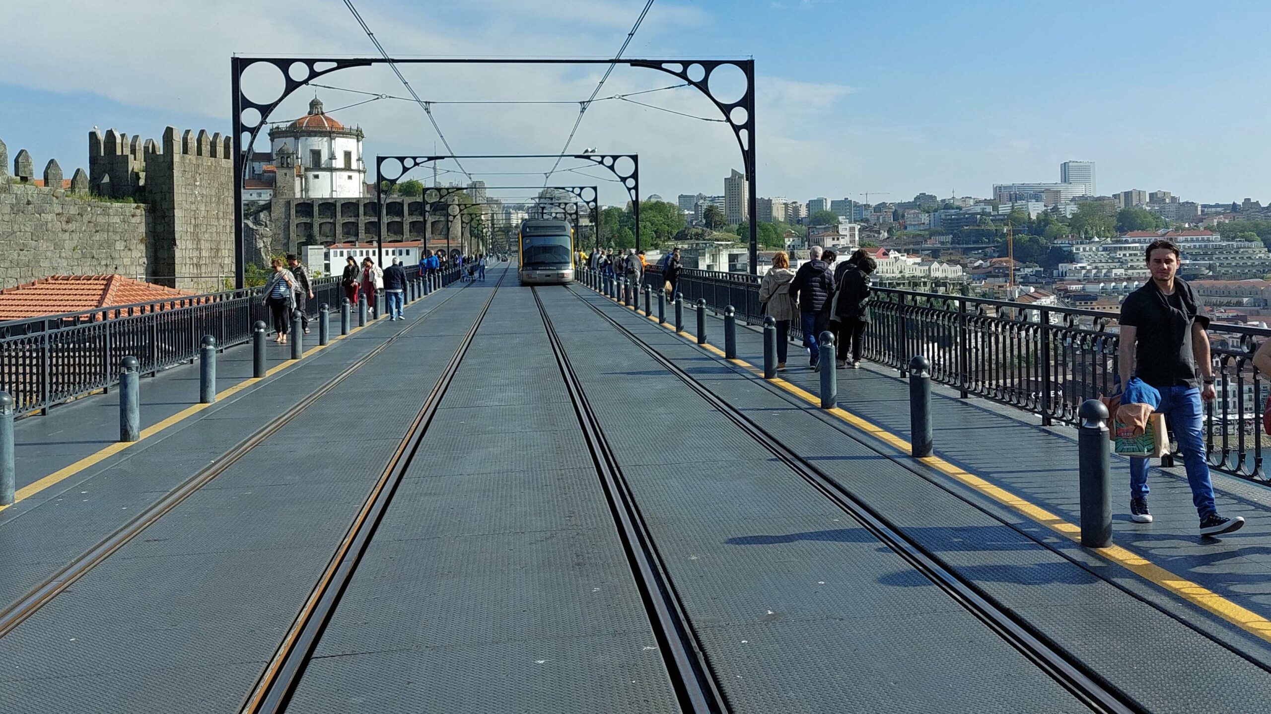 Wieder zurück am Ufer der Altstadt ‚Ribeira‘ entschließe ich mich für den Umweg über die ‚Ponte Dom Luis I‘, der Doppeldeckerbrücke, und plane mit der Seilbahn zu den Weinkellereien hinunterzufahren. Da der Wind aber aufgefrischt hat, wurde der Betrieb eingestellt. Auf dem Fußweg nach unten sehe ich die Brücke in ungewöhnlichen Perspektiven.