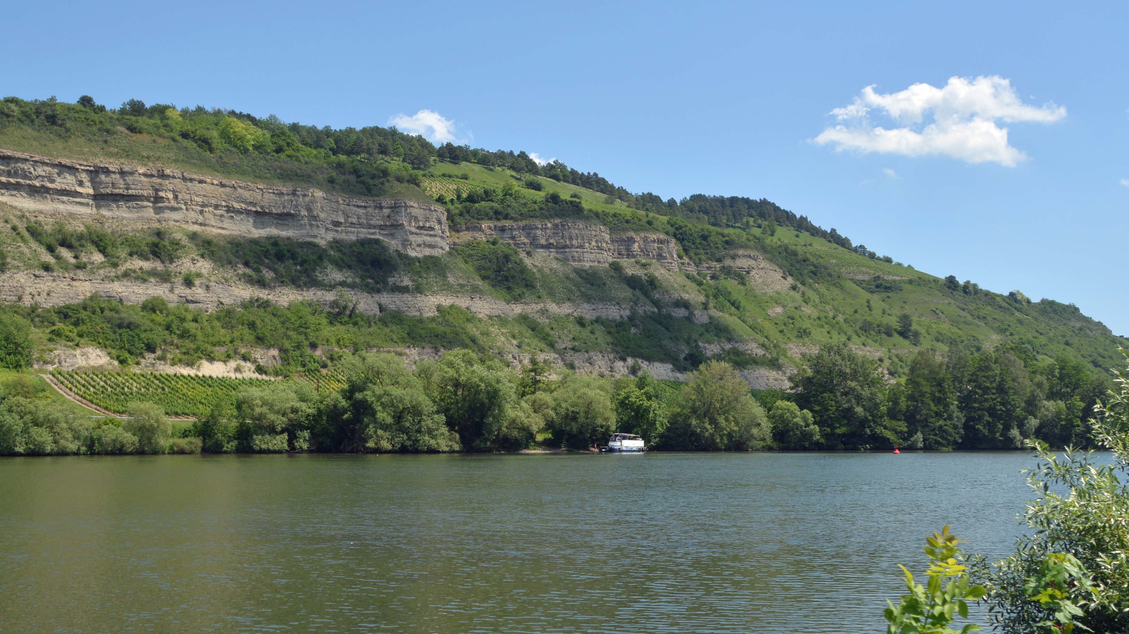 Ich wache nicht rechtzeitig auf – die Dachluken sind wegen der schwülwarmen Luft geöffnet – und so ist Fiete II teilweise gehörig von innen und außen nass geworden! Nach der nächtlichen Aufräumaktion schlummere ich der 9-Uhr-Marke entgegen. Herrliche Sonne weckt mich und dazu das Glockengeläut der Fronleichnams-Prozessionen. Ich frühstücke direkt am Main mit Blick auf das gegenüberliegende Steilufer. Schiffe gleiten vorbei und in diese Idylle platzt der Anruf von H: JuU sind angekommen. Ich radle also zügig die 10,8 km den MainRadweg entlang bis zum Treffpunkt Stellplatz Karlstadt. Mittlerweile ist auch der Rest der Truppe vor Ort und die Neuner-Gruppe damit komplett.