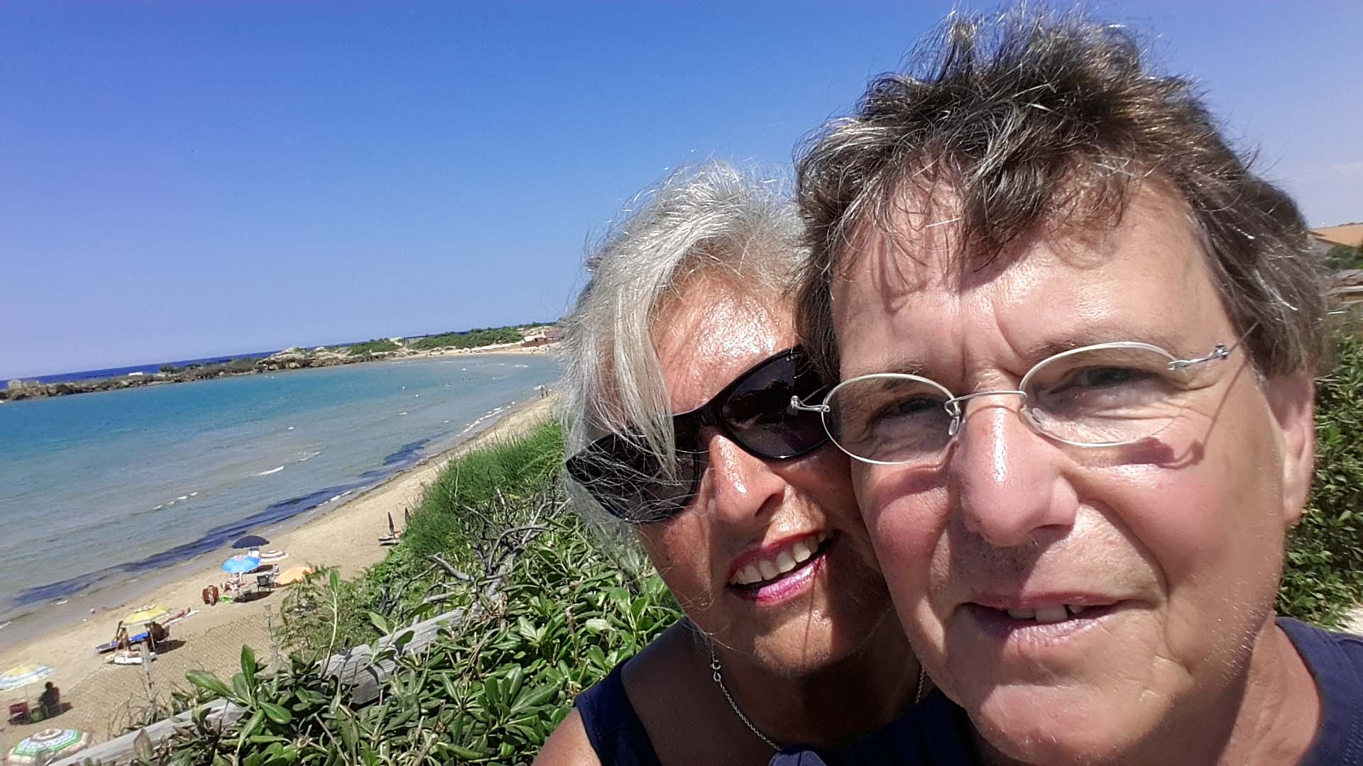 Werde früh wach, denke sofort an einen ruhigen Strandspaziergang und bin enttäuscht. Das Tor zum Strand ist um halbacht noch geschlossen. Ich genieße deshalb die Ruhe auf der Womo-Terasse, die sachten Wellen, die Frühsonne, die Stille und wecke meinen Träumer. Ich habe großen Kaffeedurst. Die Bucht mit ihrem kristallklaren türkisfarbenen Wasser liegt uns zu Füßen. Der goldfarbene feine Sandstrand erwacht gemächlich zum Leben. Mit einem herrlichen Frühstück läuten wir unseren vorletzten Tag auf ‚La bella Sicilia‘ ein. Klaus gefällt es hier so gut, dass er einen ‚Genießertag‘ auf dem Campingplatz vorschlägt. Einverstanden!