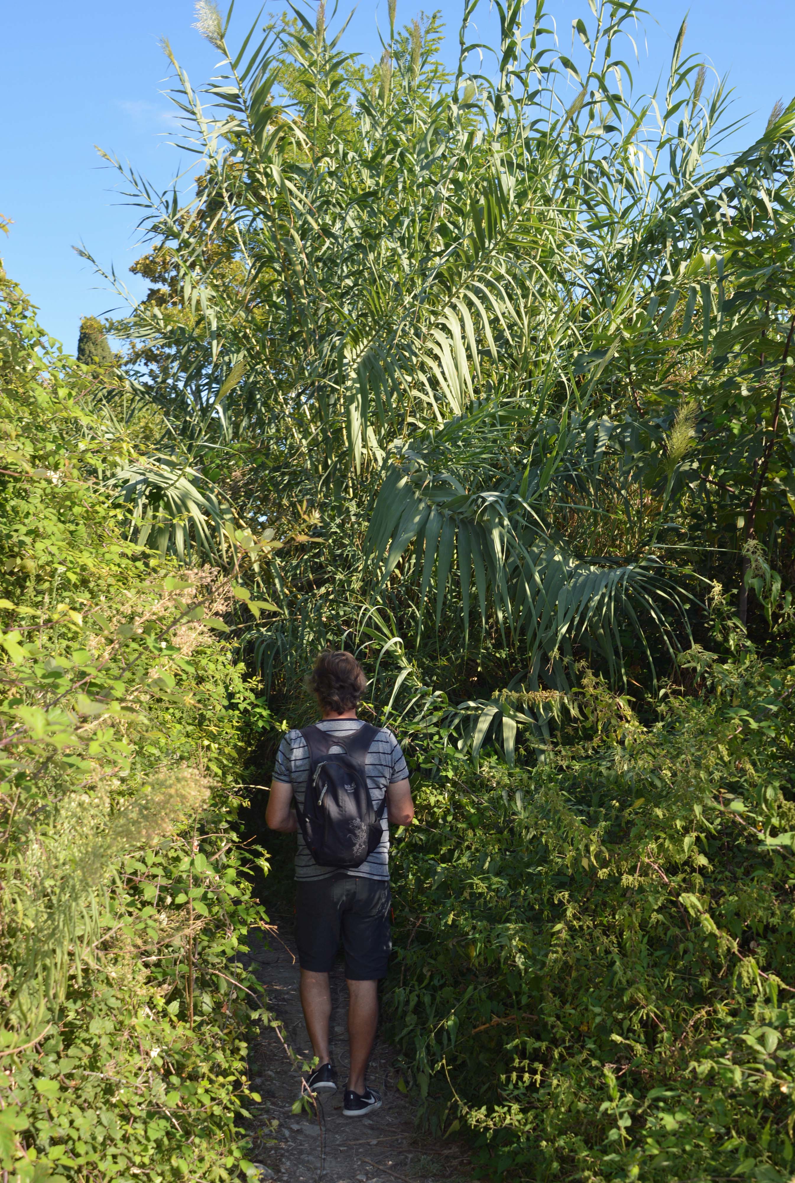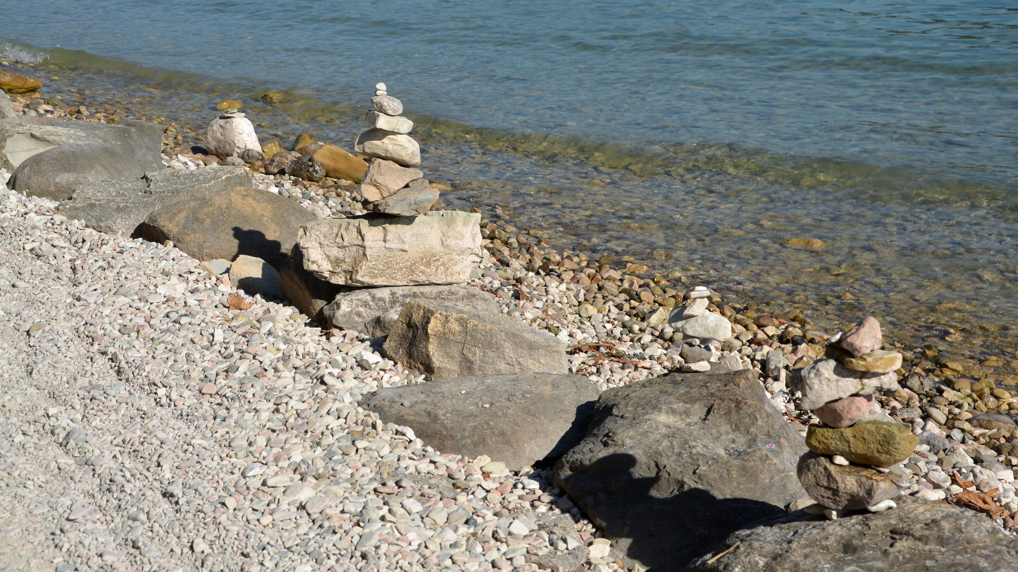 Also machen wir das, was schon andere Radler vor uns gemacht haben, wir lassen die Zweiräder stehen und laufen per Pedes weiter. Mountainbiker, die uns entgegenkommen, sind ziemlich angefressen. Mit den Rädern gibt es kein Durchkommen, denn es handelt sich bei diesem Fleckchen um strengen Privatbesitz. Also laufen wir durch dichte Laub- und Nadelbäume und einen breiten Schilfgürtel. Und dann liegt der für den Philosophen Agostino di Brenzone „schönste Ort der Welt“ vor uns. Was wir so nicht bestätigen können. Aber, dass hier der Punkt liegt, wo sich der nördliche vom südlichen Gardasee trennt, das ist unbenommen.