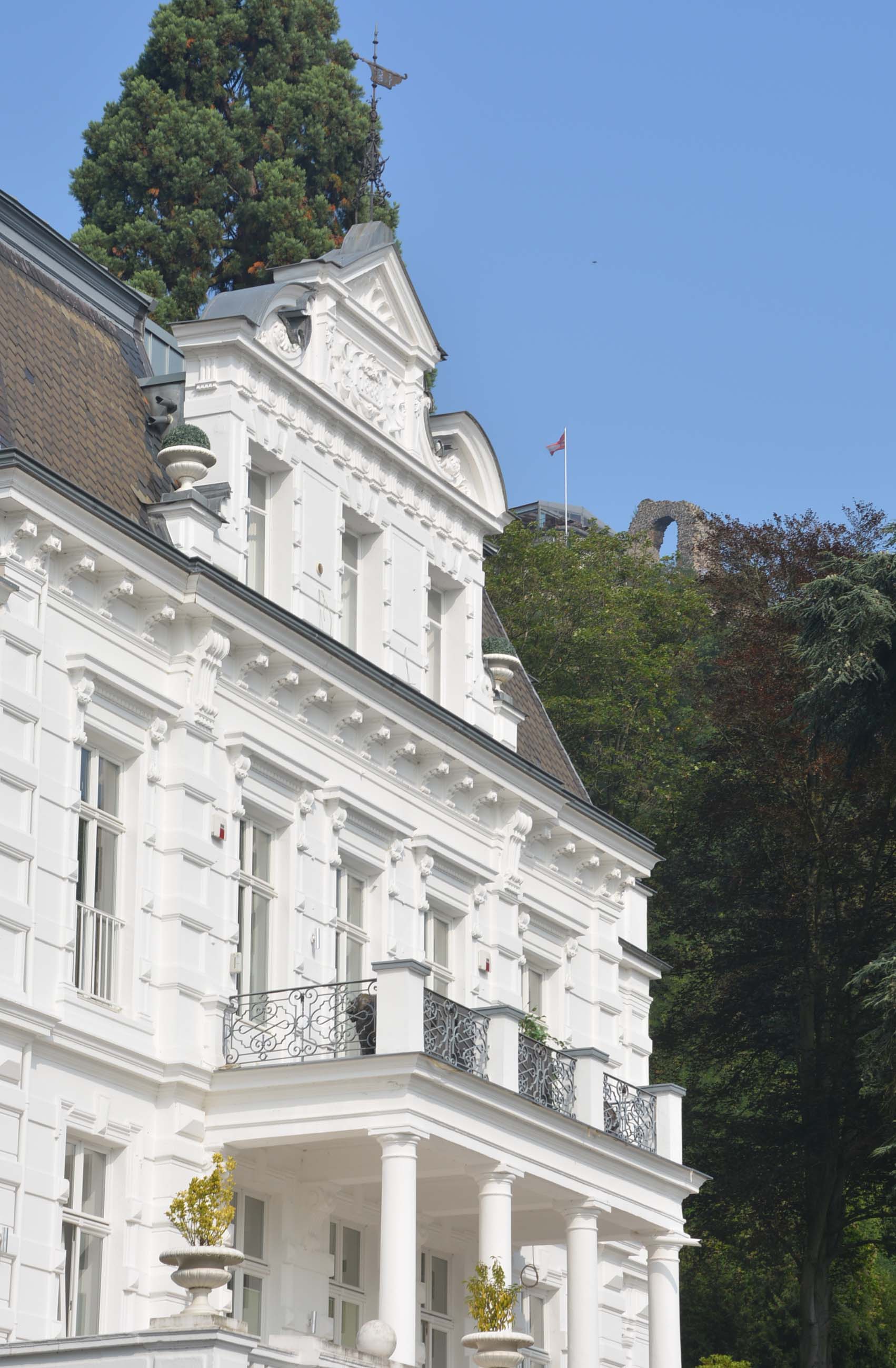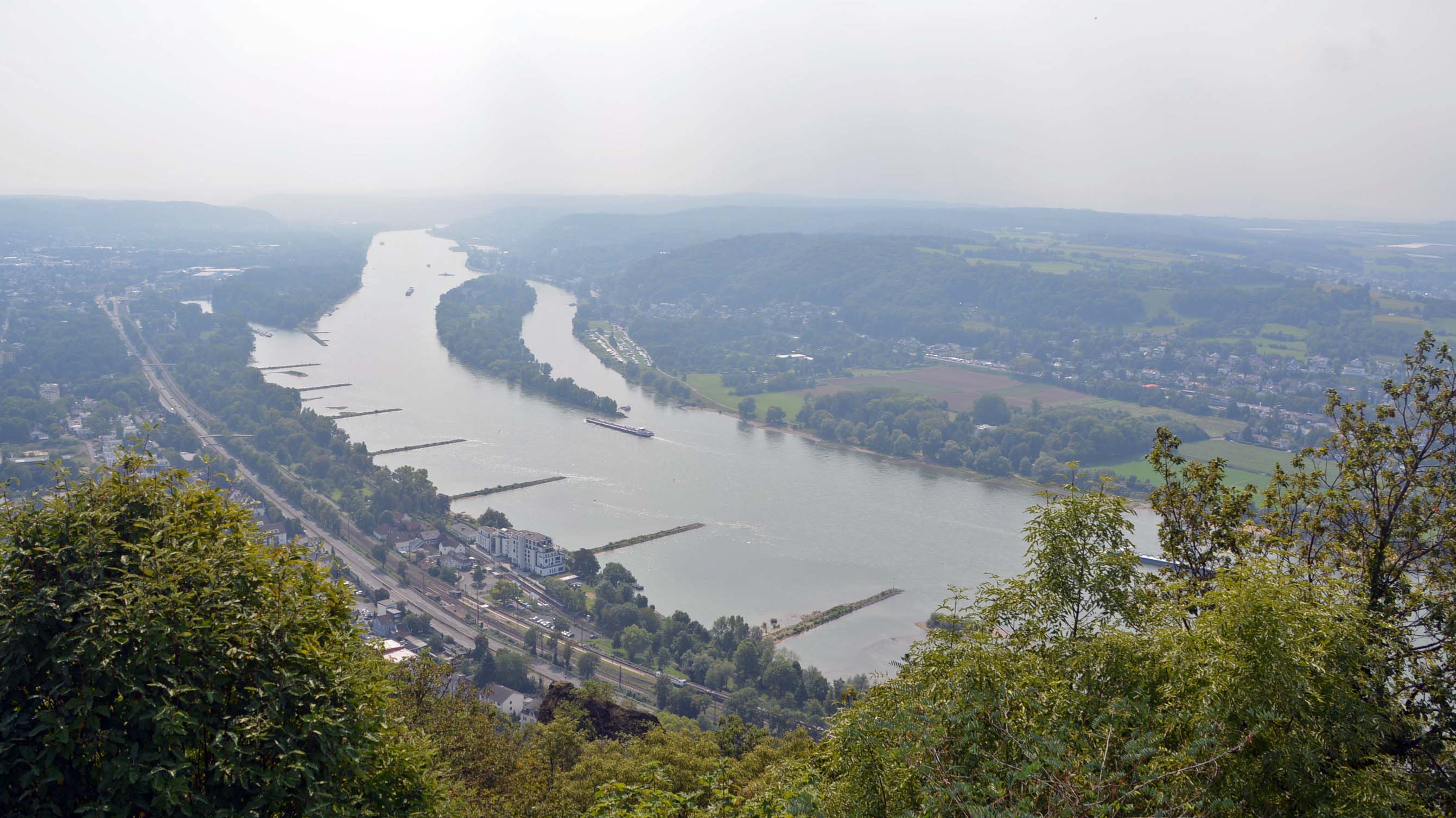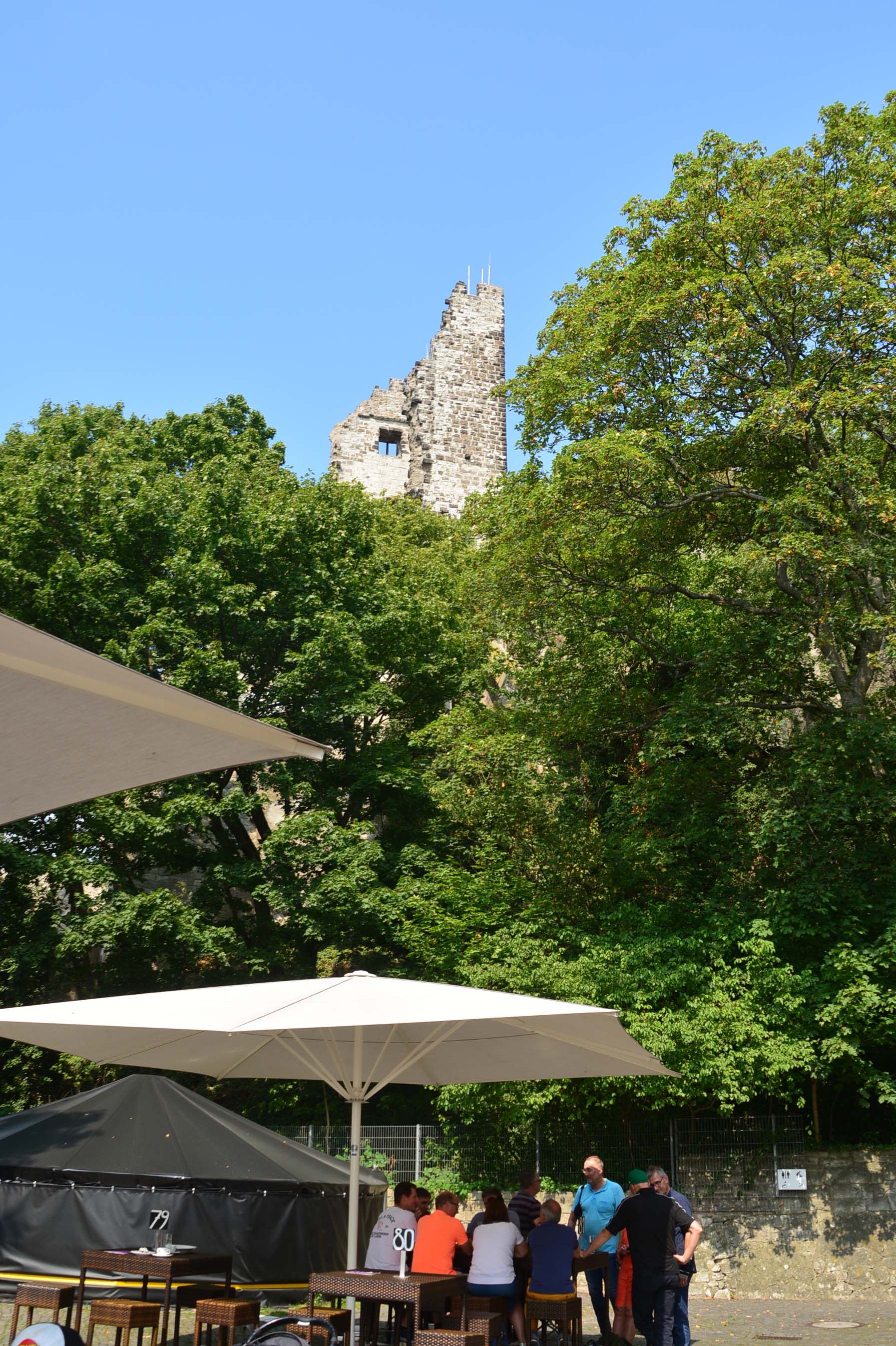 Jetzt geht’s zu Fuß zur Zahnradbahn. An der Mittelstation liegt Schloss Drachenburg. Auf dem supermodernen Drachenfelstableau angekommen geht’s direkt zur Aussichtsplattform. Leider ist es sehr diesig und die fantastische Aussicht nur eingeschränkt zu genießen. Aber die beiden Rheininseln Grafenwerth und Nonnenwerth können wir erkennen. Ute und Jo besteigen noch die Drachenfelsruine auf der Suche nach Siegfried, dem Drachentöter, der Rest chillt. Schon irre, dass Karl der Große genau hier eine Weindomäne erworben haben soll!