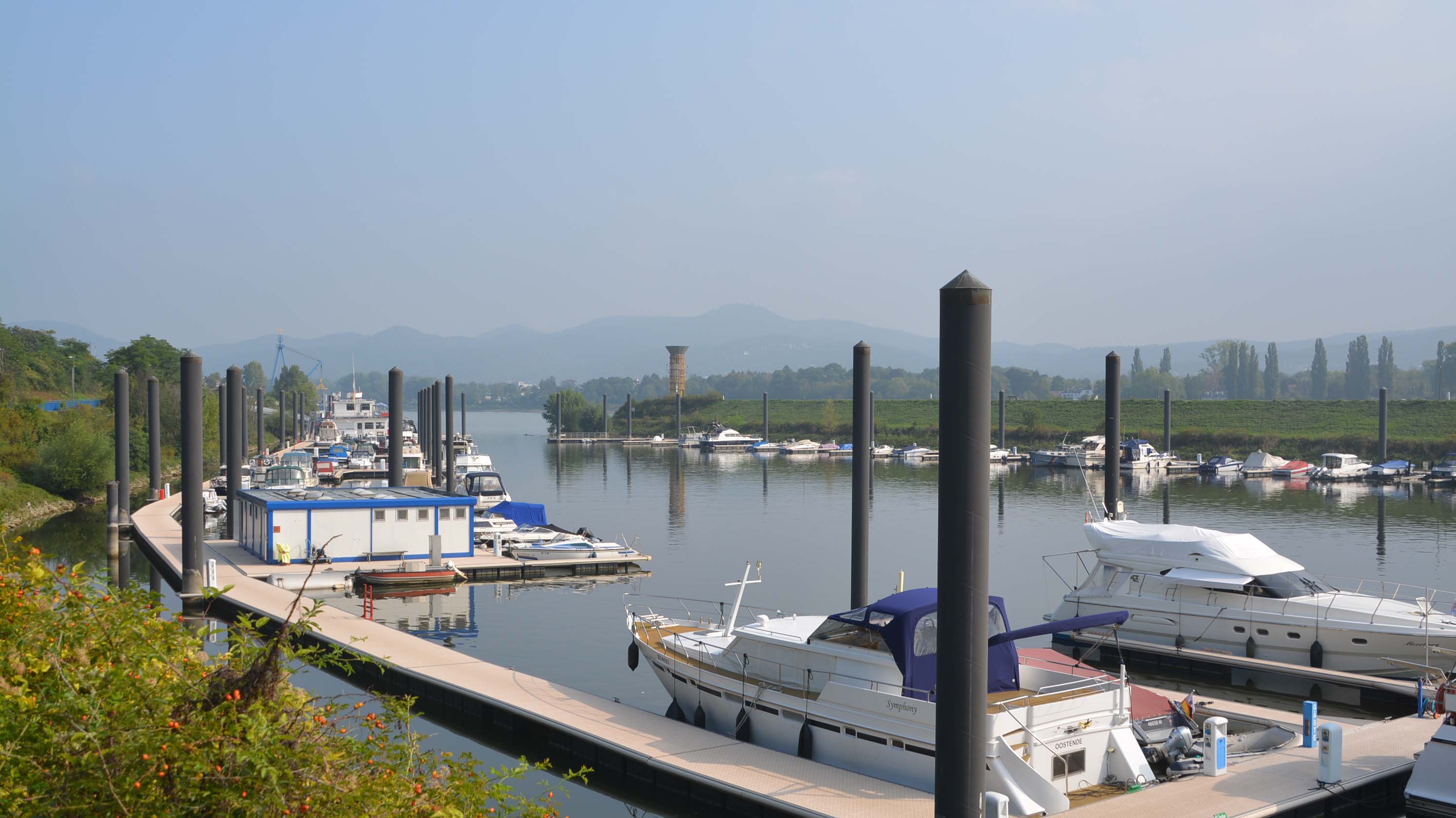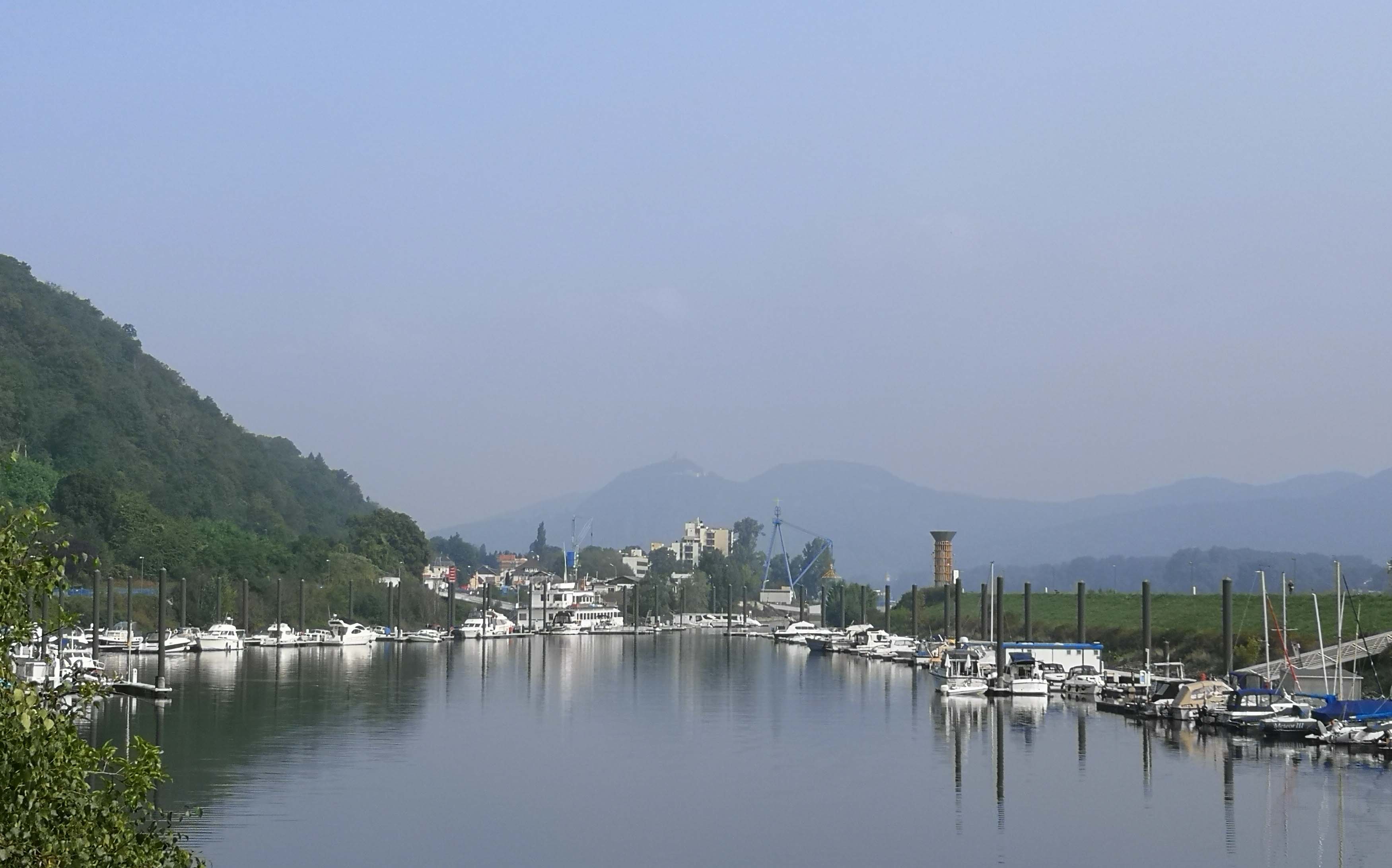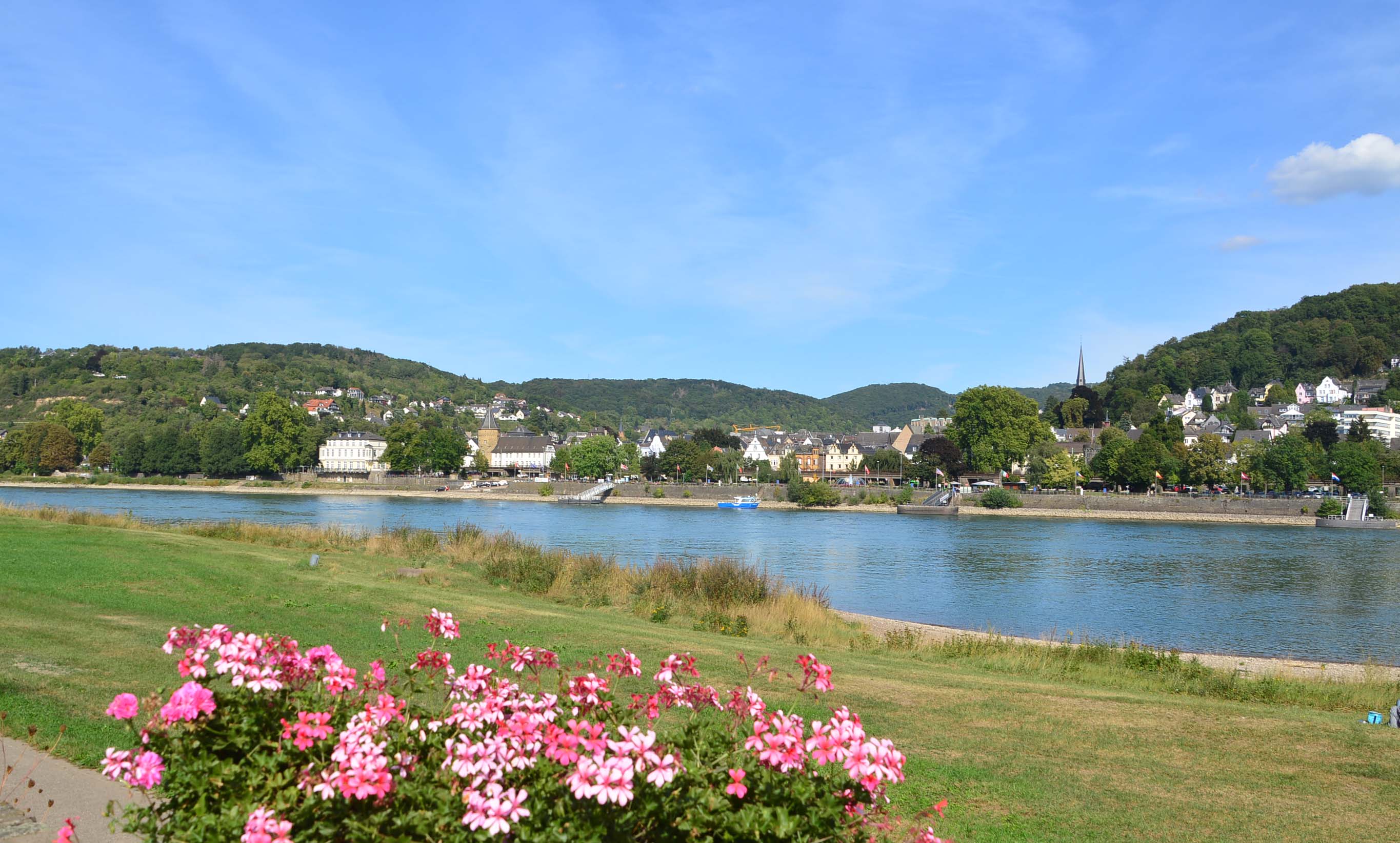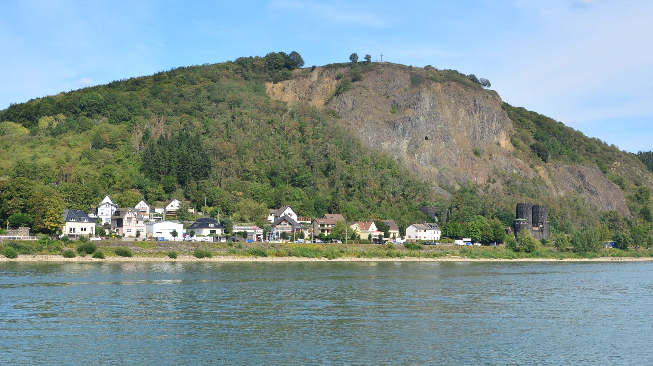 Wir holen den Womofahrer am Remagener Camping ‚Goldene Meile‘ ab, und touren zu sechst den Rhein entlang. Rechtsrheinisch liegen Burg Ockenfels, Unkel und Bad Honnef. Wir passieren Oberwinter mit Blick auf das Siebengebirge und seinem großen Yachthafen. Einer der Sieben Berge ist der 321 Meter hohe Drachenfels, auf den die älteste Zahnradbahn (seit 1883) täglich zahlreiche Touris bringt. Auf der Fahrt neben der B9 können wir den Rolandsbogen sehen, Symbol der Rheinromantik und ein Überrest der Burg Rolandseck.