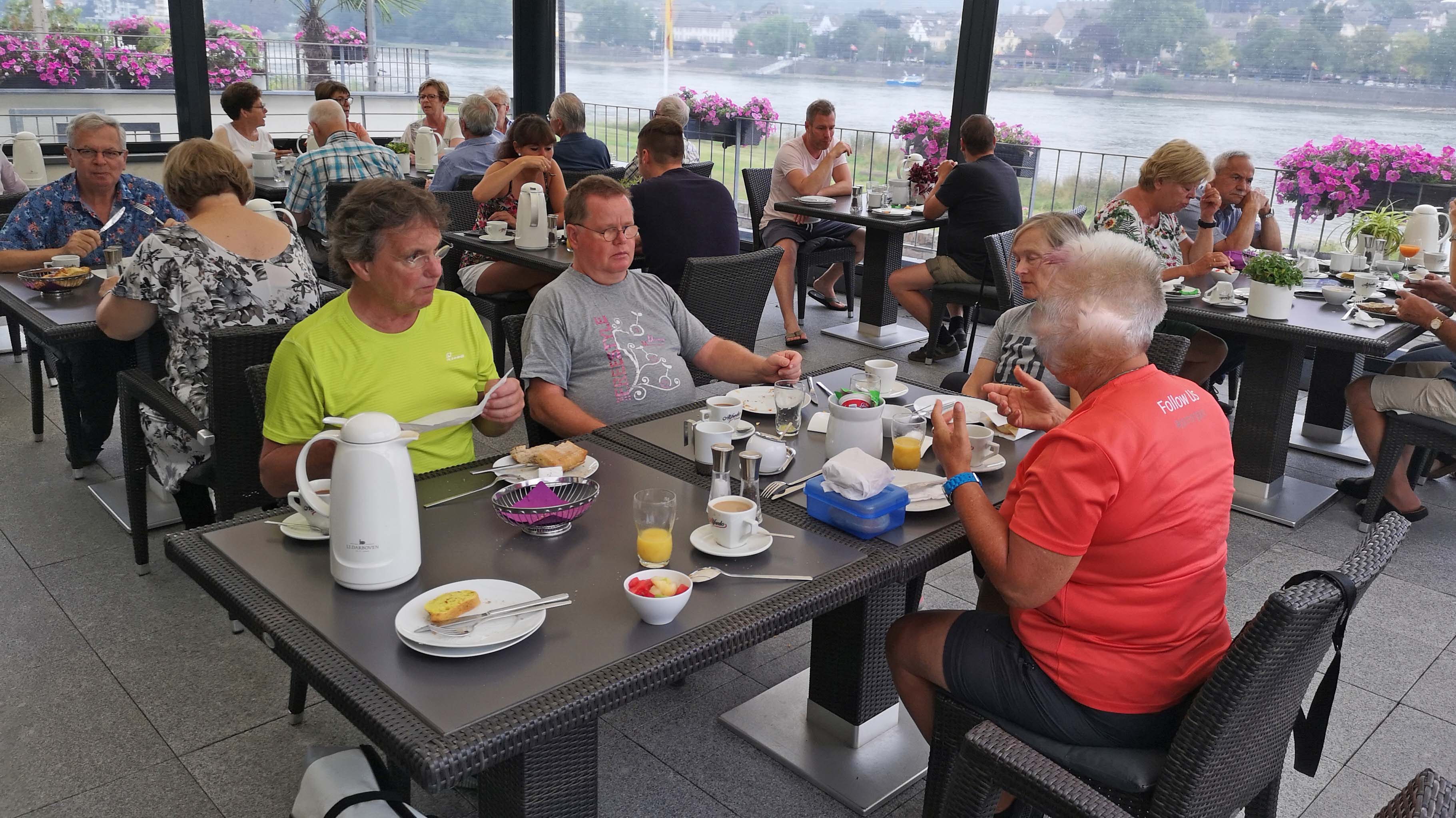 Die Zahnradbahn bringt uns wieder nach Königswinter und hier setzen wir unmittelbar mit der Fähre wieder auf das linksrheinische Ufer über. Auf der Rückfahrt nach Remagen entdecken wir einen herrlich gelegenen Biergarten. Runter von den Rädern und ran an die kalten Getränke. Danach radeln wir beschwingt zum Hotel. Ich versuche nochmal mein Glück mit dem Lenkerkörbchen in einem Remagener Radladen. Auch hier ist es den Verkäufern ein Rätsel, warum eine Frau einen k l e i n e n Lenkerkorb möchte! Enttäuscht ziehe ich von dannen. Gespeist wird heute Im Brauhaus, deftig, aber gut.