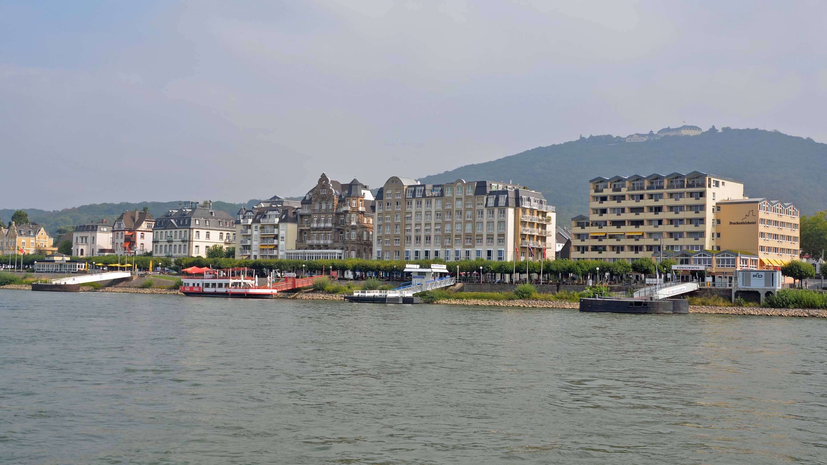 Gegenüber des Siebengebirges liegt Bad Godesberg, ein Stadtteil der ehemaligen Hauptstadt Bonn. Hier setzen wir mit der Fähre von Bad Godesberg-Mehlem nach Königswinter in NRW über. Die Stadt liegt zu Füßen des Siebengebirges mit dem 330 Meter hohen Petersberg, der als Standort des Bundesgästehauses vielfach Stätte von Konferenzen mit nationaler und internationaler Ausstrahlung wurde.