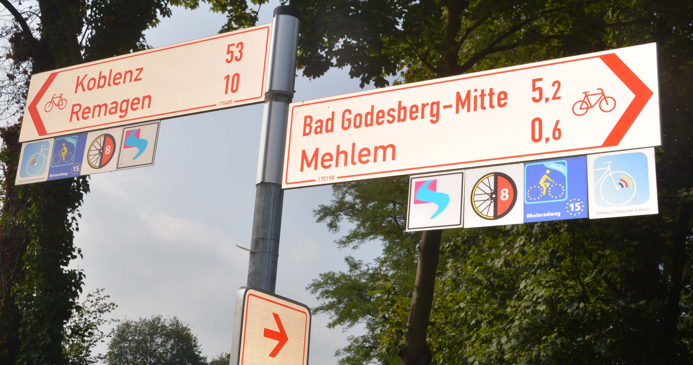 Wir frühstücken zur üblichen Zeit und entscheiden uns für eine Tour von Bundesland zu Bundesland. Start ist Rheinland-Pfalz und Ziel Königswinter in NRW. Hier wollen wir zum gefühlt hundertsten Mal mit der Zahnradbahn den Drachenfels erklimmen. Die unsichtbare Grenze von Bundesland zu Bundesland sind an den Fahrradschildern zu erkennen: grün sind sie in Reinland-Pfalz, rot in NRW.