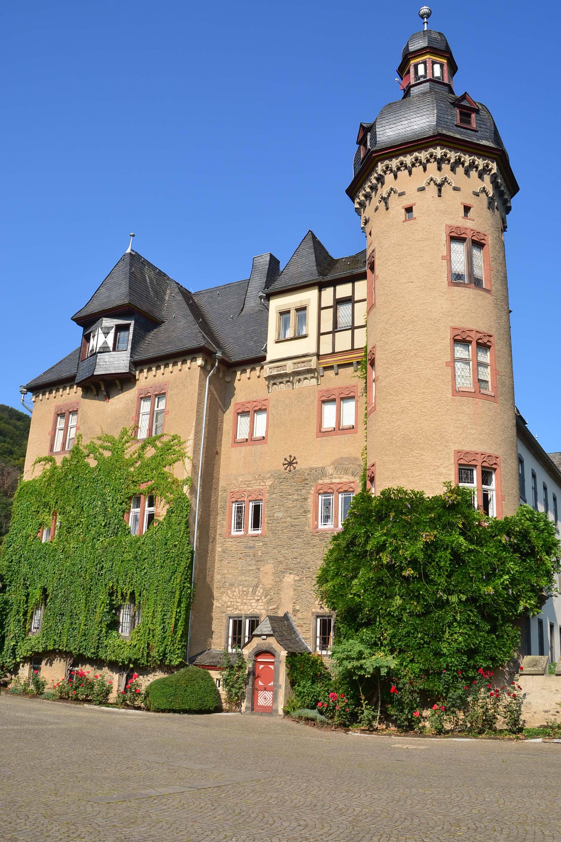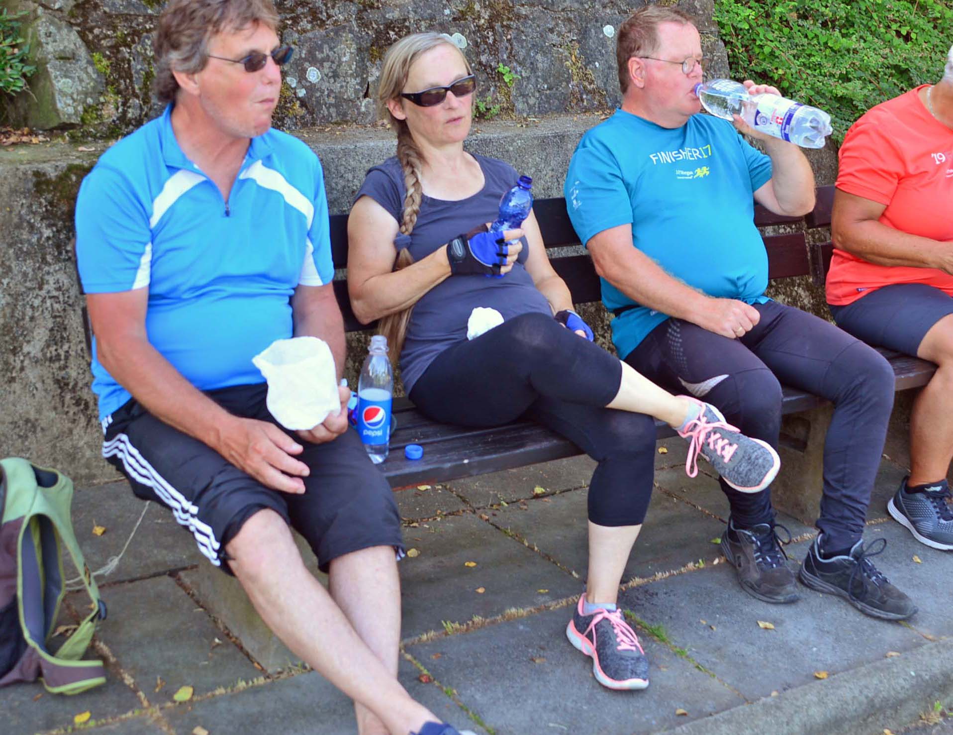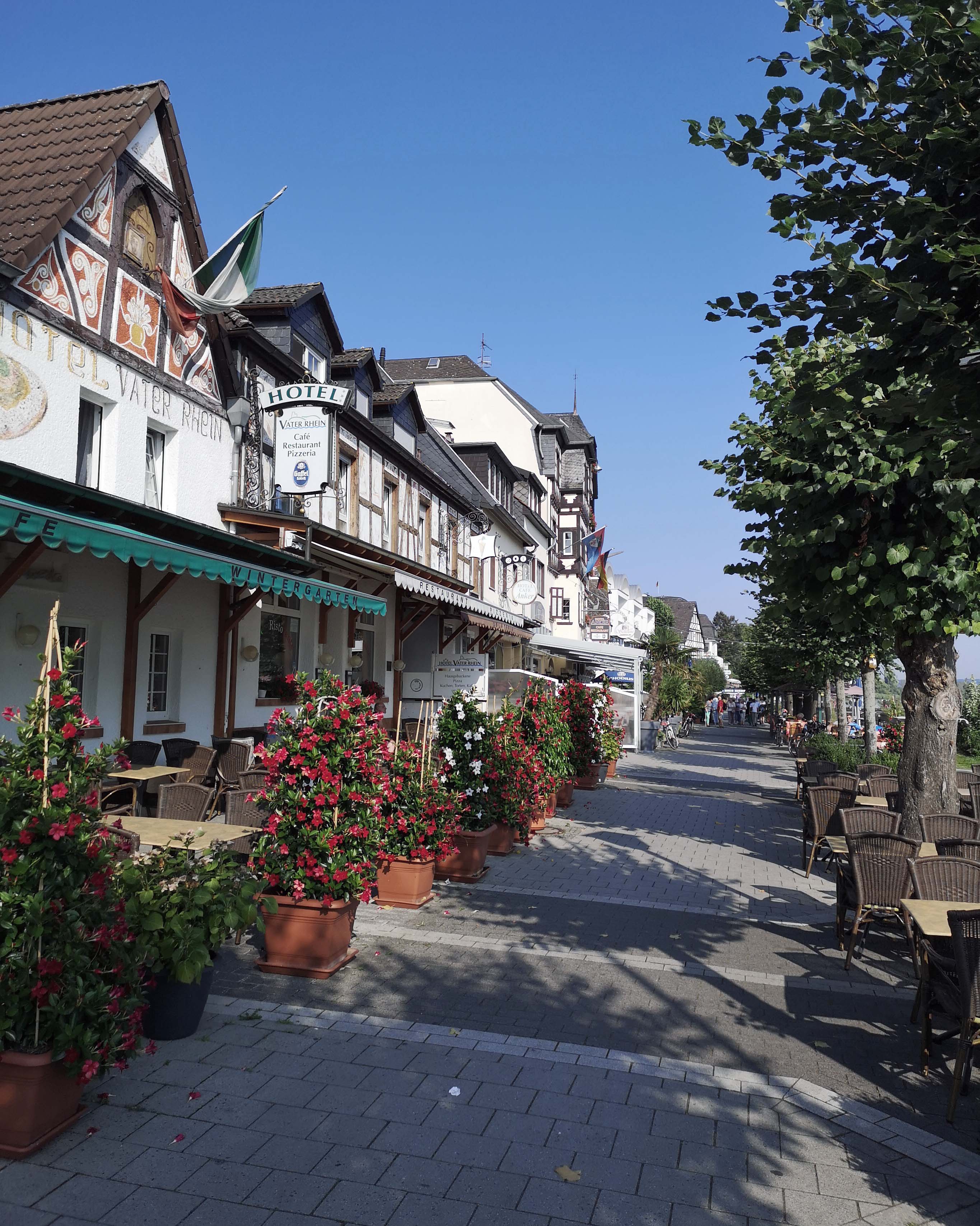 Den Langstreckenradlern dürstet es nach dem üblichen Bier und Radler. Dafür steuern wir einen direkt am Rhein gelegenen Biergarten an. Danach geht’s für heute zum letzten Mal auf die Räder und wir fahren die restlichen Kilometer zu unserem Hotel. Leider haben wir dieselben Zimmer, wie auf der Hinfahrt und sind ein bisschen verärgert. Ich habe auf eines spekuliert, dass den Zügen nicht ganz so nah ist. H. kommt schnell in den Chill-Rhythmus, und ich fülle an der Rhenser Quelle für morgen die Getränkeflaschen.