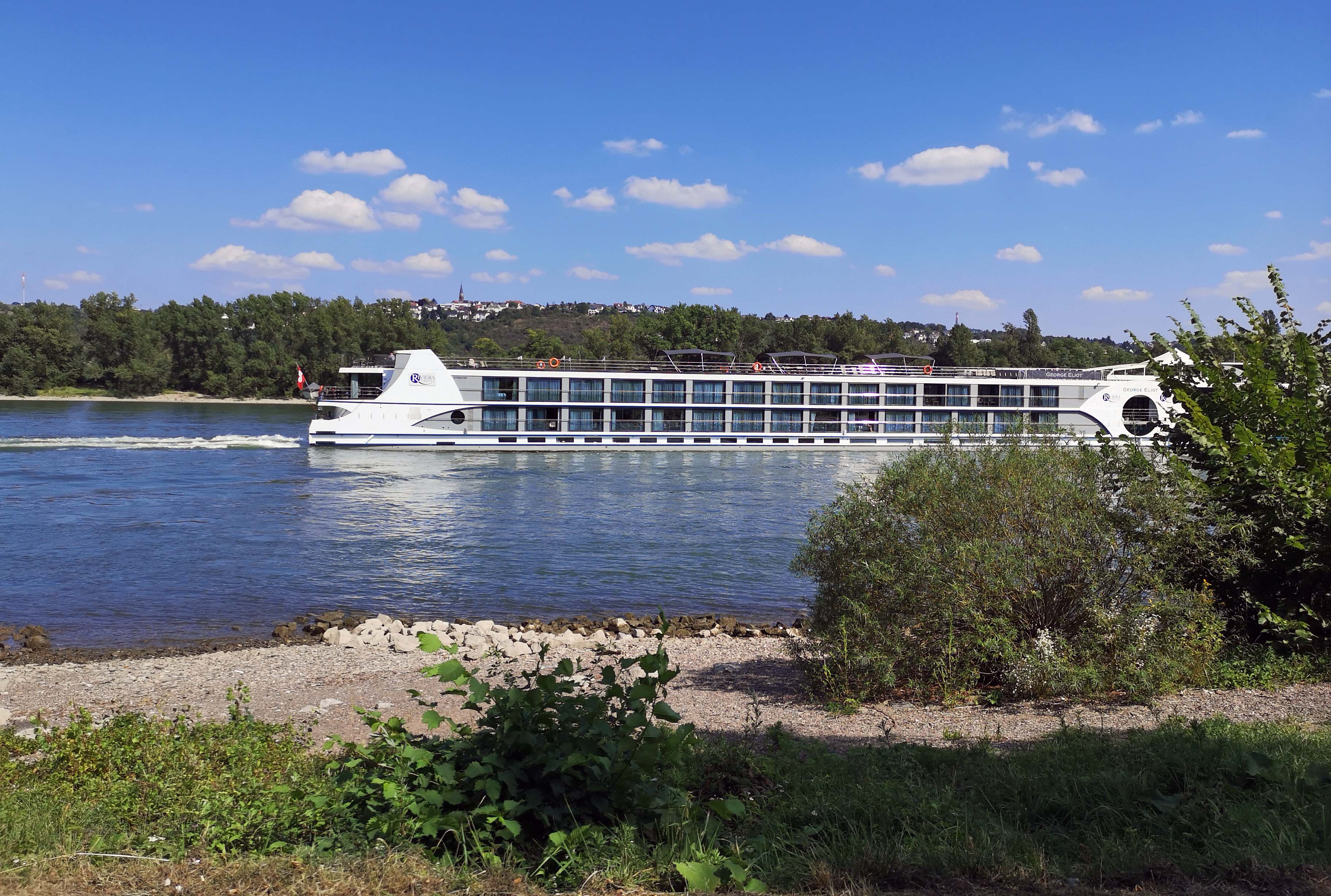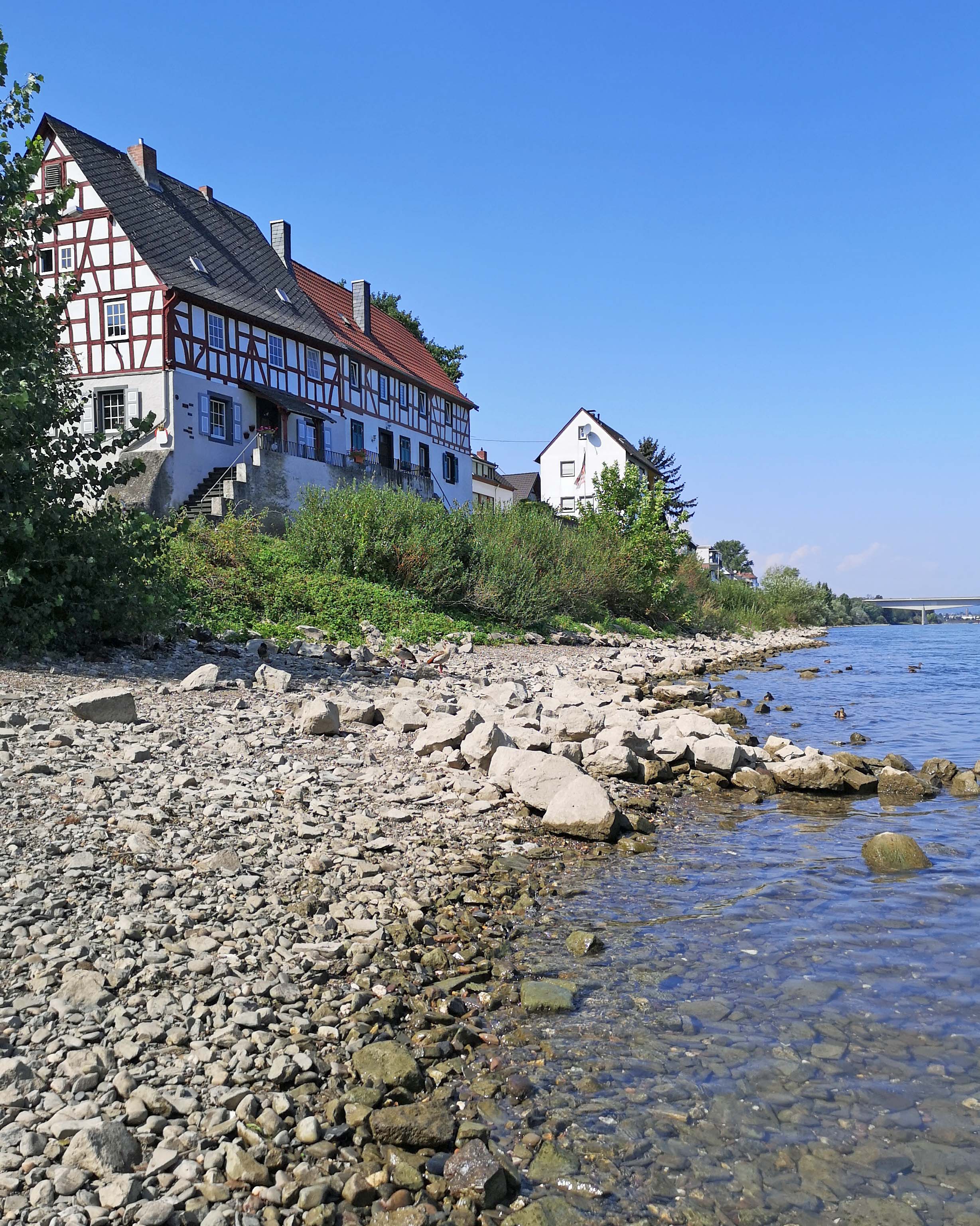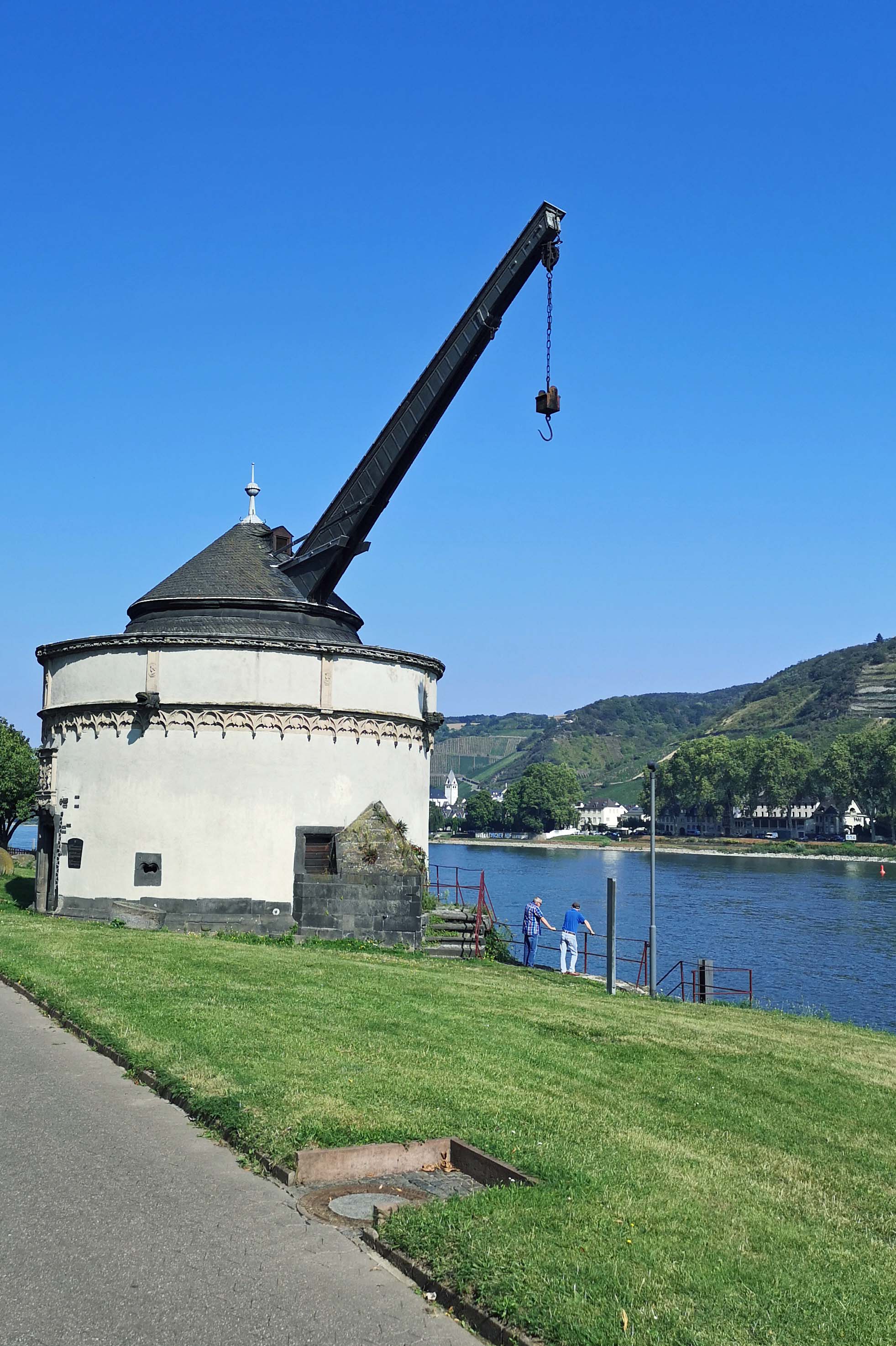 Wir finden einen perfekten Pausenplatz, wo wir gemütlich essen, das Rheinwasser nochmal testen und vor allem viiieeel trinken. Danach passieren wir den drehbaren ‚Alte Kran‘ von Andernach, der zum Verladen von Eifelgestein. Der Womo-Fahrer hat zwischenzeitlich die Remagener ‚Goldene Meile‘ verlassen und kommt uns am Koblenzer Deutschen Eck entgegen geradelt.