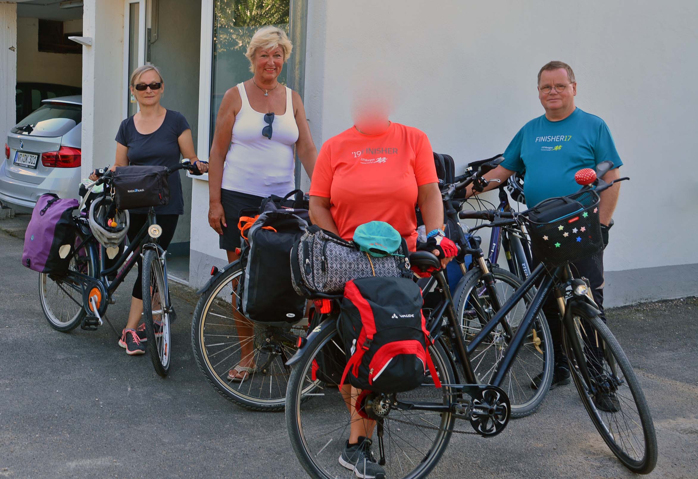 Wir frühstücken wieder um halbneun und laden unser Gepäck. Die Sonne strahlt von einem stahlblauen Himmel. Allerdings haben wir mit starkem Gegenwind und einer längeren ‚Hubbelstrecke‘ zu kämpfen. Da wir mega gut eingefahren sind, meistern wir diese Schwierigkeiten mit links.