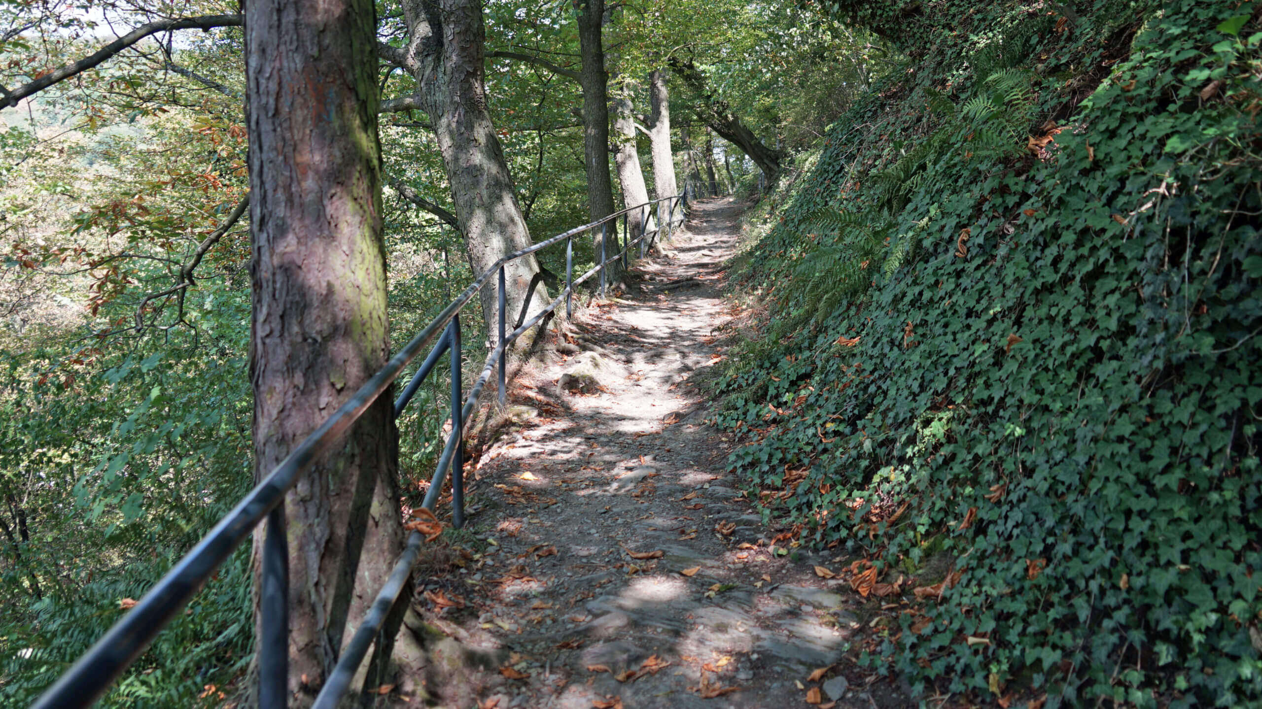 Es ist schwülheiß und drückend, aber mein Vorhaben ziehe ich durch. Der Einstieg in den Weg zur Burg ist offenbar geheim. Ich fahre mit dem Rad mehrfach vorbei und auch der Versuch zu Fuß scheitert. Fragen hilft, ich bekomme eine präsise Beschreibung und endlich liegt der Weg und ein klitzekleiner Hinweis dazu vor mir.