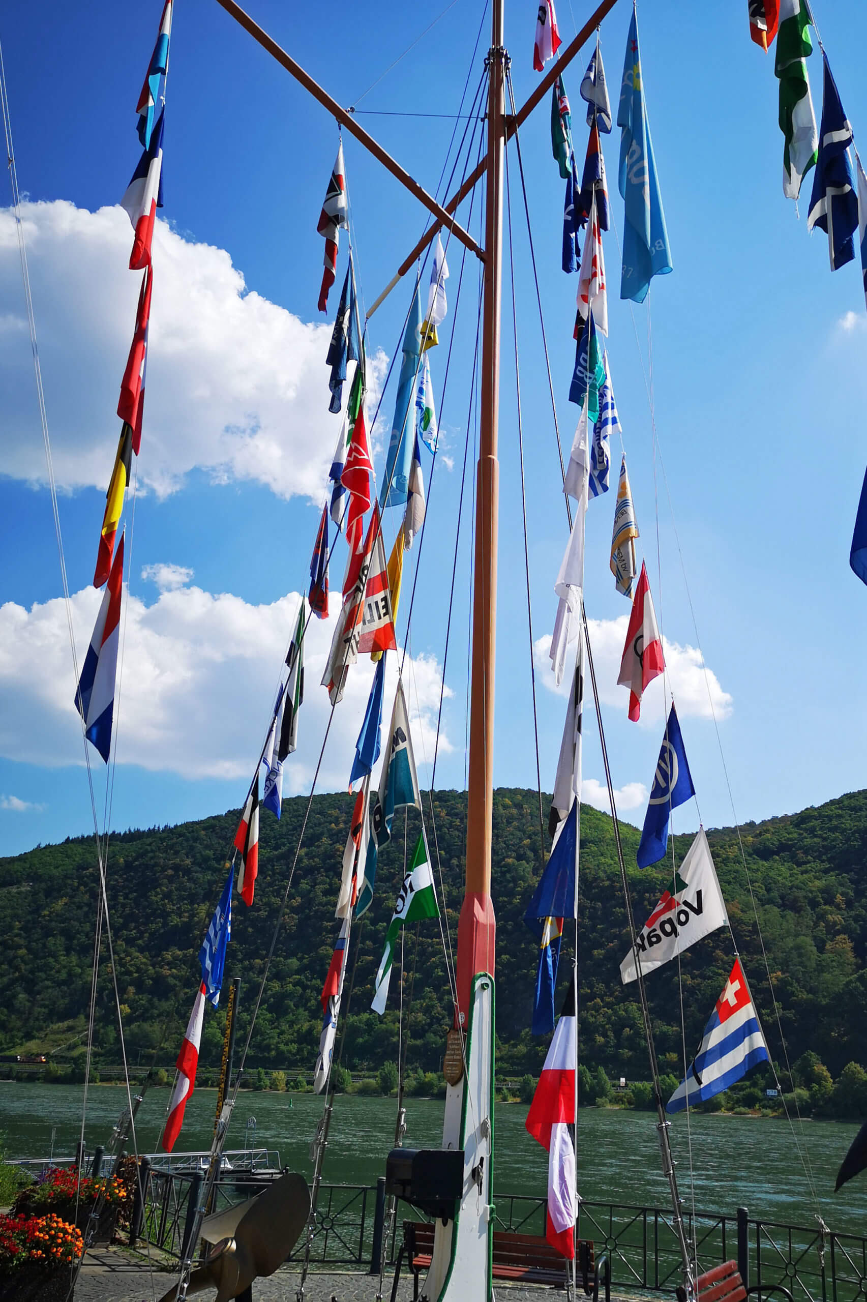 Ich komme nur langsam in die Puschen und starte erst um Viertel nach 11. Erster Halt ist Spay. Der kleine Ort liegt schräg gegenüber der Marksburg und ist derjenige mit den meisten Fachwerkhäusern im ganzen Mittelrheintal. Nach dem Motto „Fahr‘ nicht vorbei an Spay“ halte ich an einer vierteiligen goldfarbenen Schiffsschraube und einer für die Orte am Mittelrhein typischen Fahnenstangen-Kombination zu Ehren der Schifffahrt und zur Zierde der Heimat. Die Hochwasserstände sind auf einer Tafel festgehalten. Ich banne die ersten Fotos von der wunderschön gelegenen Marksburg auf der rechtsrheinischen Seite auf die Speicherkarte.
