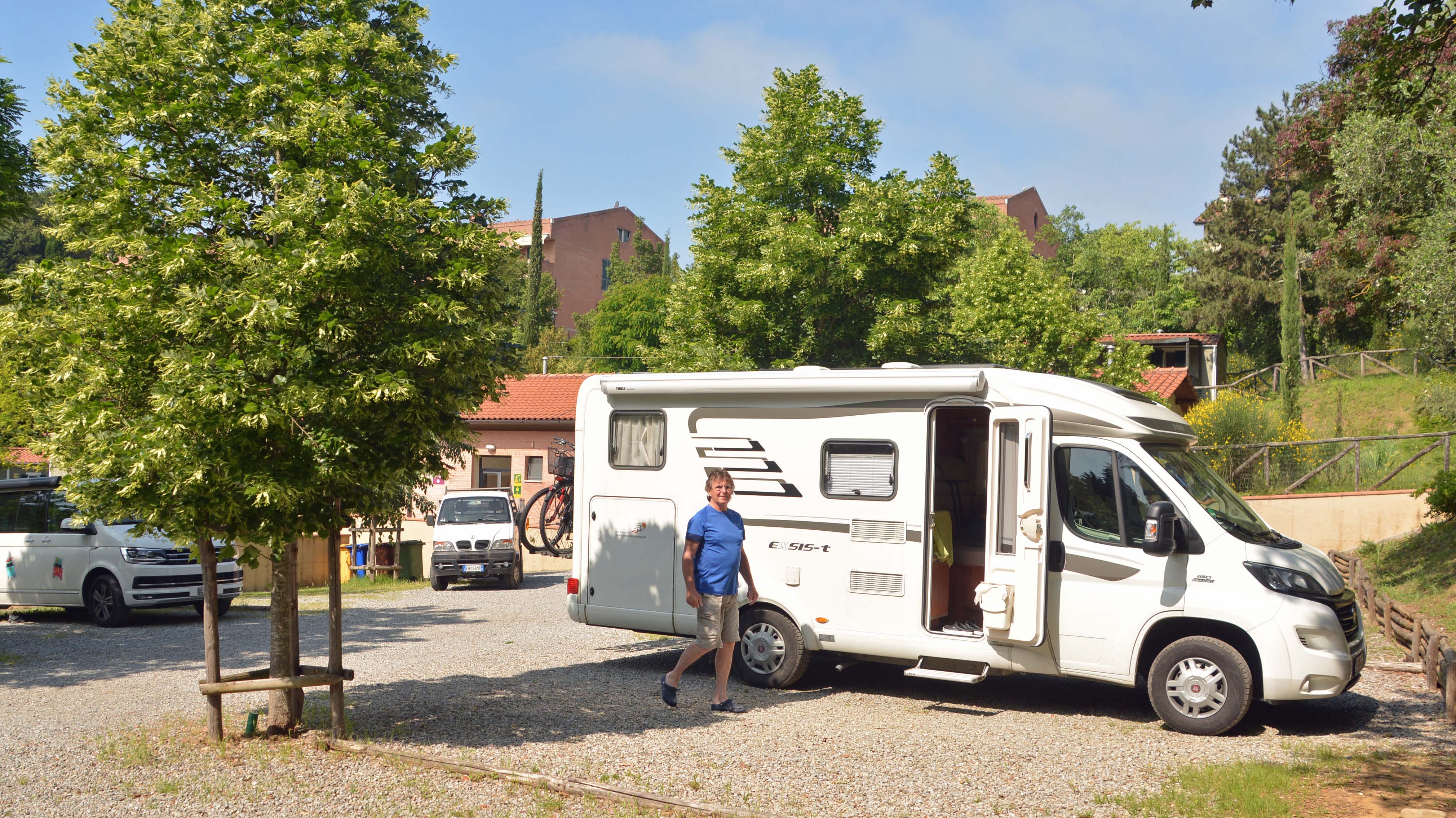 Früh die Hühner gesattelt: Wir sitzen um halbneun beim Frühstück. Camping Colleverde hat strenge Regeln, wir müssen vor 11 Uhr den Platz verlassen. Es ist bewölkt und Hochnebel. Heute geht es ans Tyrrhenische Meer, über Volterra nach Castiglioncello. Das liegt 20 Kilometer südlich von Livorno. Da soll die Sonne scheinen. Wir wollen abseits allen Trubels auf einem Agricampeggio, der Olivenöl aus eigener Produktion verkauft, die Nacht verbringen. Es bleibt spannend.