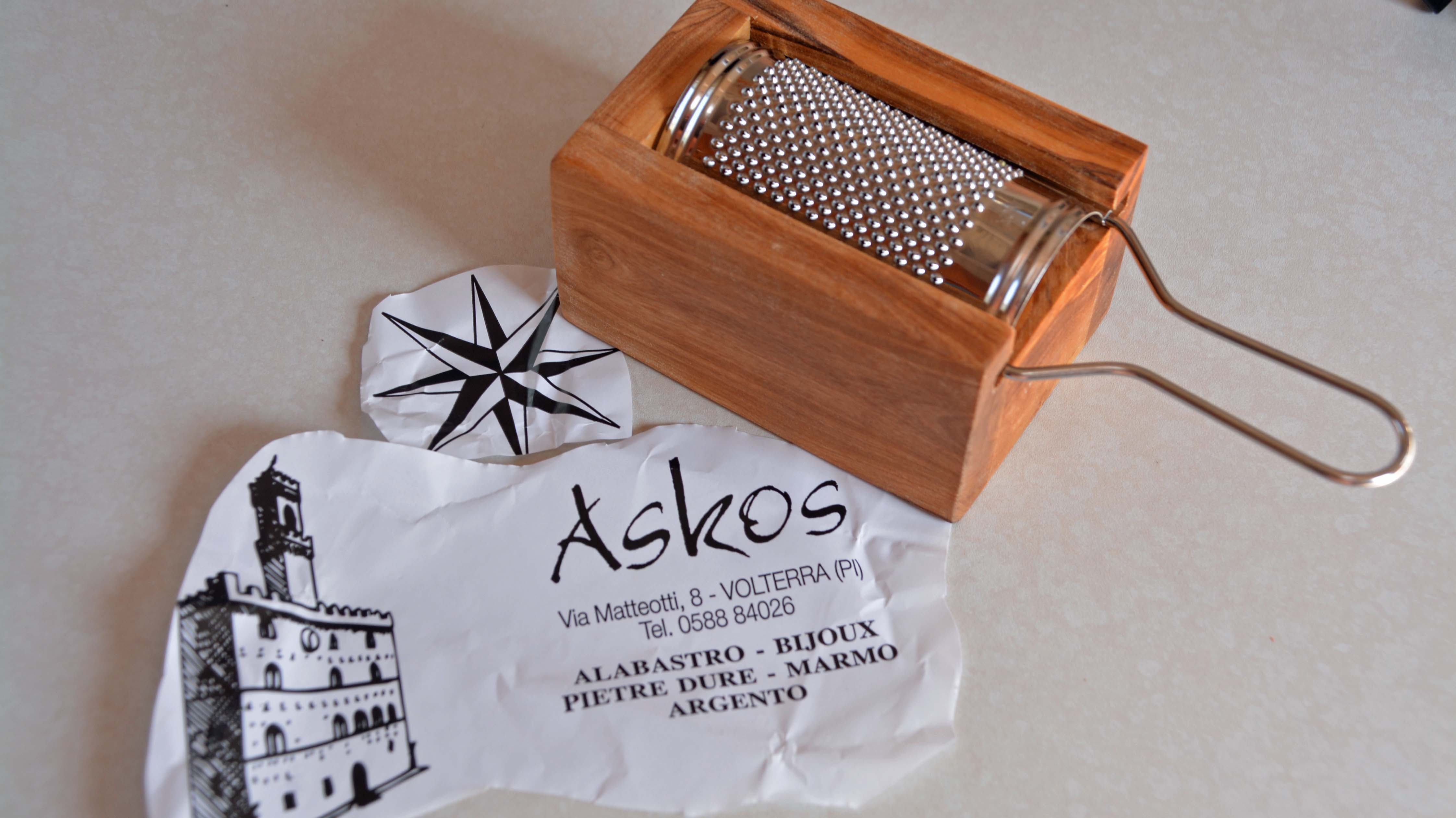 Gegenüber dem düsteren Eindruck, den das mittelalterliche Dorf im September 2015 auf mich machte, ist es heute trubelig, sonnig und fahnengeschmückt. Das lädt zum shoppen ein. Ich erstehe eine Parmesan-Reibe aus Olivenholz.