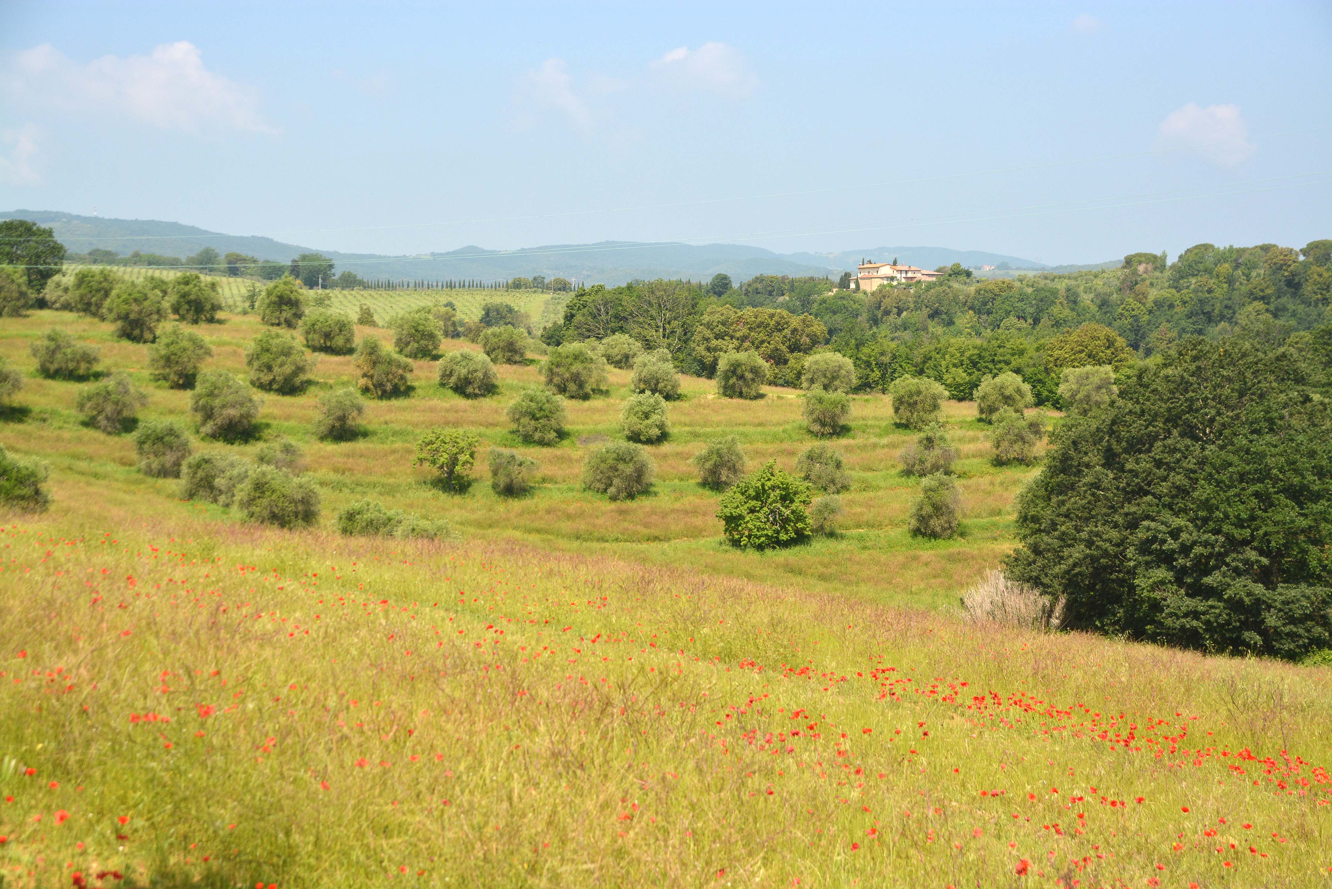 Wir starten eine viertel Stunde nach 10 und müssen zurück nach Colle di Val d’Elsa. Hier biegen wir ab auf die SR 68, einer kurvenreichen, landschaftlich reizvollen Strecke. Wir finden tolle Mohnfelder vor, Zypressenhaine, unterschiedliche toskanische Hügellandschaften, Olivenhaine, Weinfelder und haben Sonne satt.