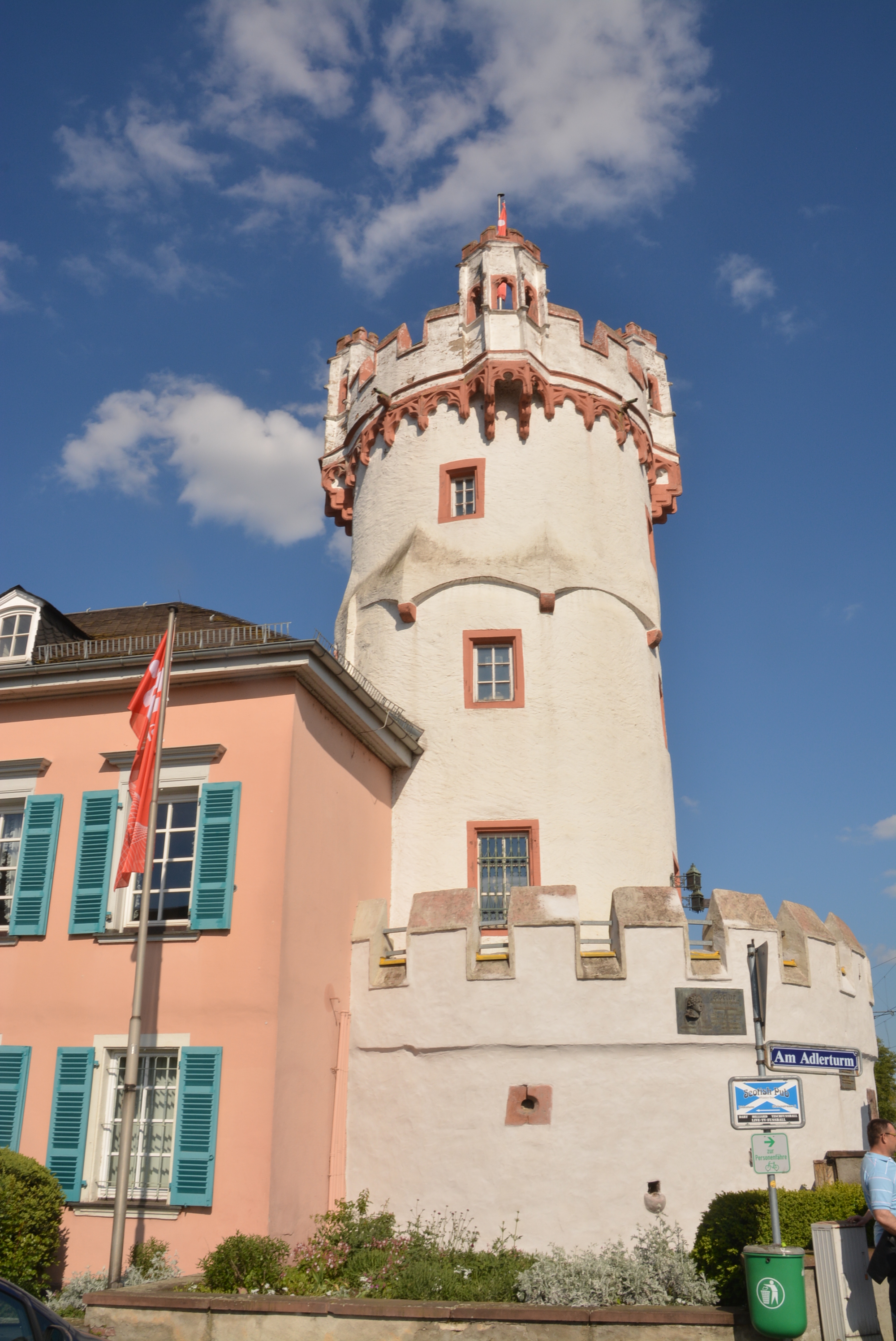 Jetzt sind wir gespannt auf ‚die kleine Stadt mit dem großen Namen: Rüdesheim. Die Weinstadt im Mittelrheintal mit ihren 10.000 Einwohnern empfängt jährlich etwa 2,5 Millionen Gäste. Berühmt wurde das Städtchen bereits 1727, als die ersten Straußenwirtschaften in der Drosselgasse öffneten. Ein knapper Kilometer Fußweg, und schon sind wir im Getümmel. Wir haben es uns schlimmer vorgestellt, als es tatsächlich ist, wobei wir die 144 Meter lange und nur zwei Meter breite Drosselgasse in hohem Bogen umlaufen. Am spätgotischen Adlerturm aus dem 15. Jahrhundert, Teil der alten Stadtbefestigung, stehen wir an der geschlossenen Bahnschranke und warten auf den Zug. Der Dichterfürst Goethe bewunderte bei seinen Rüdesheimbesuchen die wunderbare Aussicht auf den Rhein.