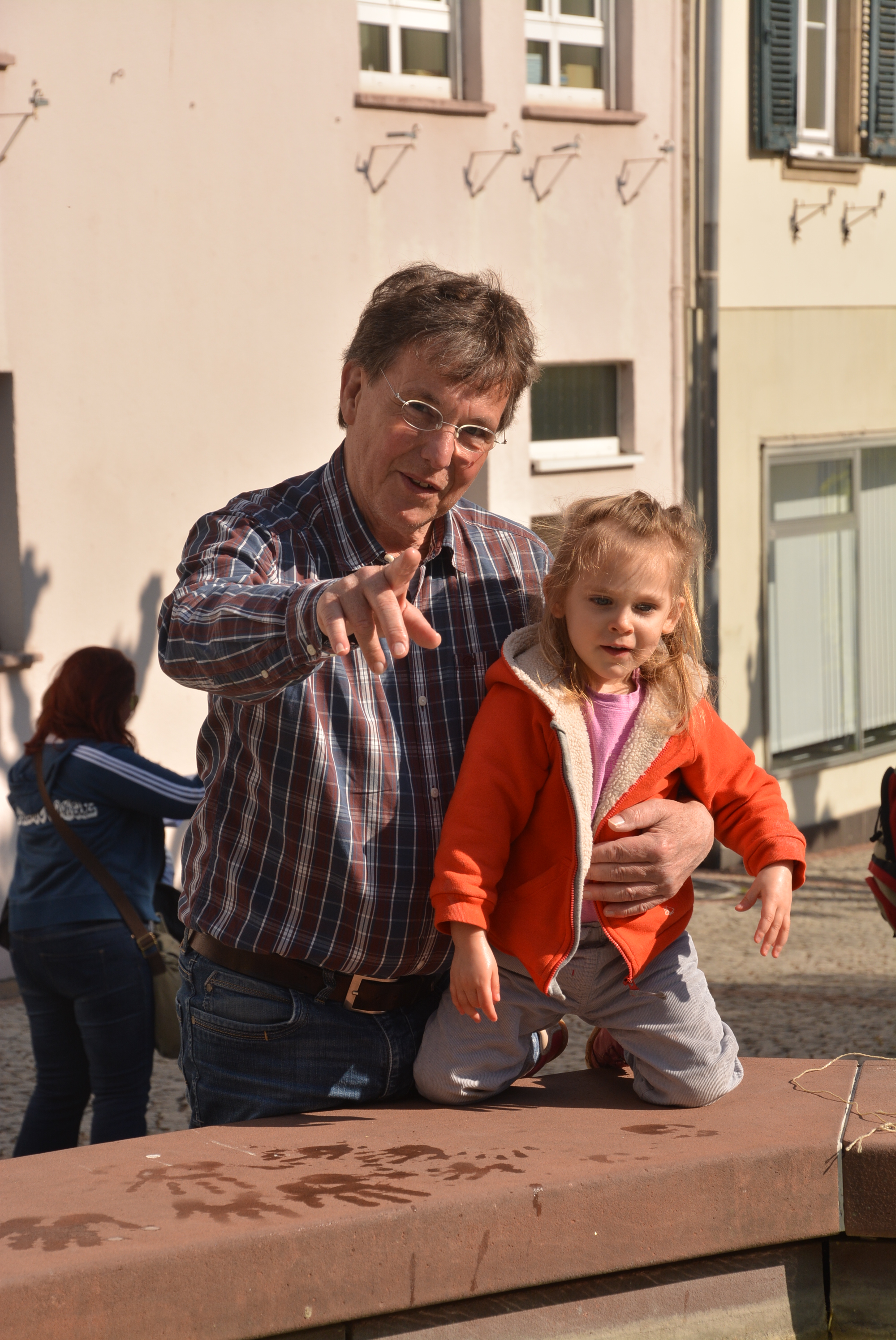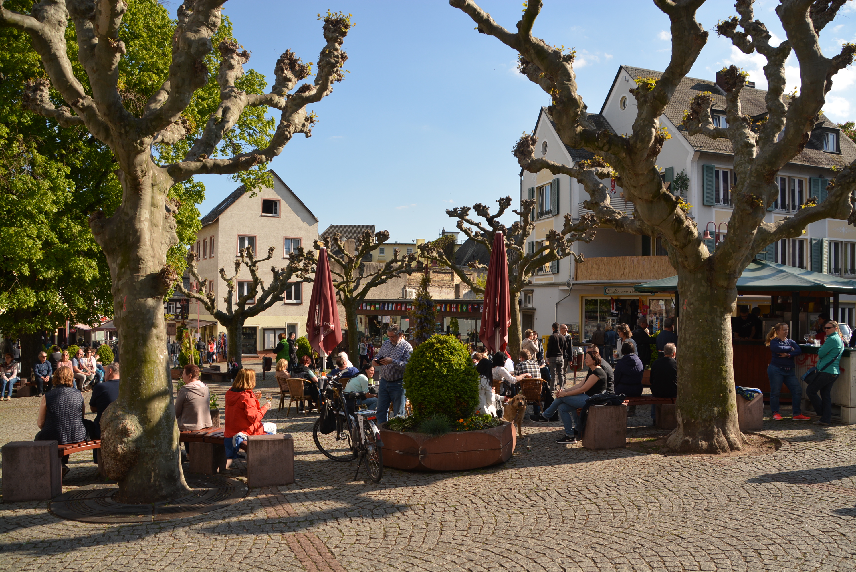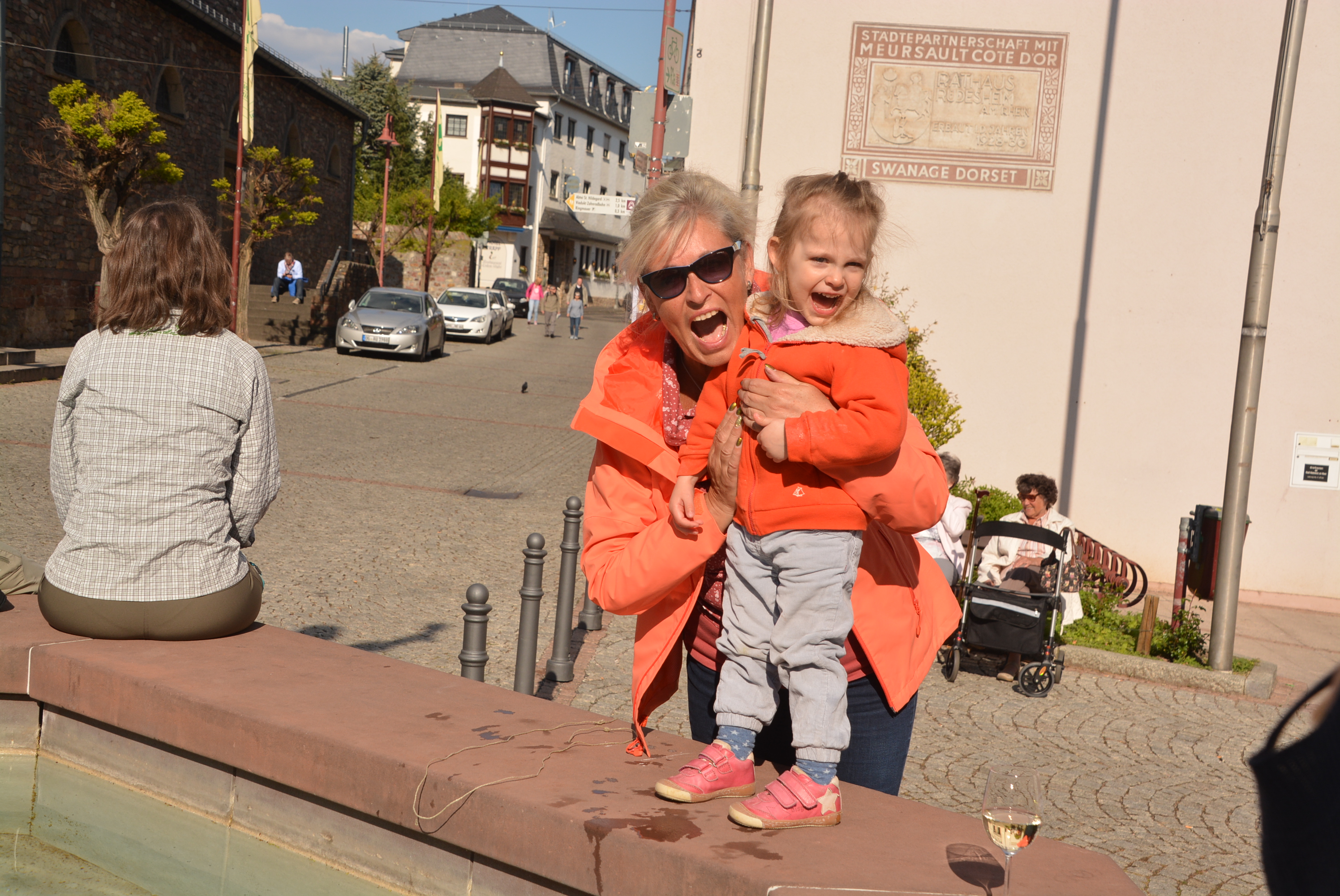 Unser Ziel ist die Eisdiele. Darauf freut sich Valentina schon den ganzen Tag. Auf dem Weg liegt der sechseckige Rathausbrunnen am Marktplatz. Hier ist erstmal Wasserplanschen angesagt. Wir ‚malen‘ mit Wasser unsere Hände auf den Sandstein und werfen Geld in den Brunnen. Unter stahlblauem Himmel liegt die im Mittelalter erbaute St. Jacobus-Kirche aus rheinischem Bruchstein-Mauerwerk. Der große Platz strahlt Ruhe und Gemütlichkeit aus: Favoriten der Touris, die überall sitzen, sind Wein und Eis. Wir schlabbern natürlich auch ein Weinchen!
