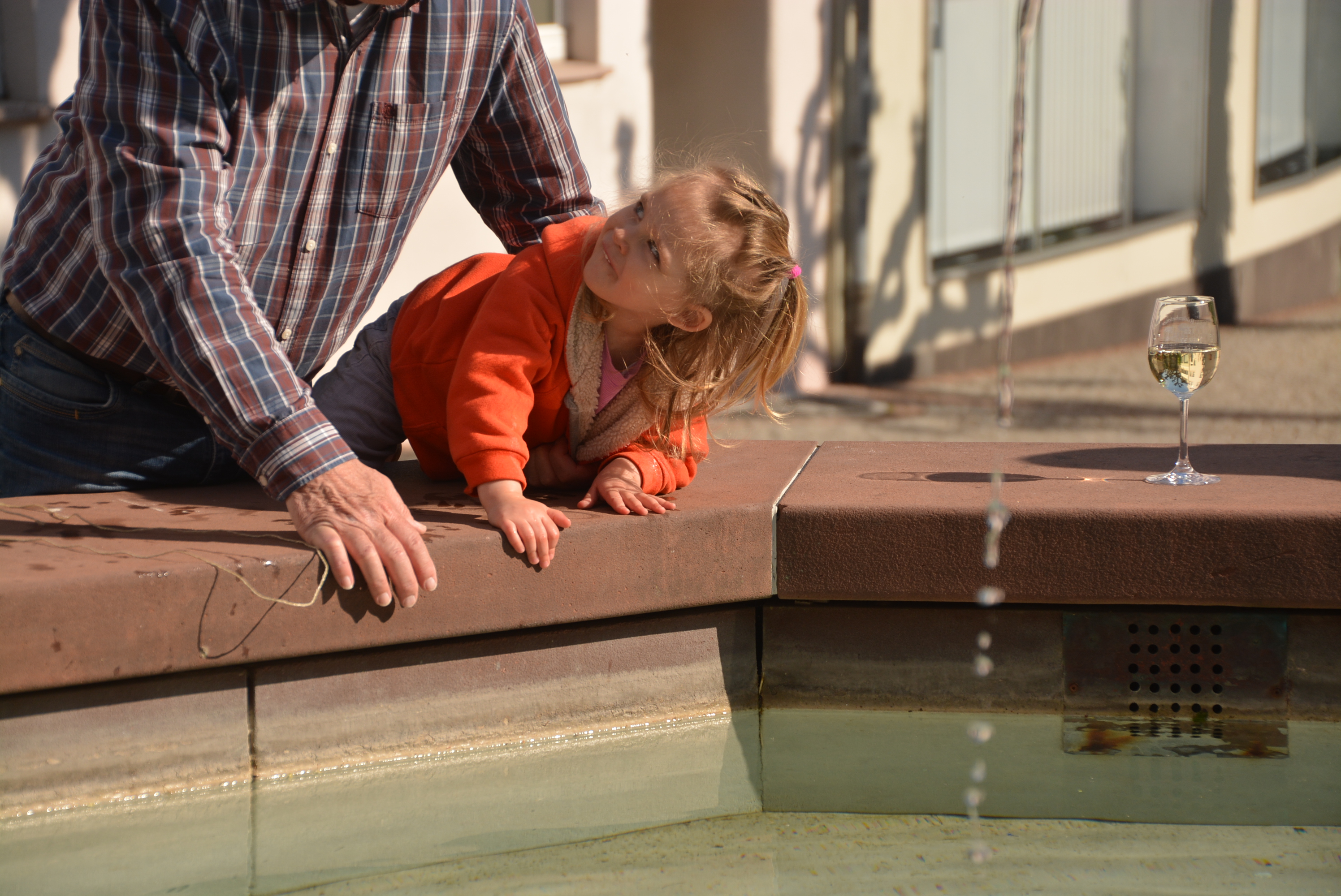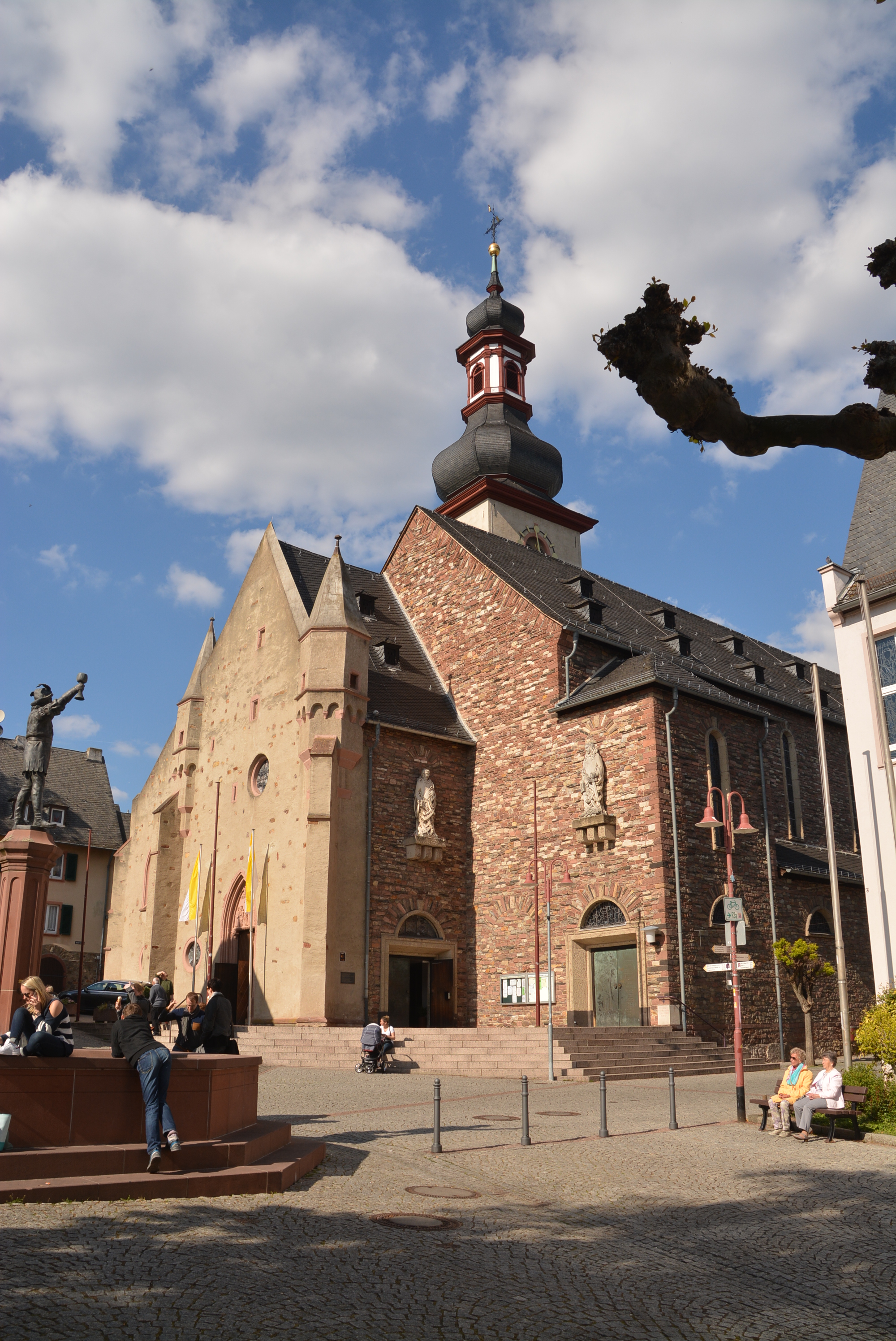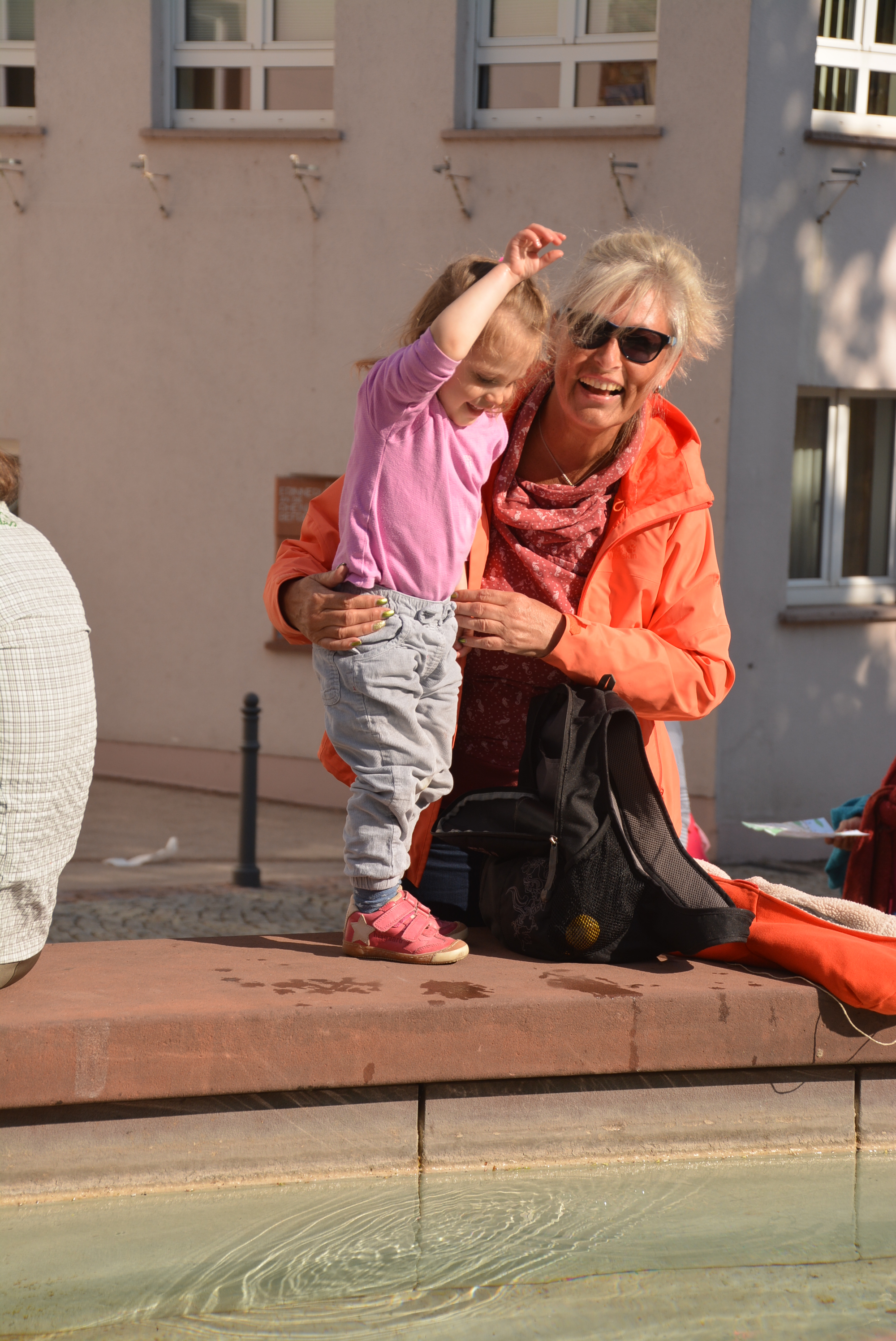 Unser Ziel ist die Eisdiele. Darauf freut sich Valentina schon den ganzen Tag. Auf dem Weg liegt der sechseckige Rathausbrunnen am Marktplatz. Hier ist erstmal Wasserplanschen angesagt. Wir ‚malen‘ mit Wasser unsere Hände auf den Sandstein und werfen Geld in den Brunnen. Unter stahlblauem Himmel liegt die im Mittelalter erbaute St. Jacobus-Kirche aus rheinischem Bruchstein-Mauerwerk. Der große Platz strahlt Ruhe und Gemütlichkeit aus: Favoriten der Touris, die überall sitzen, sind Wein und Eis. Wir schlabbern natürlich auch ein Weinchen!
