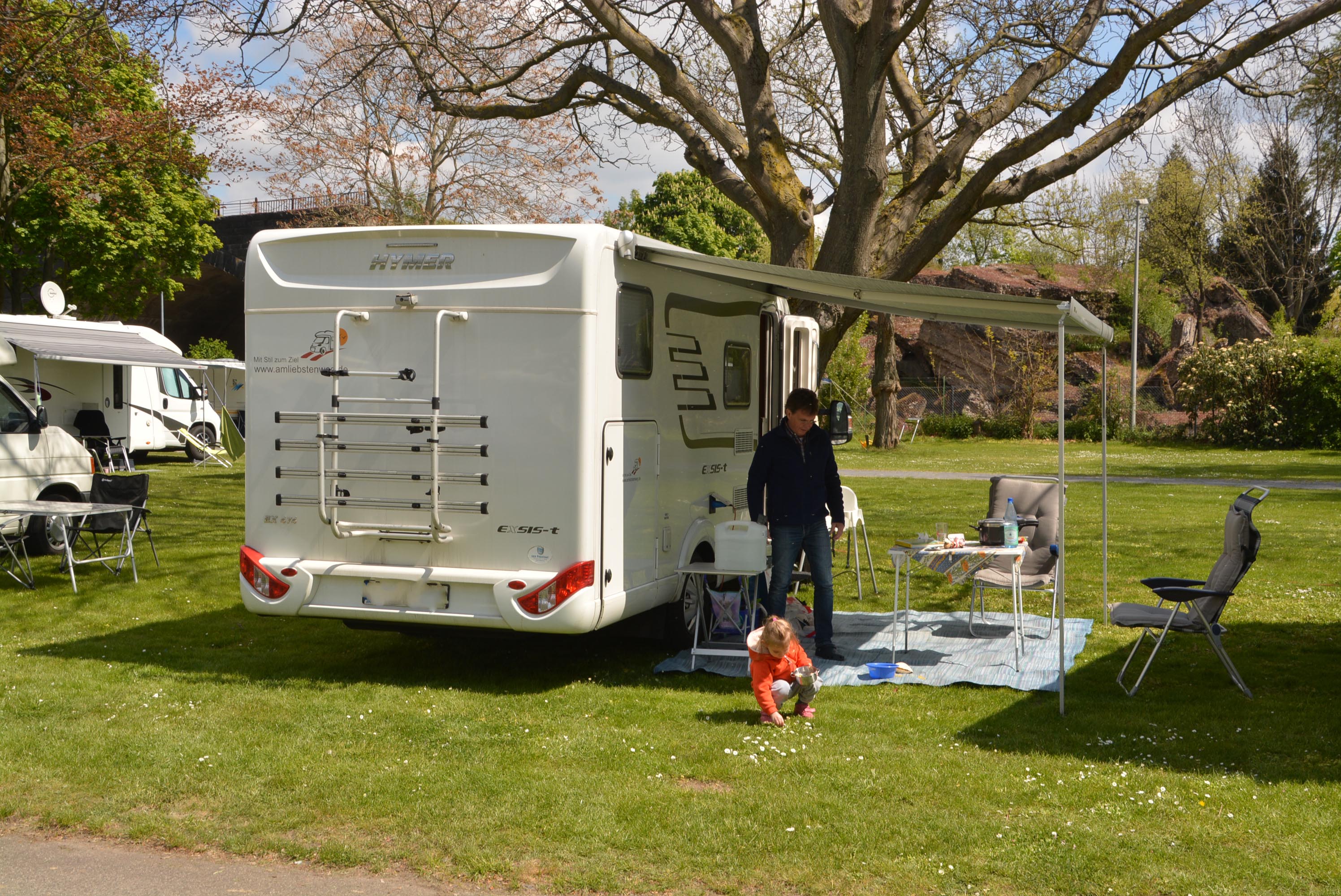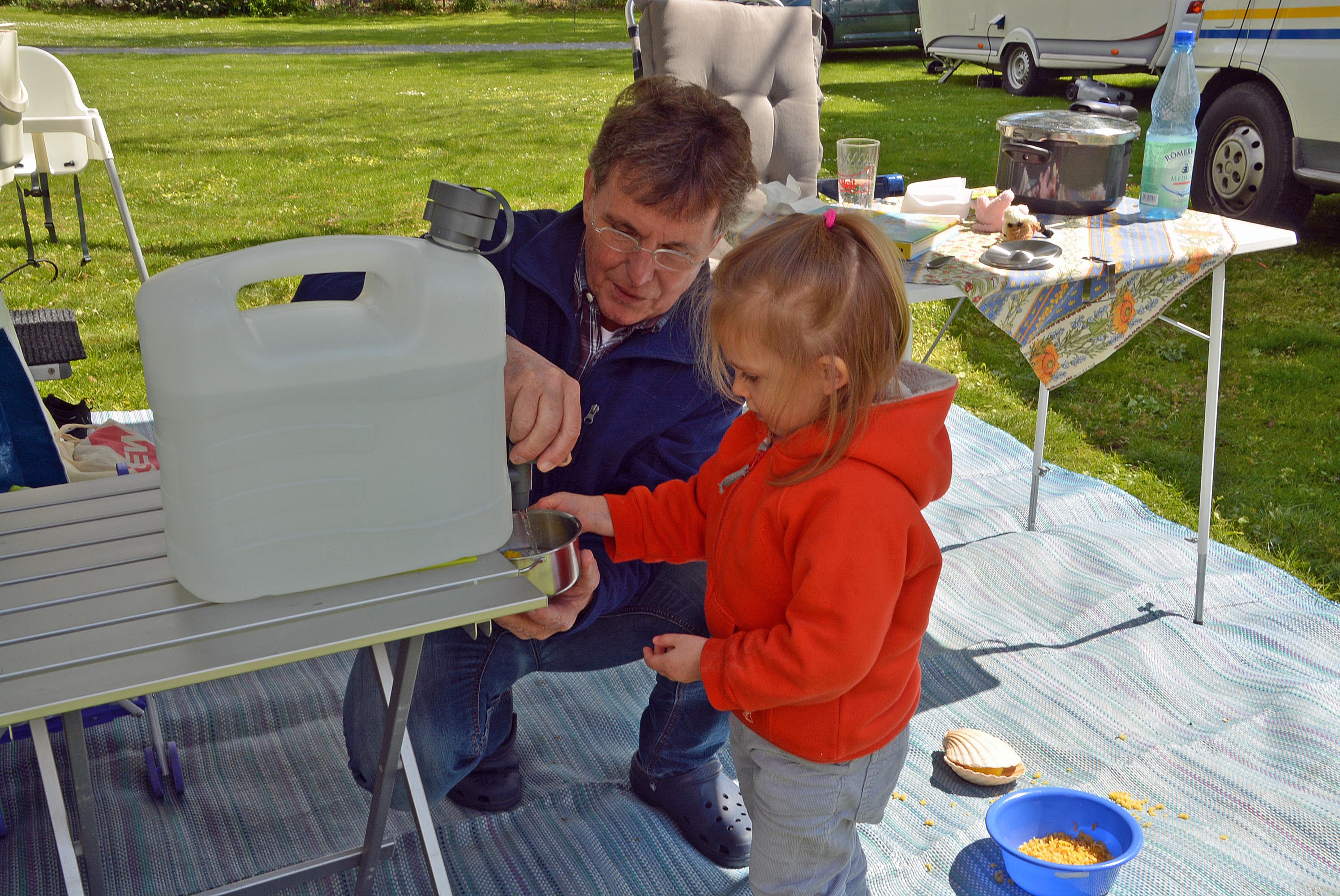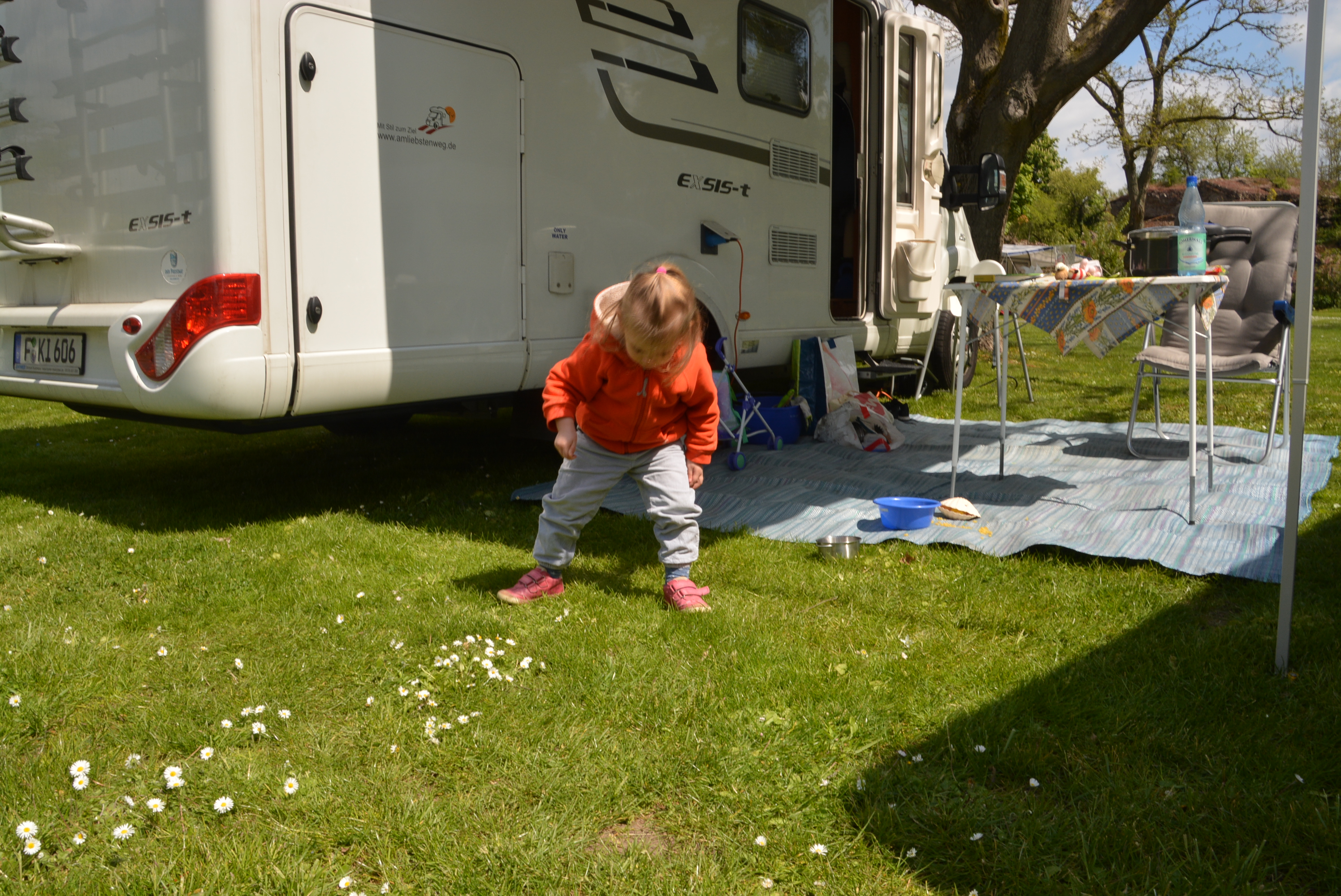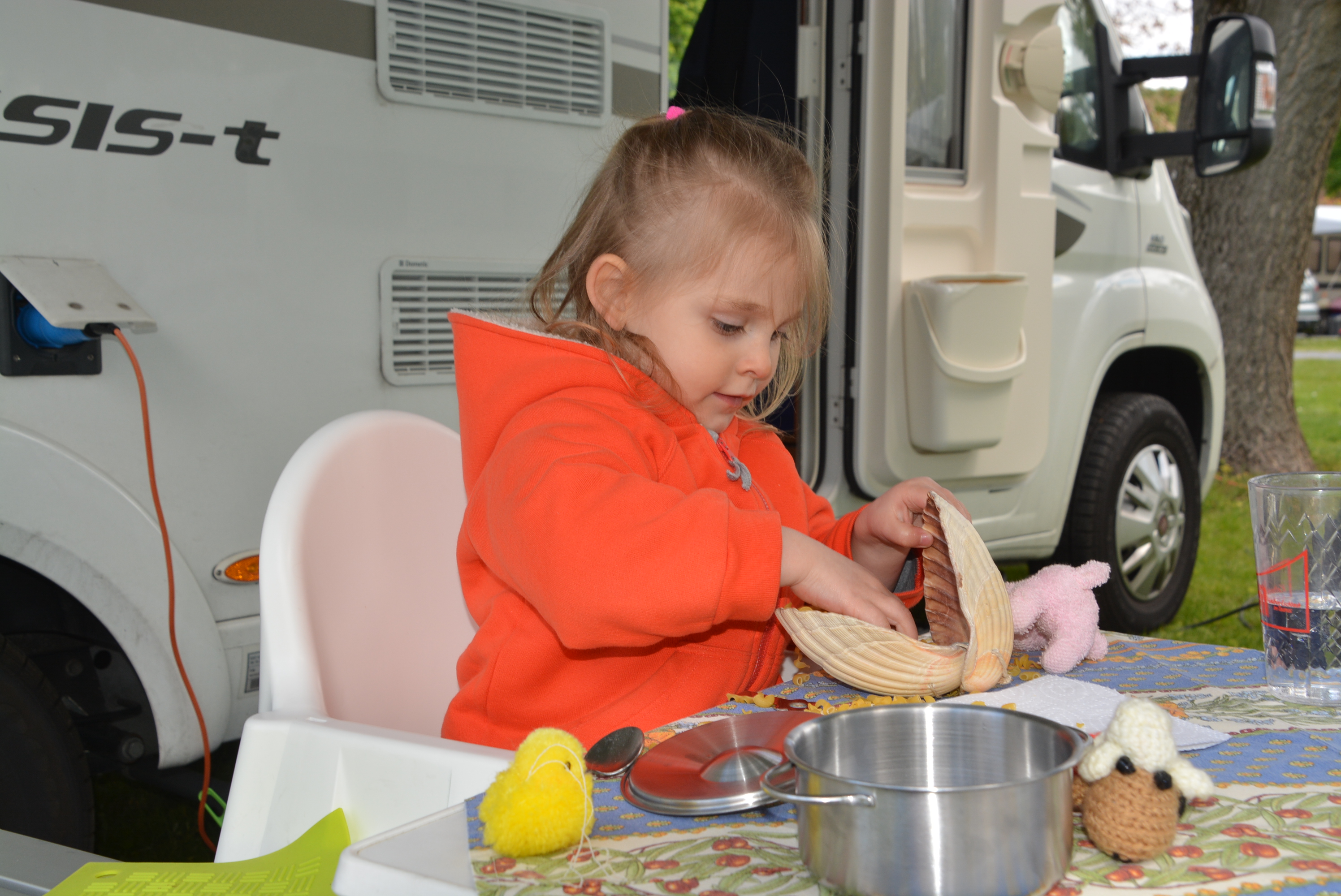 Eine Stunde später stehen wir am Empfang des Campingplatzes in einer Reihe mit Norwegern, Dänen, Holländern, Engländern, in der Hauptsache aber Deutschen. Ich checke ein, wir nehmen einen sonnigen Stellplatz, Klaus baut auf und ich unterhalte meine Enkelin. Das Wetter ist richtig schön geworden.