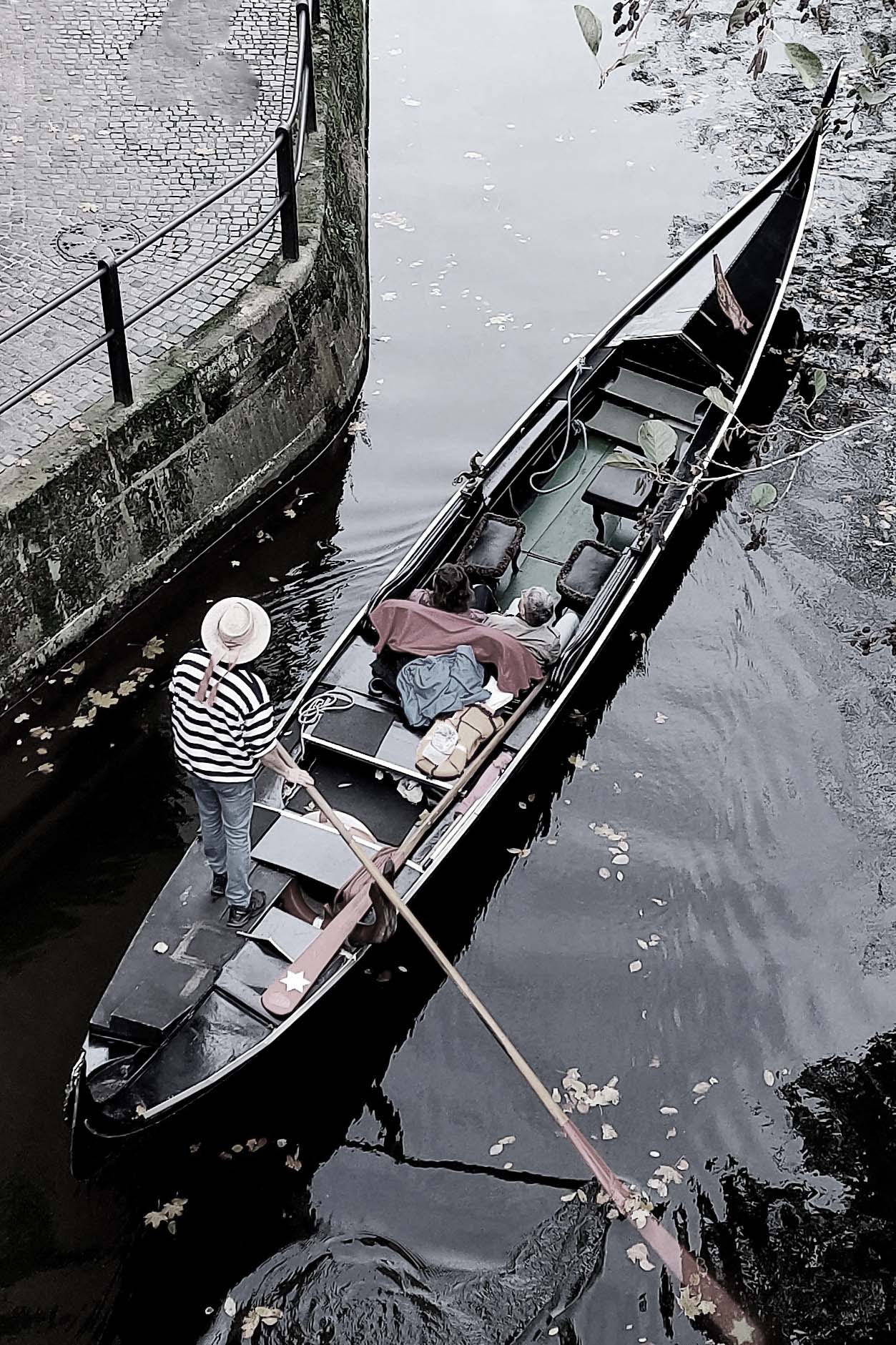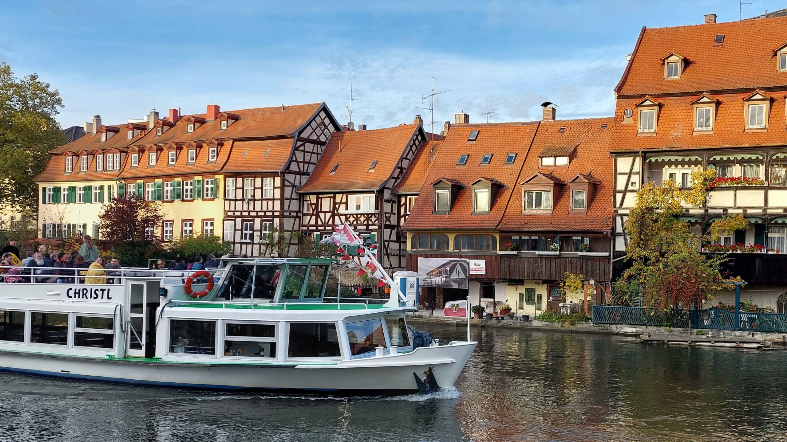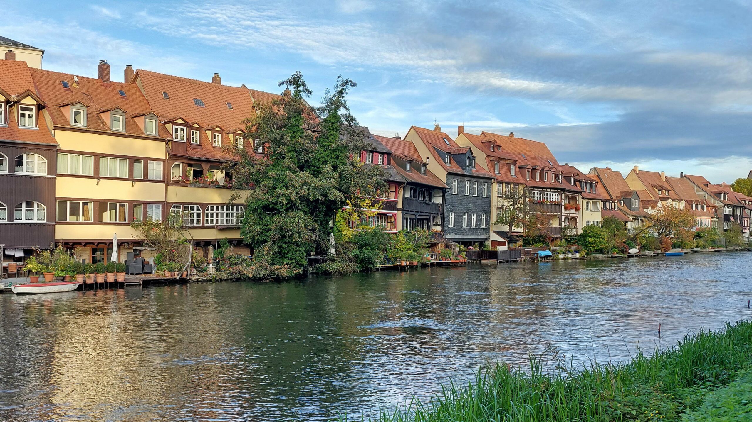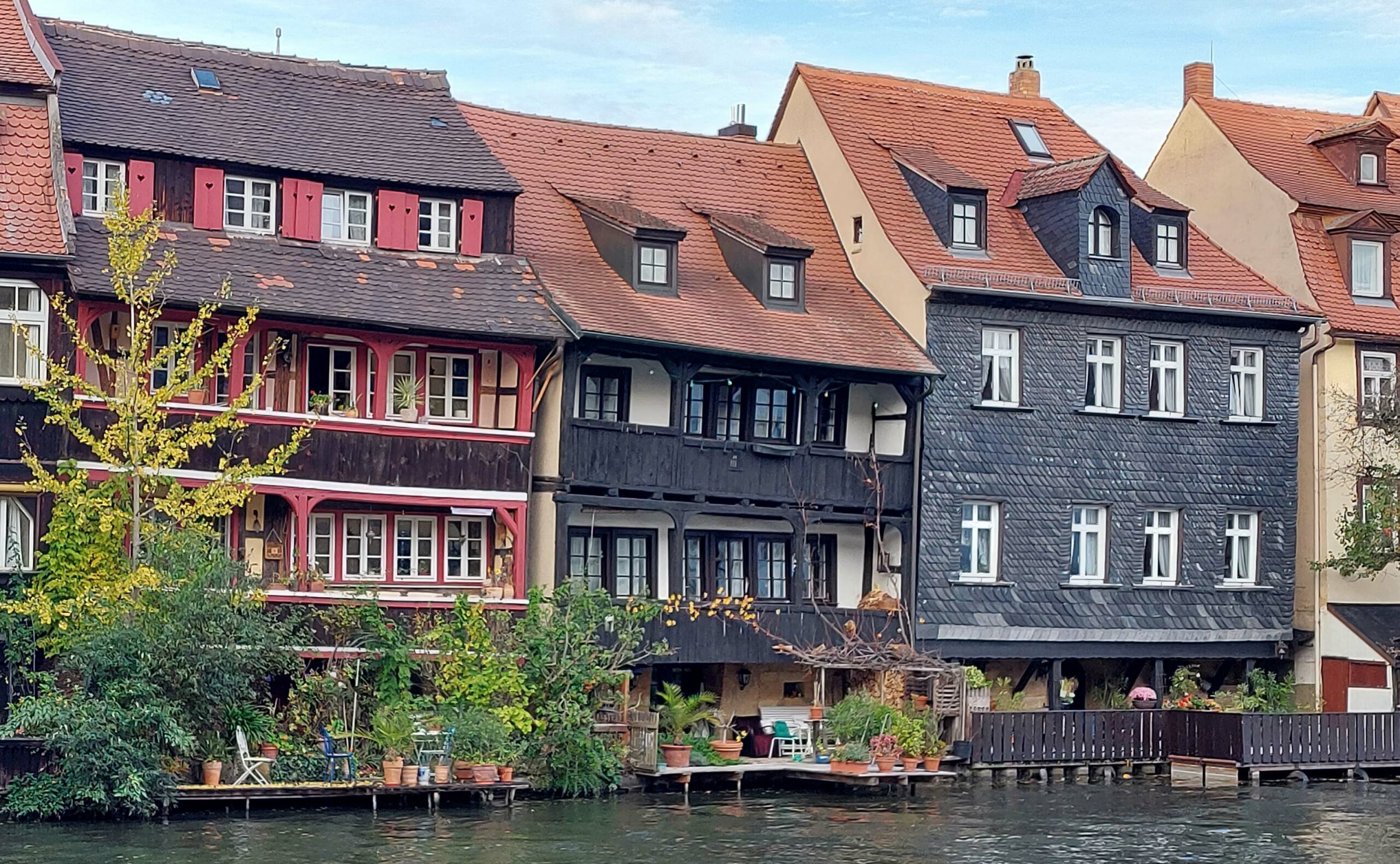Wir verschaffen uns einen ersten Überblick, sogar das Wetter spielt mit. Ein Highlight ist die ehemalige Fischersiedlung. 🦈🦈🦈 Dicht gedrängte Fachwerkhäuschen und winzige Gärten liegen unmittelbar an der Regnitz. Die Häuser stammen überwiegend aus dem Mittelalter (17.JH.) Aber wieso Klein Venedig?? Die Auflösung naht – wir entdecken einen Gondolieri, der in einem venezianischen Kahn lautlos vorbeigleitet!