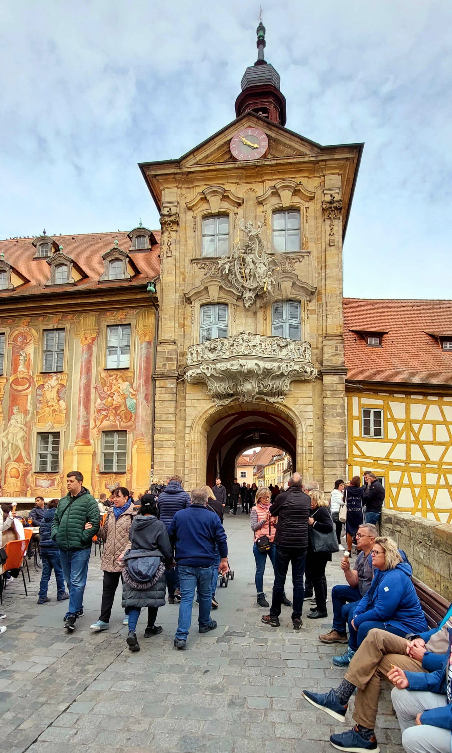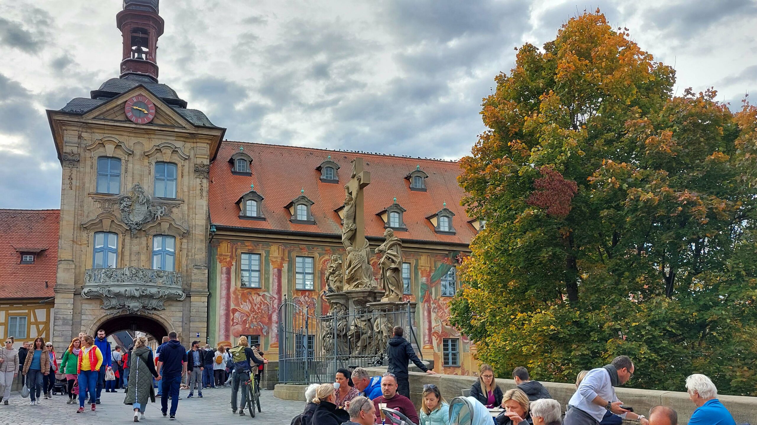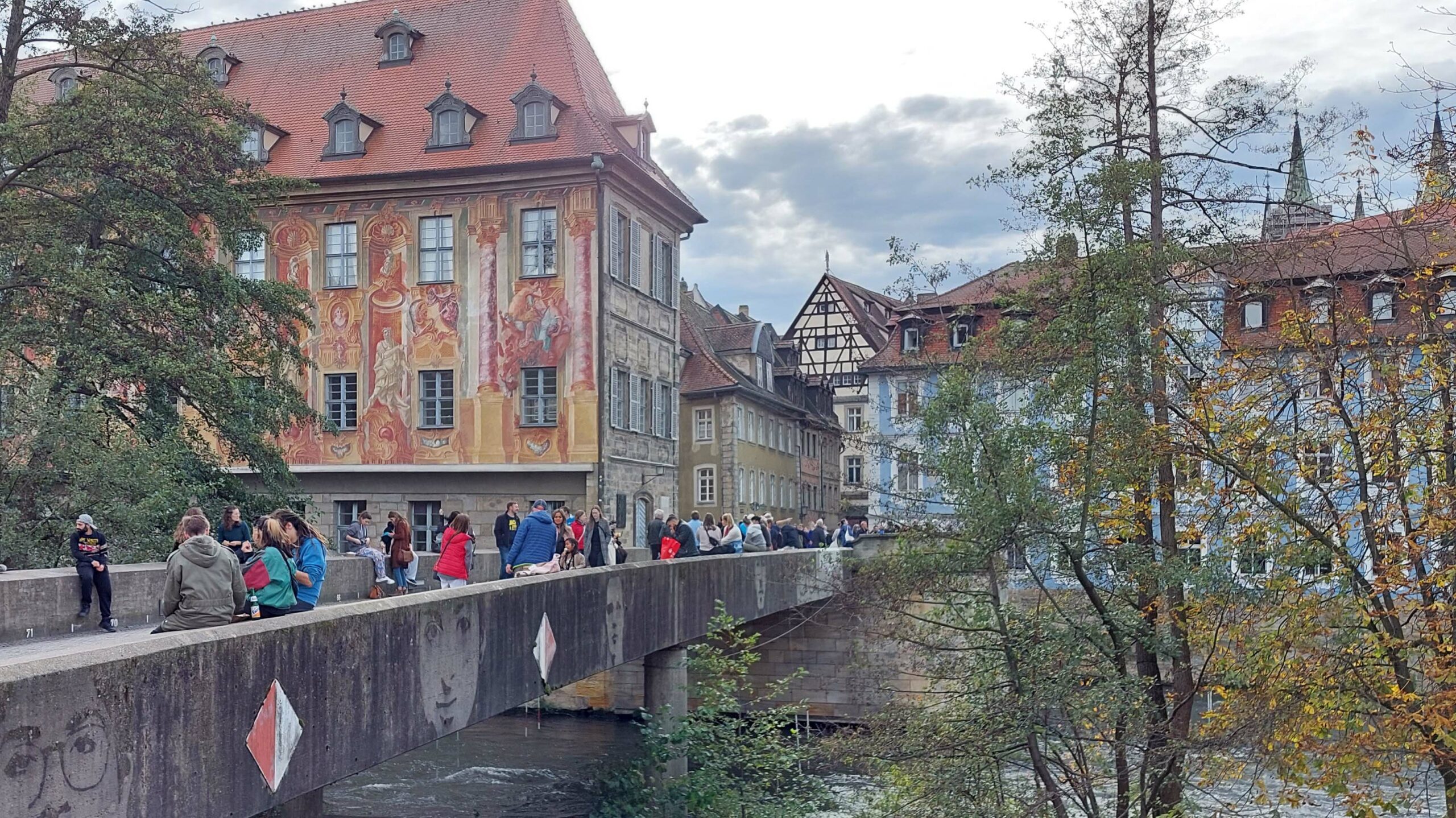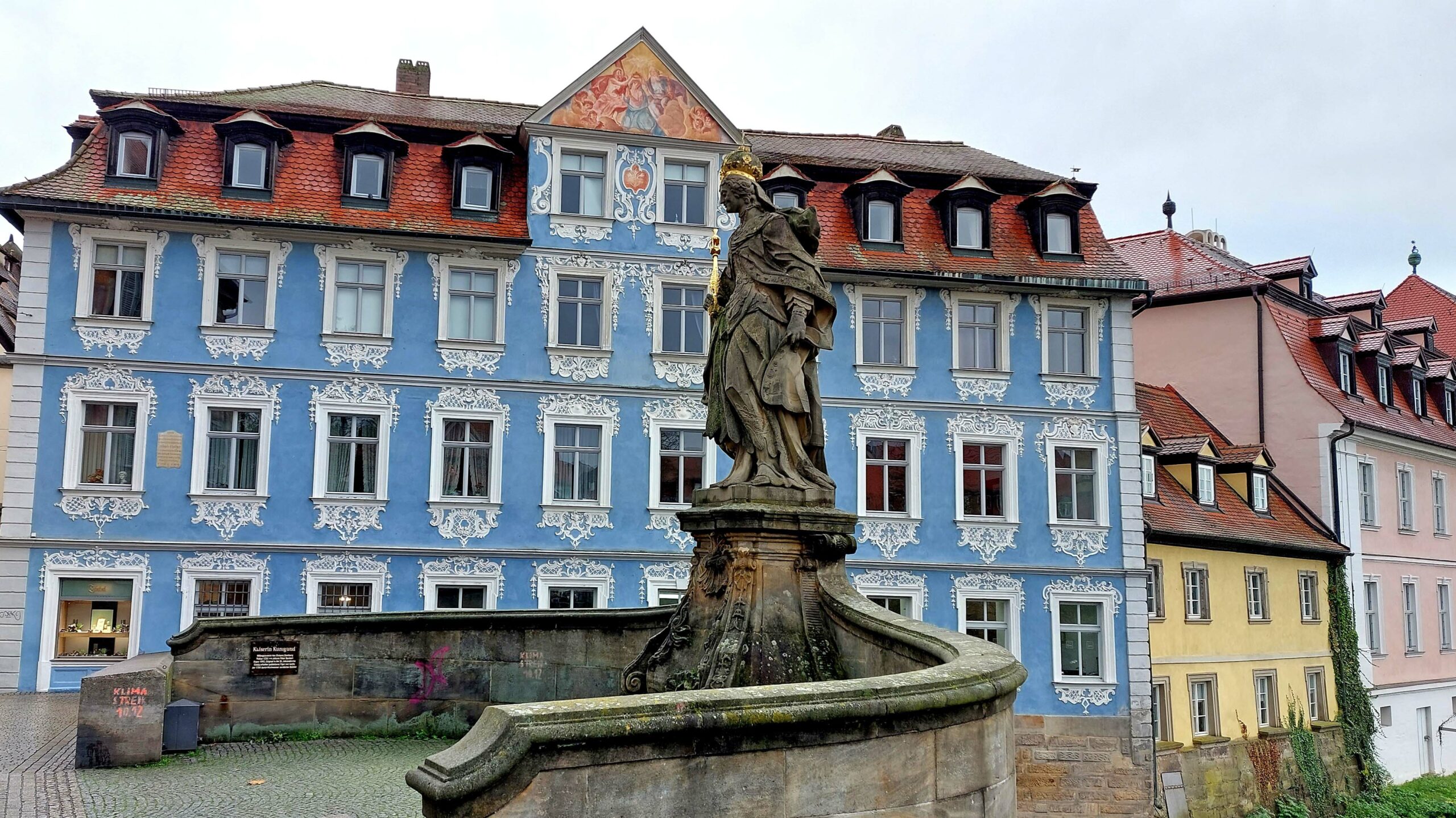 Dann treffen wir uns zu einem ersten Kennenlernen Bambergs an der Unteren Brücke vor dem Eingang zur Altstadt. Hier steppt der Bär! Die Beliebtheit genau dieser Stelle sehen wir schon von Weitem an der Menschenmenge, die sich vor dem „Schlenkerla“ versammelt haben und genüsslich Kopf an Kopf das ein oder andere „Echt Schlenkerla Rauchbier“ trinken. Am blauen Hellerhaus prangt eine Statue mit Kaiserin Kunigunde. Die Kaiserin und ihr Mann Heinrich II waren das einzige heilig gesprochenen Kaiserpaar, was es je gab. 😇😇