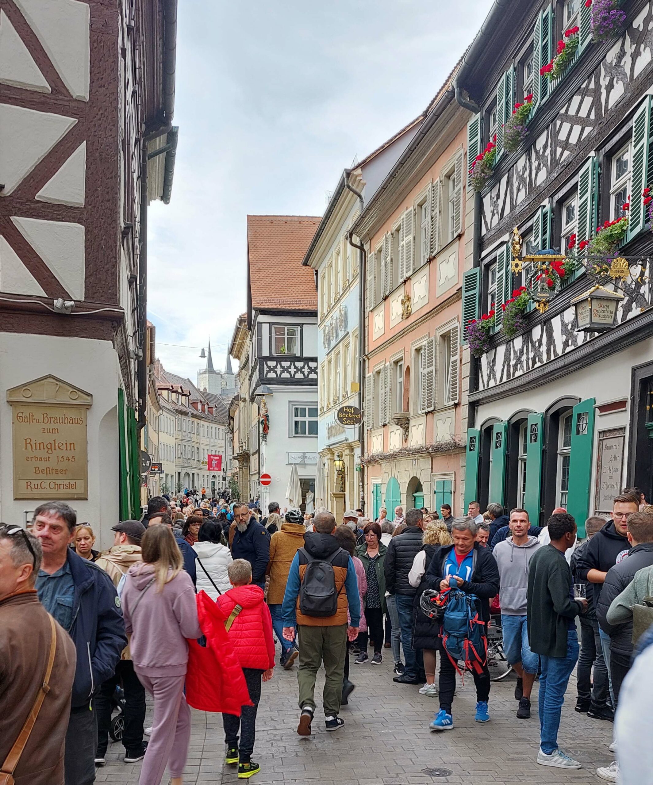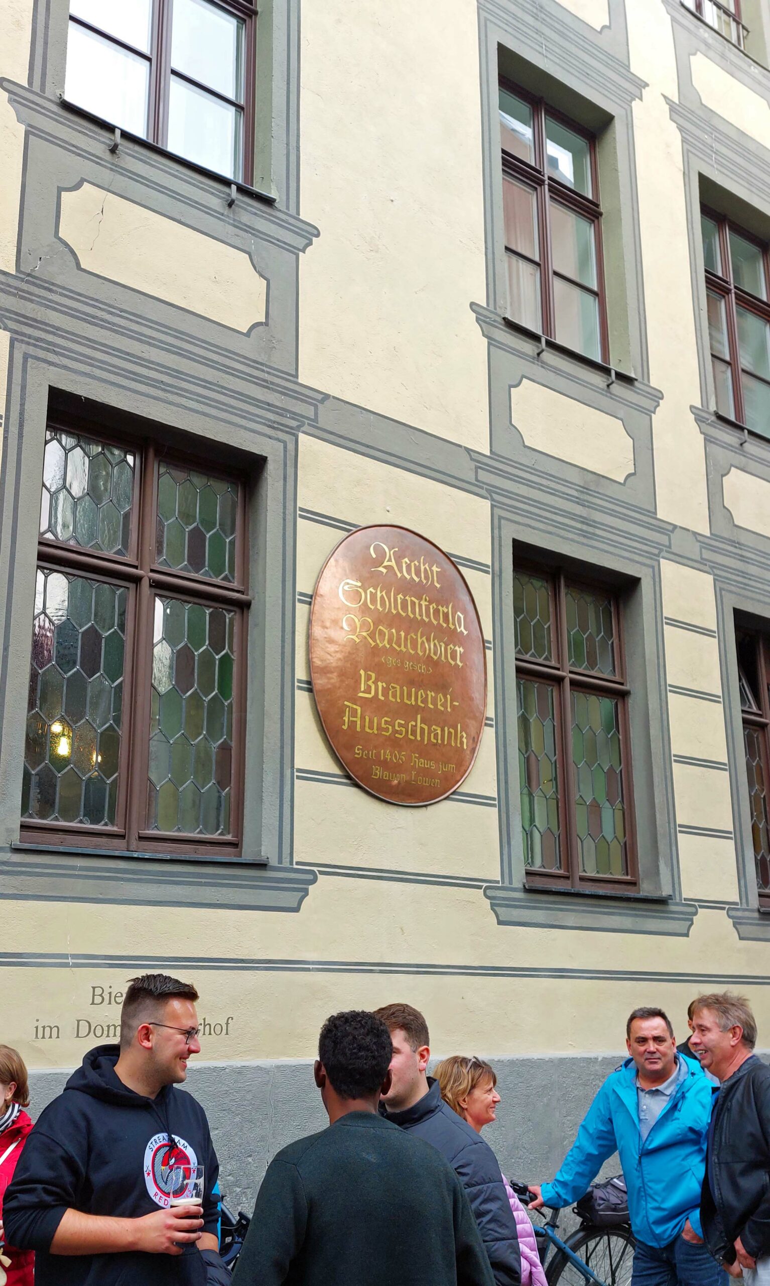 Wieder vereint gehen wir zum Abschluss in die historische Rauchbierbrauerei „Schlenkerla“ in der Dominikanerstraße. Allmächtiger, was haben wir für ein Glück! 🍀 Ergattern einen Platz, der gerade frei wird. Natürlich bestellen wir Rauchbier und original fränkisches Essen. 🍺🥨🍲🍻🍽️ Das fränkische Mahl ist hervorragend, das Rauchbier allerdings, was traditionell aus Eichenholzfässern gezapft wird, ist nicht unser Ding. Um ehrlich zu sein …. meins minus Null!