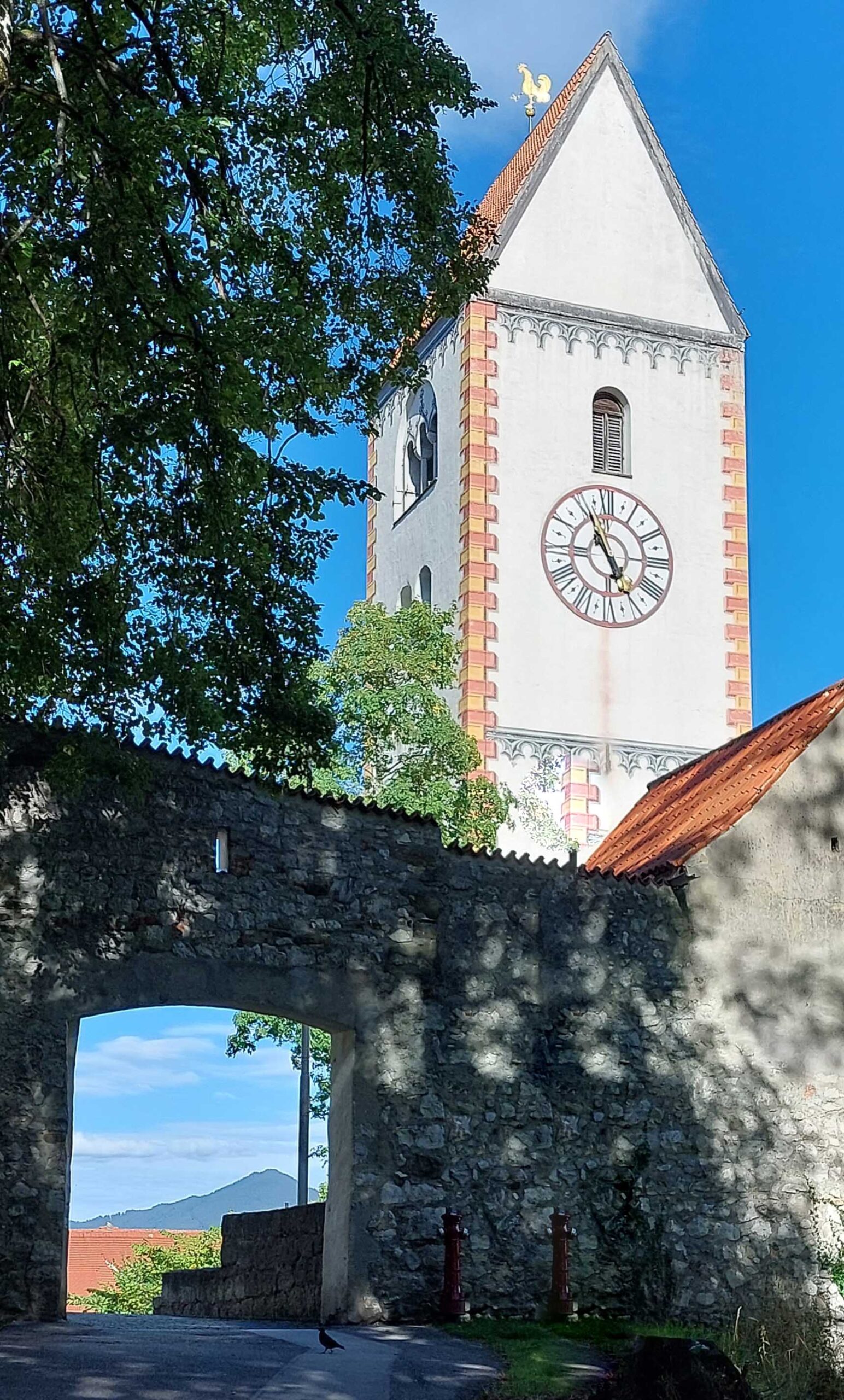 Ich laufe noch zum Alpsee mit seinem glasklaren, grünlich schimmernden Wasser. Es gibt hier einen 5,2 Kilometer langen Rundweg um König Ludwigs Lieblingssee. Aus zeitlichen Gründen verzichte auf den Rundgang und radle zurück nach Füssen. Ein kurzer Stadtrundgang mit äußerst fotogenen Wolken muss aber noch sein. Füssen liegt auf dem Tegelberg, hat ein sehr schönes gotisches Schloss und eine gemütliche Altstadt.