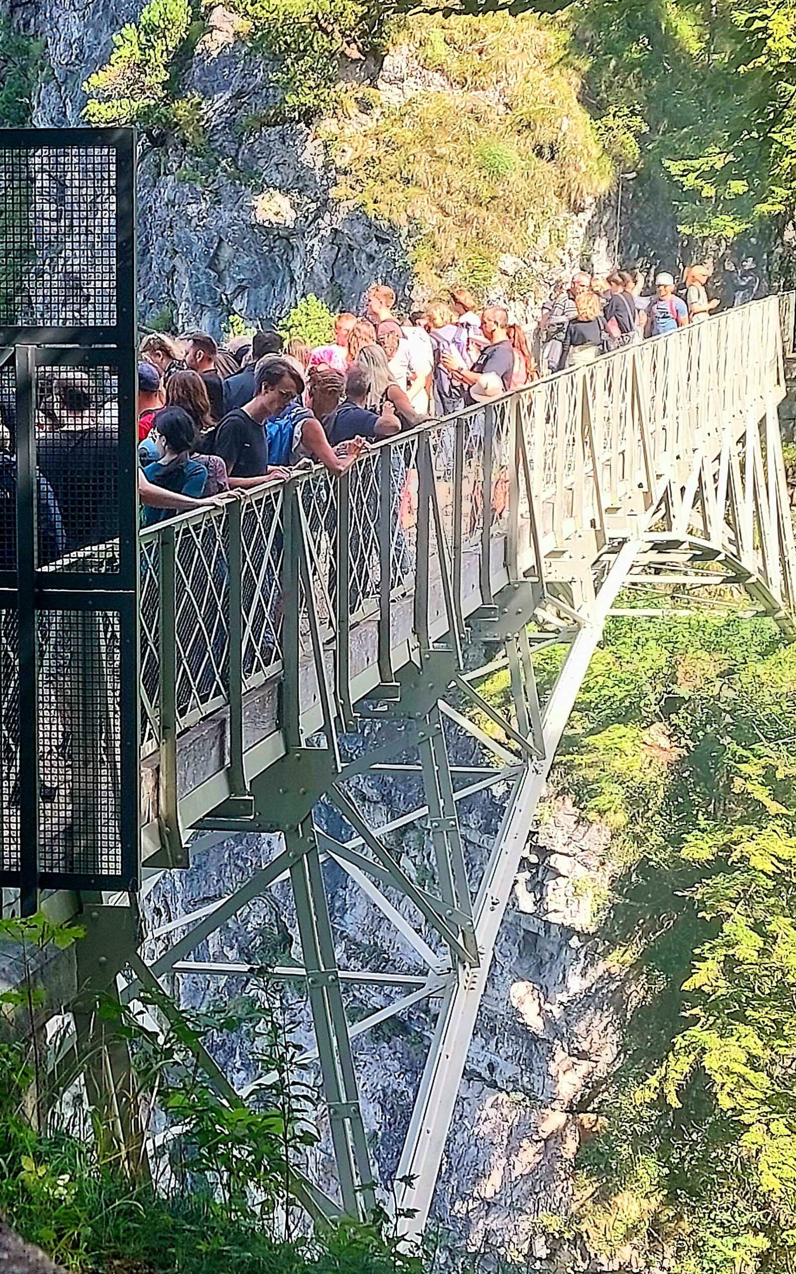 Die Brücke hängt in 90 Meter Höhe über der Pöllatschlucht. Das Geländer ist noch im Original erhalten. Natürlich ist dieser Touristenmagnet äußerst beliebt. Das zeigen die Menschenmassen aus aller Herrenländer.