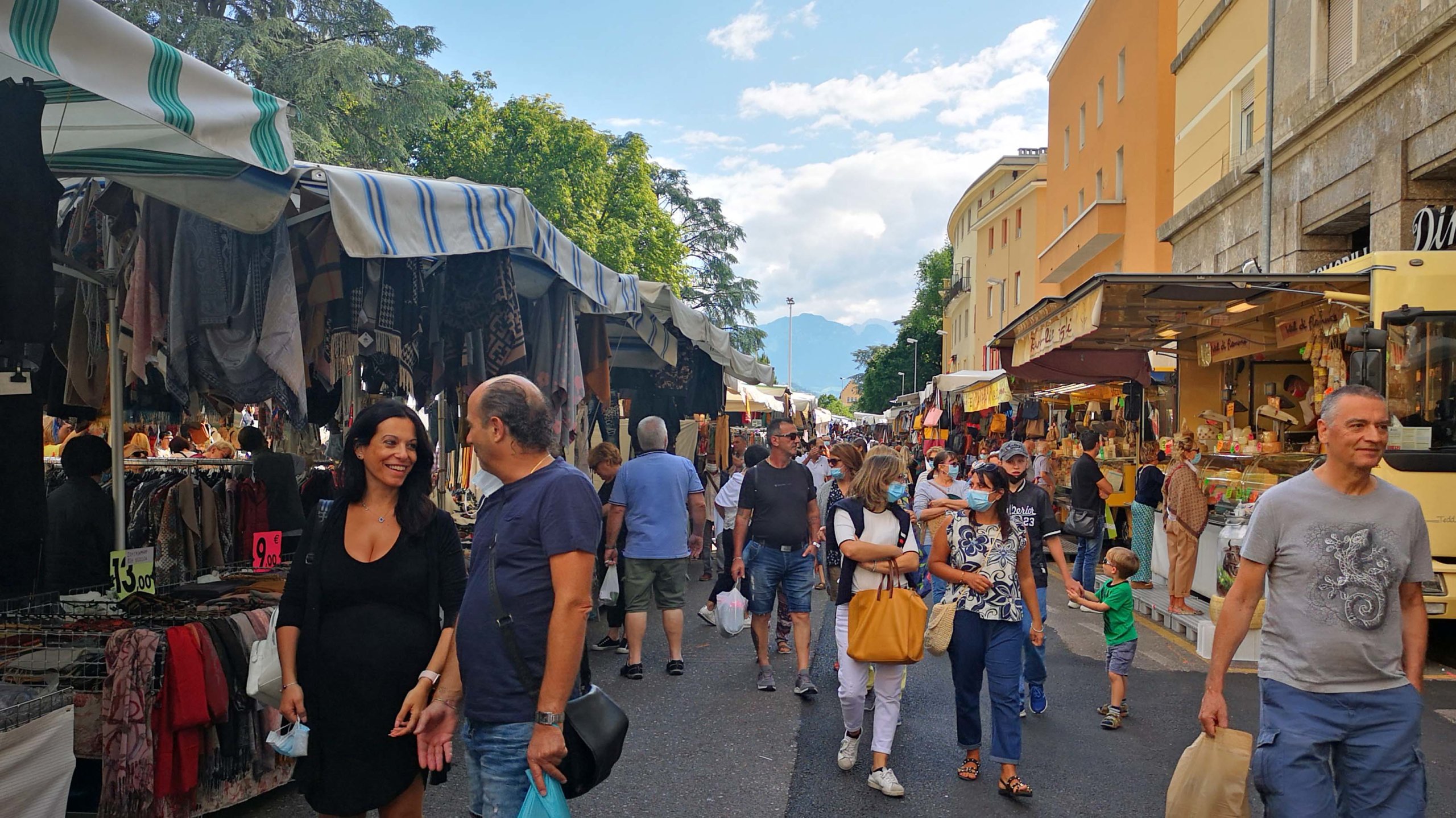 Oh, denke ich, das fĂŒhrt mit Sicherheit zu chaotischem Verkehr. Grund genug, statt mit dem Bike mit dem Bus in die Stadt zu fahren. Die Haltestelle ist genau gegenĂŒber der Einfahrt zum Campingplatz. NatĂŒrlich stehen wir uns die Beine in den Bauch. Und natĂŒrlich hat der Bus ĂŒber 10 Minuten VerspĂ€tung! Aber nach einer viertel Stunde Fahrt stĂŒrze ich mich in das Markttreiben. Von Corona kaum eine Spur. Ich trage Maske und bin unter den Touristen nicht die Einzige.
