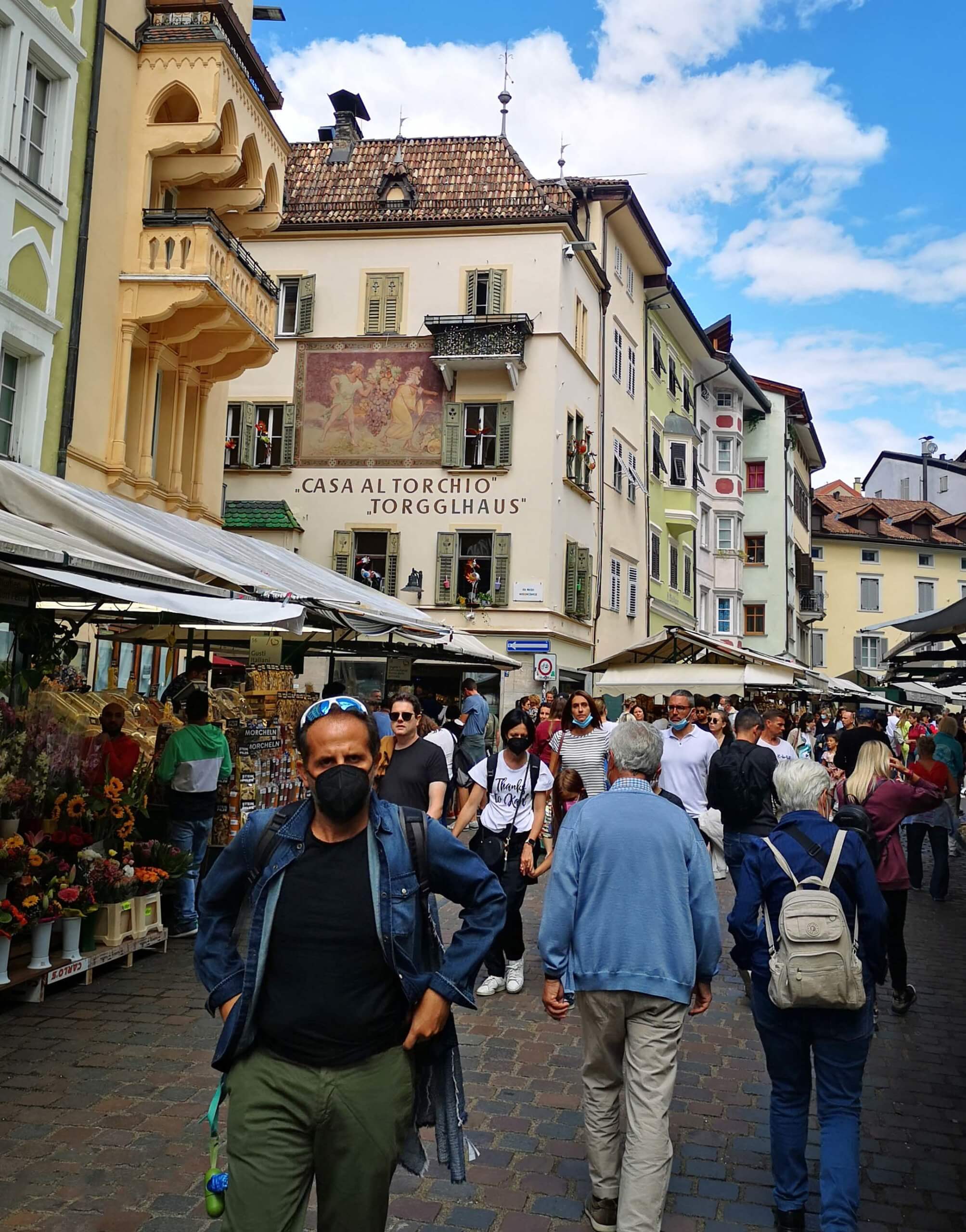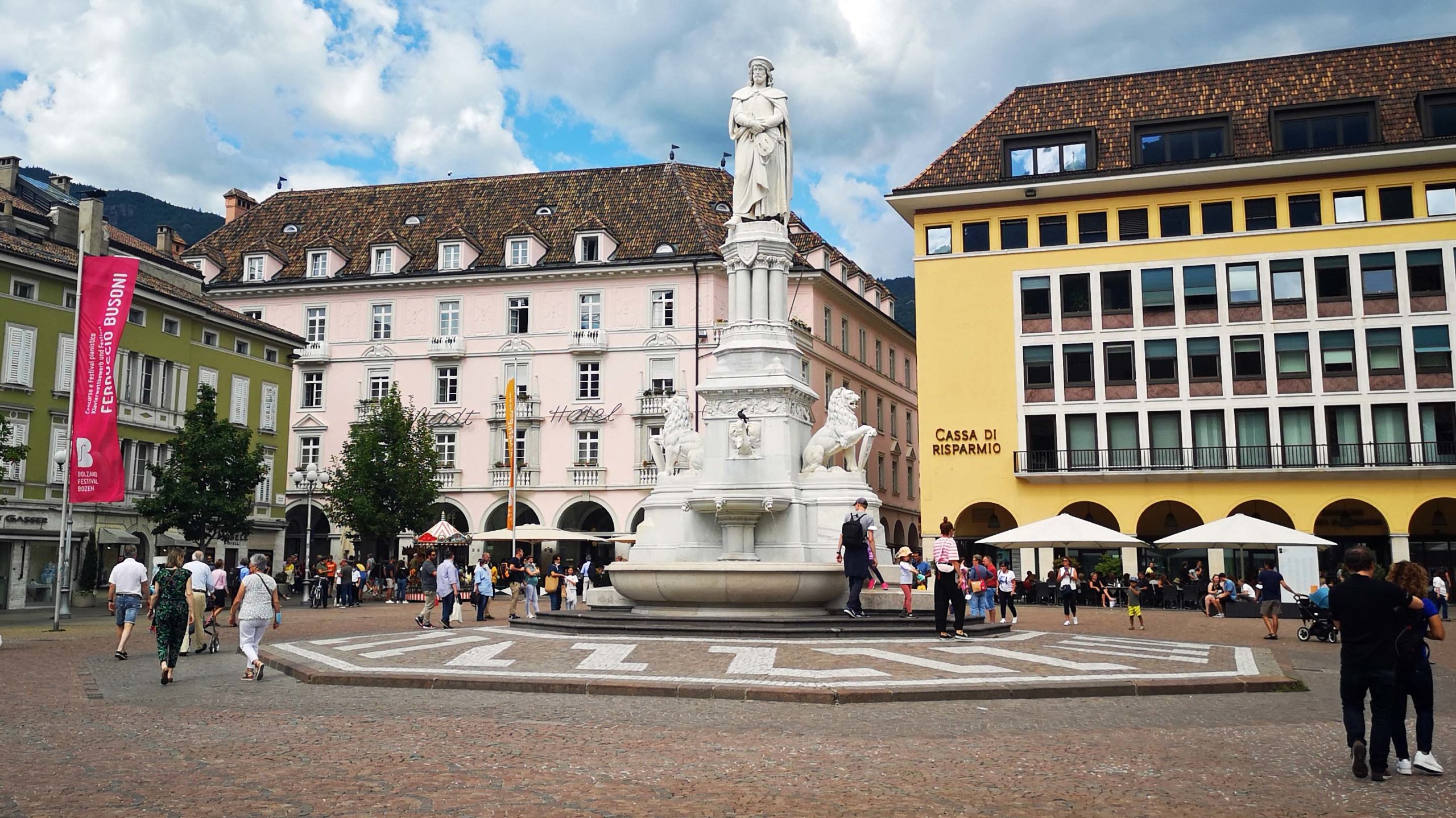 Der Waltherplatz ist der Mittelpunkt von Alt-Bozen. Er hat seinen Namen vom großen deutschen Dichter und MinnesĂ€nger Walther von der Vogelweide, dessen Statue mitten auf dem Platz steht. Ich erreiche den Obstmarkt, einen der buntesten PlĂ€tze Bozens. Das Angebot bewunderte schon Goethe, als er 1786 das erste Mal in den SĂŒden reiste.