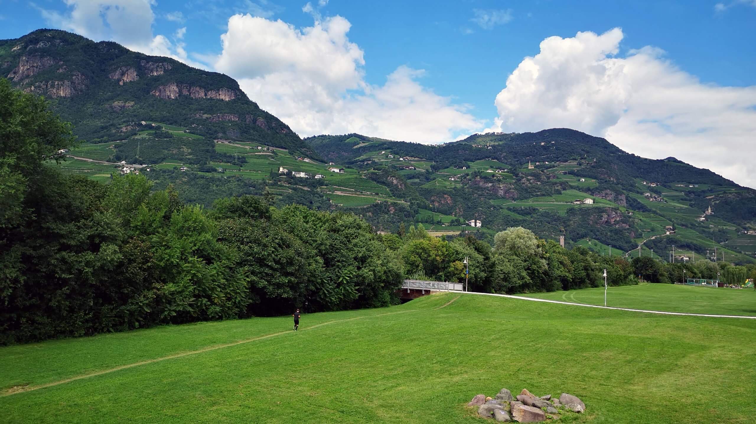 Gleich dahinter entdecke ich den Neptunbrunnen von 1746, der von zahlreichen Eis schleckenden Leuten belagert wird. Die Bozener haben ihm den Spitznamen ‚Gabelwirt‘ gegeben. Der nach dem Krieg originalgetreu wieder aufgebaute Dom „Maria Himmelfahrt“ ist die Kirche mit den meisten SitzplĂ€tzen im Alpenraum und das Wahrzeichen Bozens. Ich ĂŒberquere die TalferbrĂŒcke ins Naherholungsgebiet „Talferwiesen“ und komme auf meinem Rundgang zurĂŒck zum Beginn des Samstag-Markts am wuchtigen Siegesdenkmal. Es stammt aus der Zeit des Faschismus, Mussolini war der Auftraggeber. Historiker bezeichnen das Bauwerk deshalb als „Faschistentempel“. Es sei eine arrogante Demonstration der Italianisierung SĂŒdtirols.