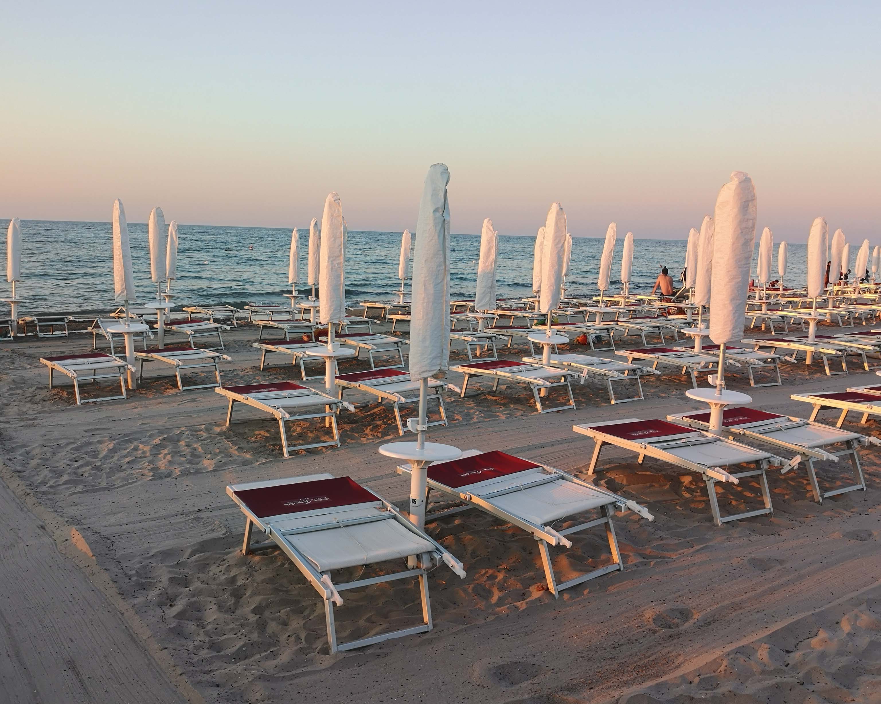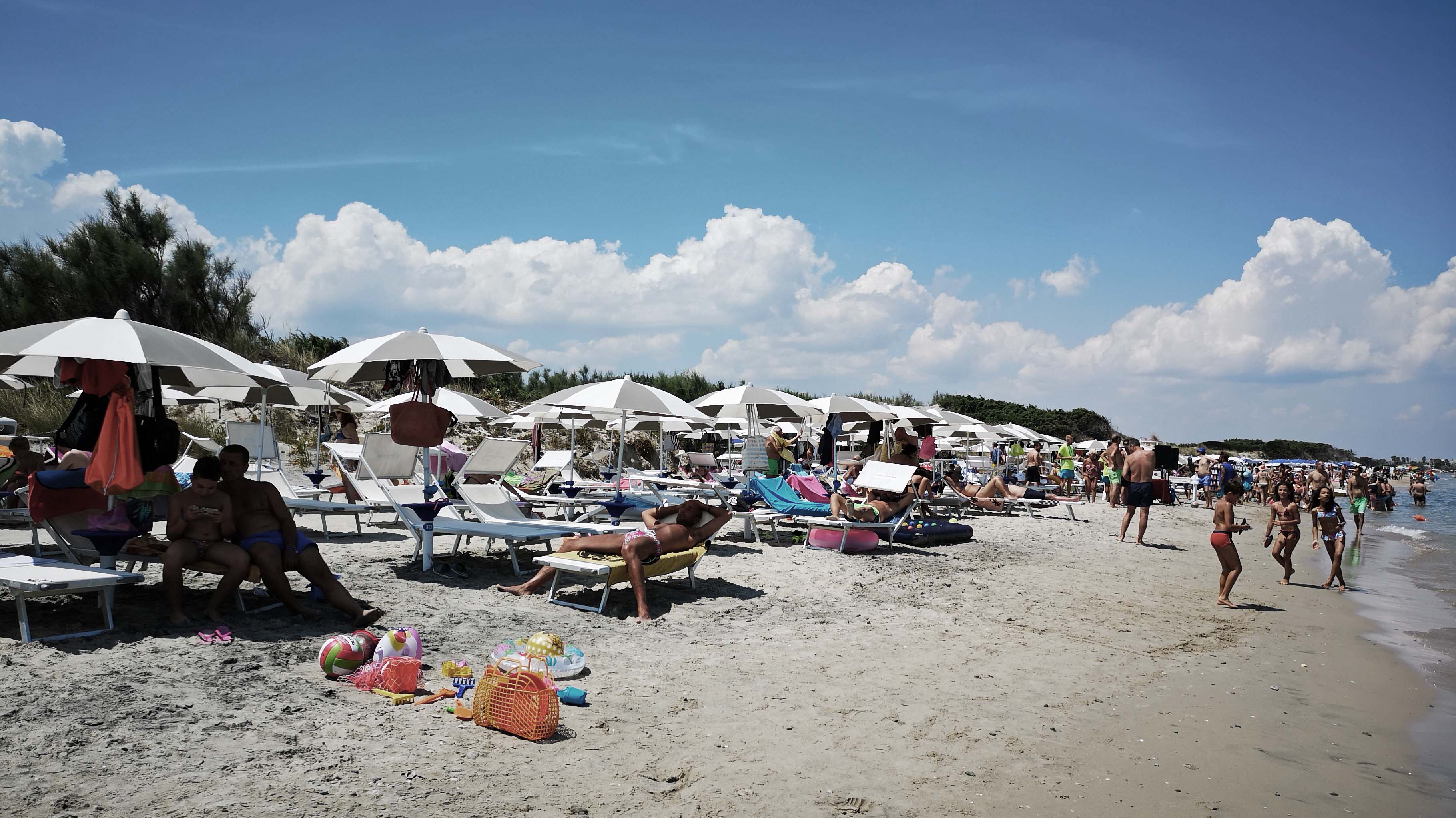 Der Strand ist schmal, liegt hinter einem Dünengürtel und ist durch das aufgewühlte Meer der vergangenen Tage voll mit Seetang. Geräumt wird offensichtlich nicht, alles bleibt so ‚natürlich‘ wie möglich. Ich wähle die rechte Seite der Badebucht, um der kreischenden Animation zu entgehen. Dann reihe ich mich in die Spaziergänger ein, um an der Badebucht entlangzulaufen. Ich bin langsamer, als die meisten Italiener. Ich habe das Gefühl, sie laufen vor irgendwas weg. Dabei wird palavert, was das Zeug hält. Ein ‚Ciao‘ hier, ein ‚Ciao‘ da, Bacci hier und Bacci da.